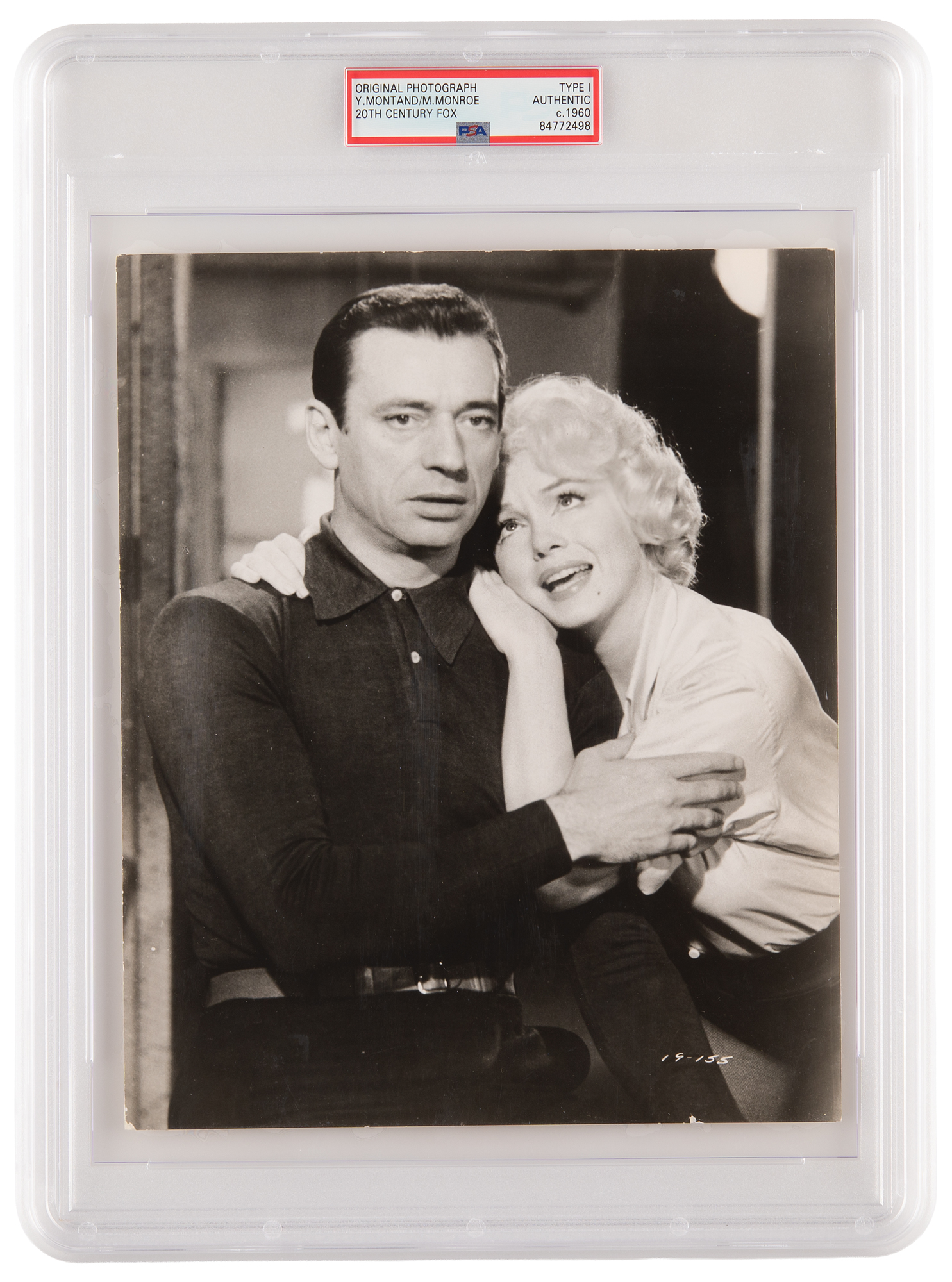 Original vintage glossy 7.5 x 9.25 studio photo of Marilyn Monroe leaning on the shoulder of her co-star, Yves Montand, during a scene in the musical comedy Let's Make Love, which was released by 20th Century Fox on September 8, 1960. In fine condition, with tastefully trimmed edges. Encapsulated by PSA as an authentic 'Type I' photograph, circa 1960.