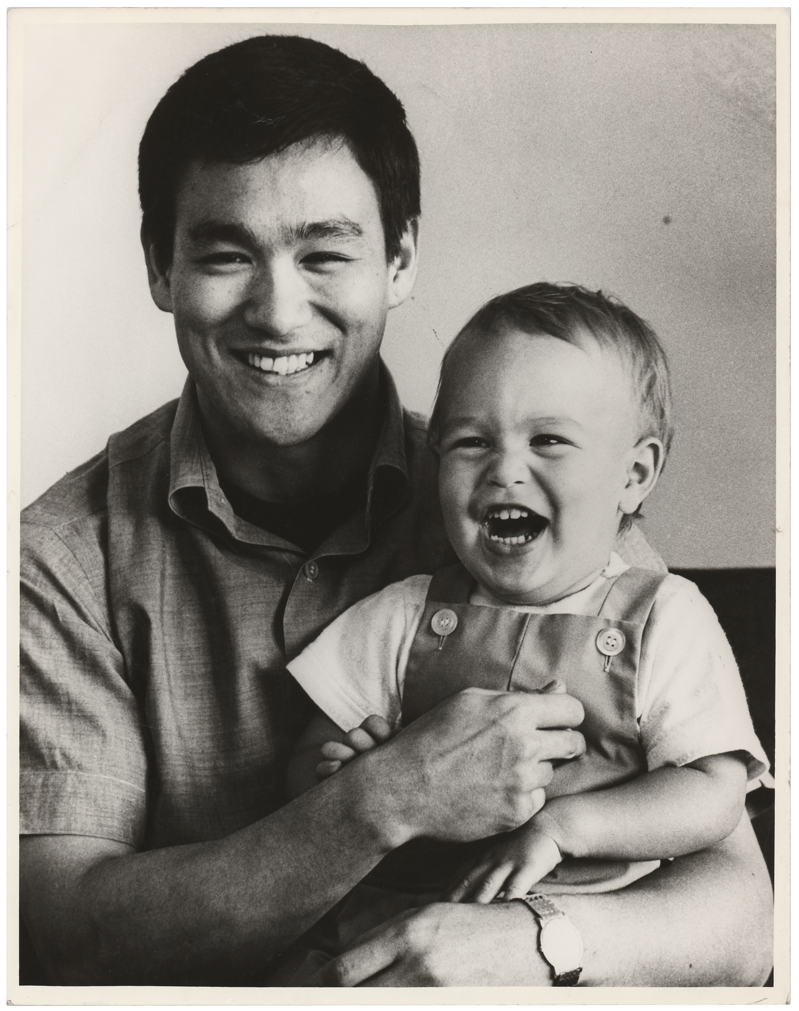 Original vintage glossy 11 x 14 photo of Bruce Lee with his toddler son, Brandon, laughing on his knee, circa 1967. The reverse bears faded "This Paper Manufactured by Kodak" watermarks. In very good condition, with scattered creasing, heaviest to the upper background area. Bruce Lee's son, Brandon Lee (1965-1993), followed in his father's footsteps as an actor and martial artist, making his own impact in Hollywood before his untimely death on the set of the film The Crow.