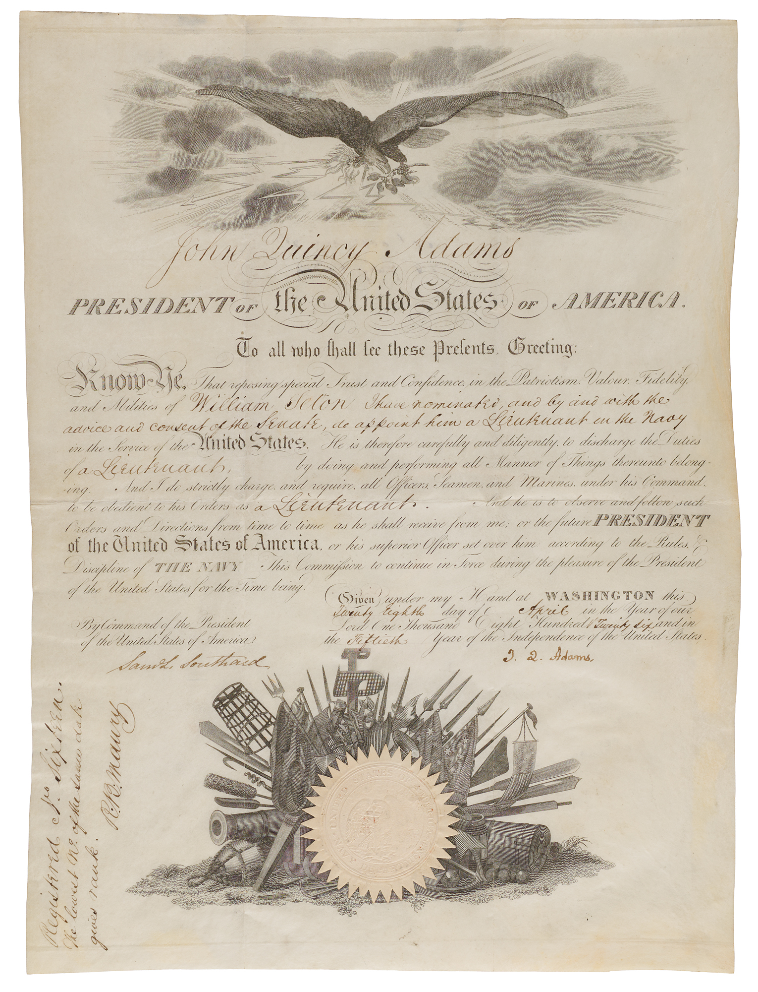 Partly-printed vellum DS as president, signed “J. Q. Adams,” one page, 13.5 x 18.25, April 28, 1826. President Adams, "by and with the advice and consent of the Senate," appoints William Seton as "a Lieutenant in the Navy in the service of the United States." Signed at the conclusion in ink by President John Quincy Adams, and countersigned by Secretary of the Navy Samuel Southard. The white Navy Department seal affixed at the bottom remains intact. In fine condition, with adhesive residue to reverse.