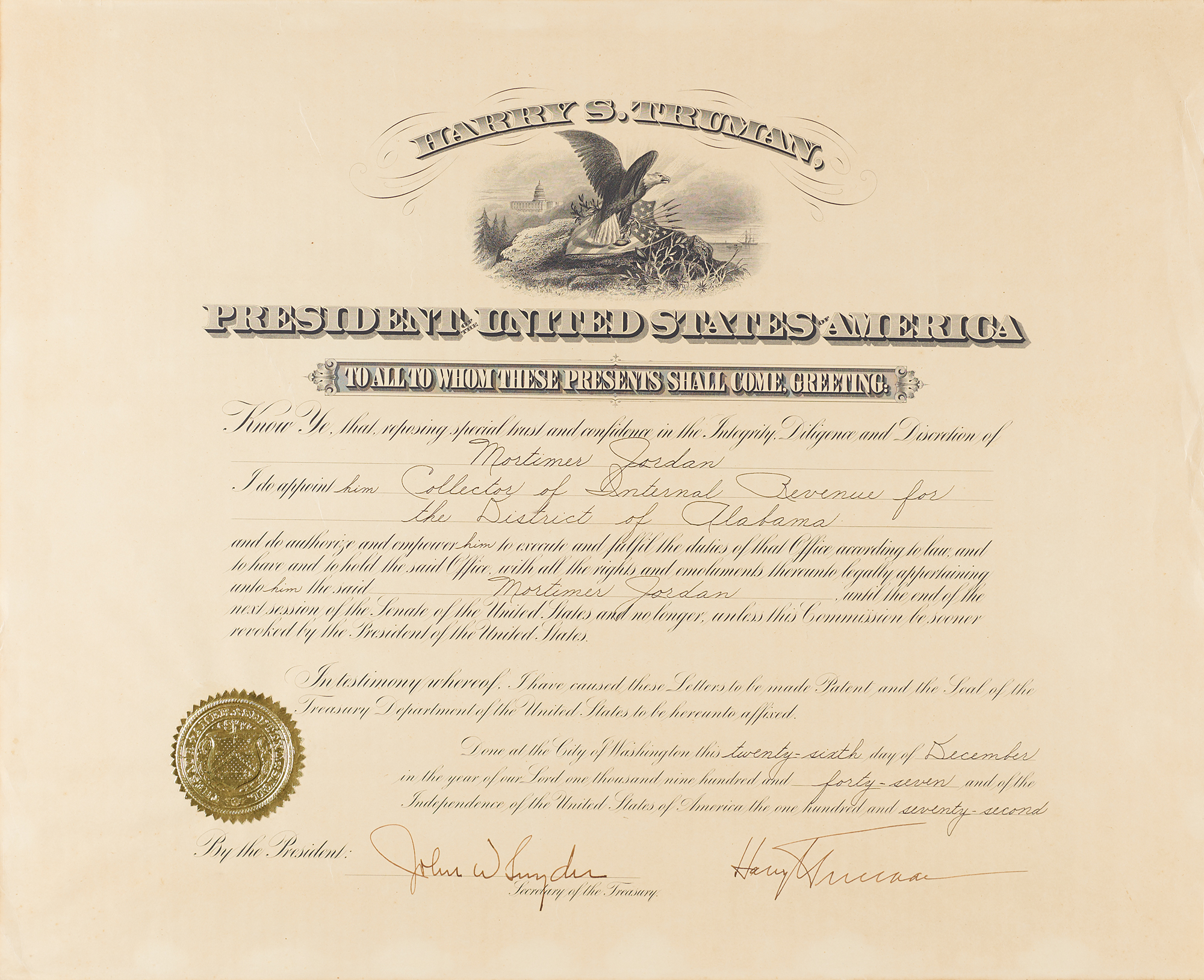 Partly-printed DS as president, one page, 19.5 x 16, December 26, 1947. President Truman appoints Mortimer Jordan as "Collector of Internal Revenue for the District of Alabama." Neatly signed at the conclusion in ink by President Harry S. Truman, and countersigned by Secretary of the Treasury John W. Snyder. The gold foil seal affixed at the lower left remains intact. In fine condition, with slightly irregular light toning.