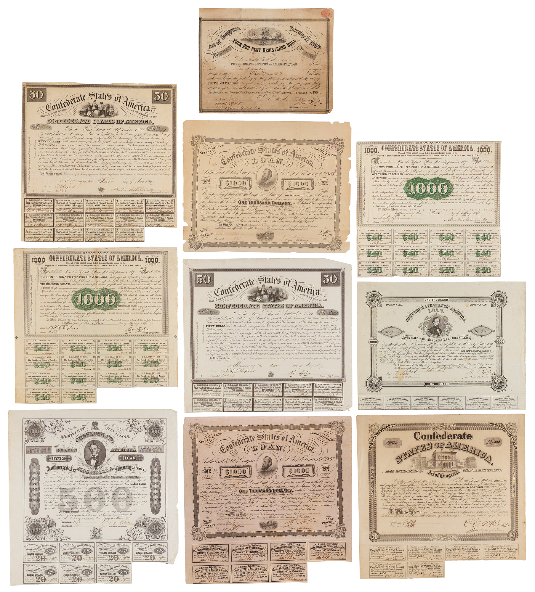 Collection of ten Confederate bonds, ranging in date from May 1, 1861, to February 17, 1864, many with original coupons still attached. Several boast interesting pictorial vignettes, including portraits of Stonewall Jackson and Jefferson Davis, a naval engagement, and allegorical scenes. In overall very good to fine condition.