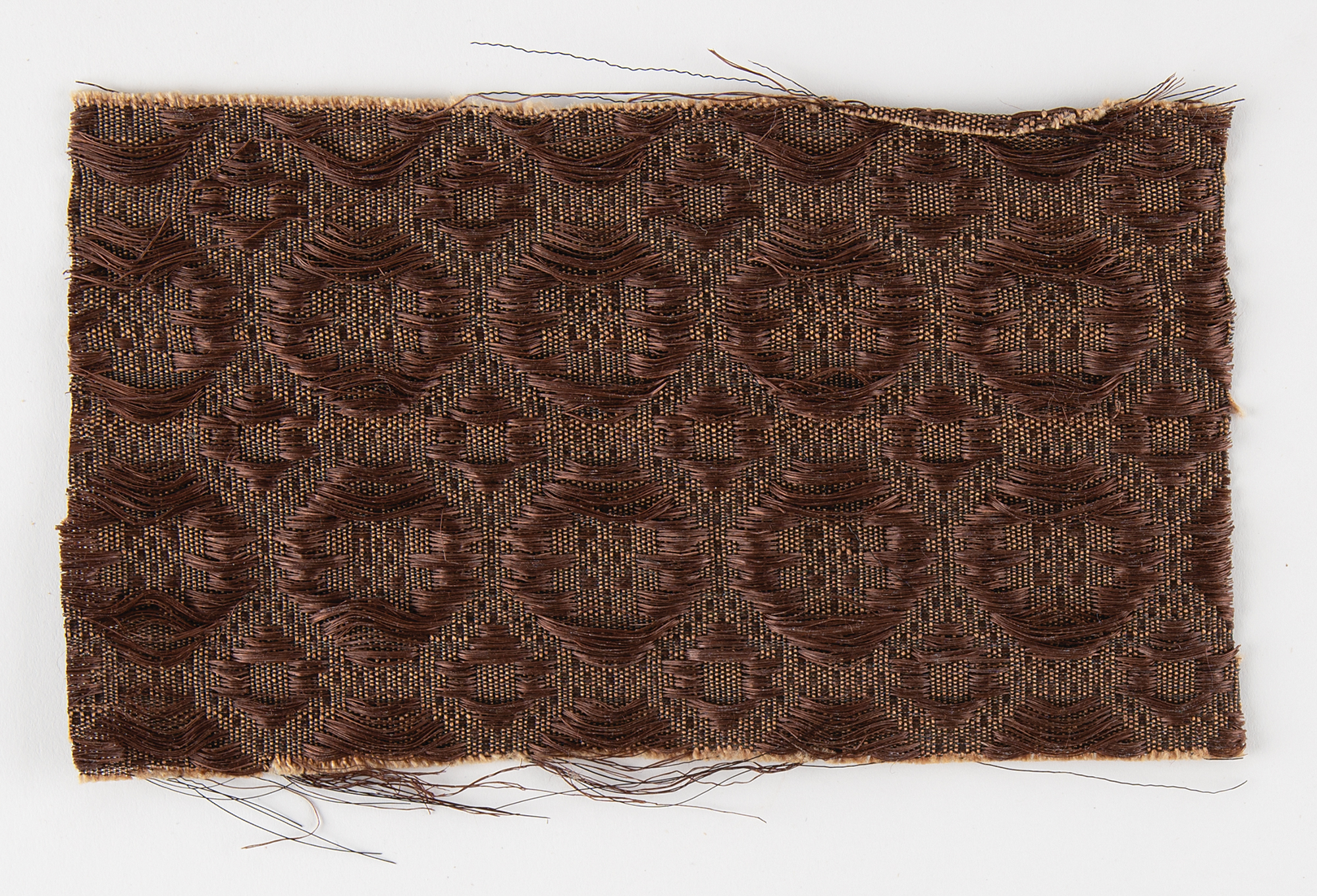 Attractive 7.5 x 4.25 swatch of brown embroidered sofa fabric, left over from the restoration of the White House overseen by First Lady Jacqueline Kennedy. In very fine condition.