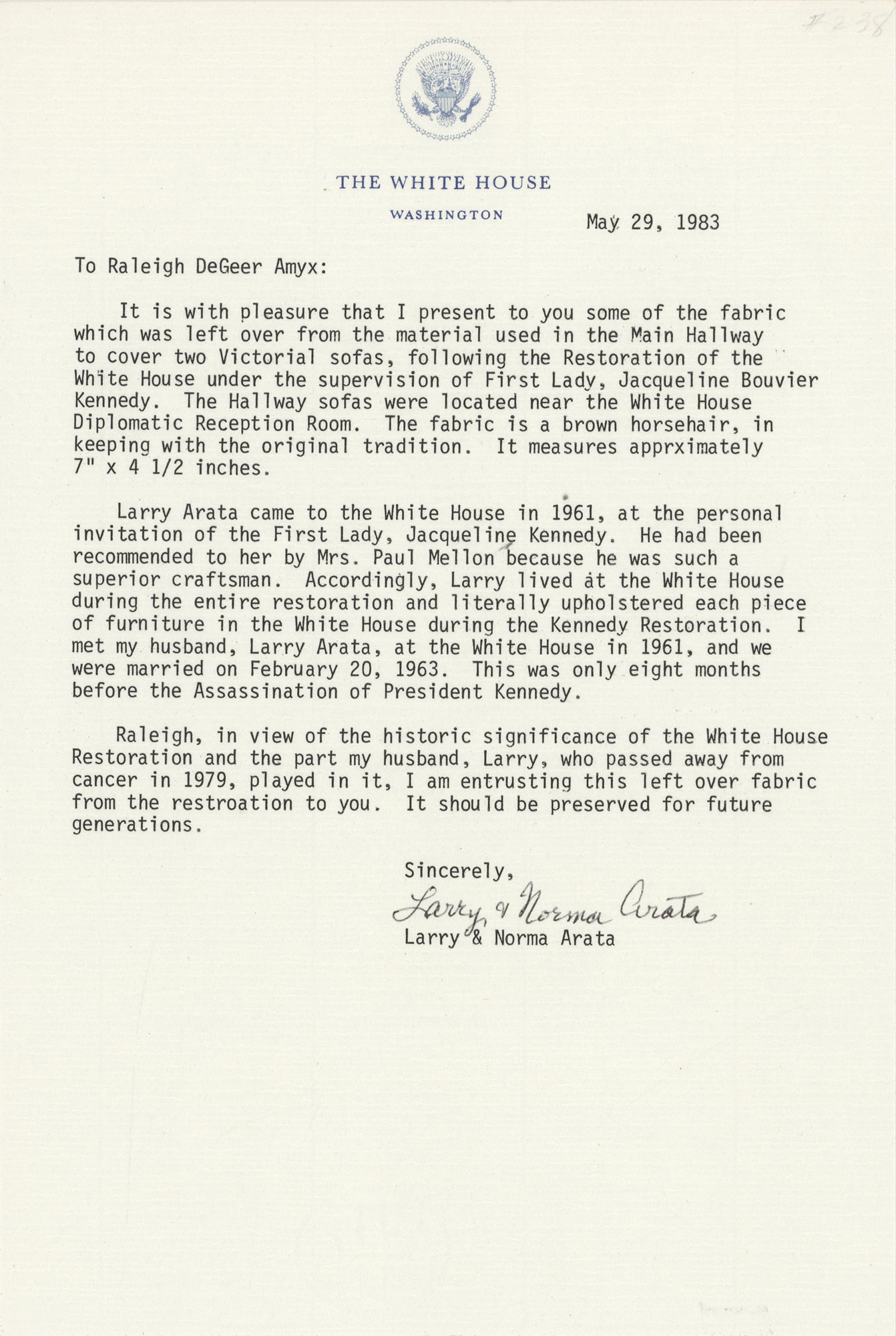 Larry Arata came to the White House in 1961, at the personal invitation of the First Lady, Jacqueline Kennedy. He had been recommended to her by Mrs. Paul Mellon because he was such a superior craftsman. Accordingly, Larry lived at the White House during the entire restoration and literally upholstered each piece of furniture in the White House during the Kennedy Restoration. I met my husband, Larry Arata, at the White House in 1961, and we were married on February 20, 1963. This was only eight months before the Assassination of President Kennedy."