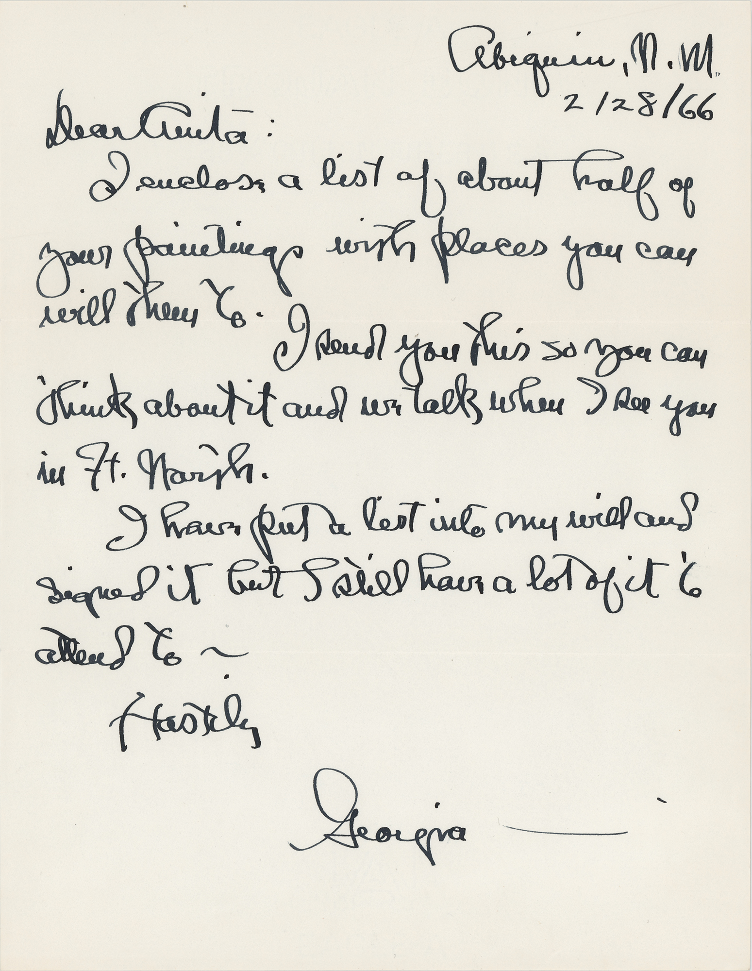 ALS signed “Georgia,” one page, 8.5 x 11, February 26, 1966. Handwritten letter to "Anita," most likely her longtime friend Anita Pollitzer. In part: "I enclose a list of about half of your paintings with places you can will them to. I send you this so you can think about it and we talk when I see you…I have put a list into my will and signed it but I still have a lot to attend to." In very fine condition.