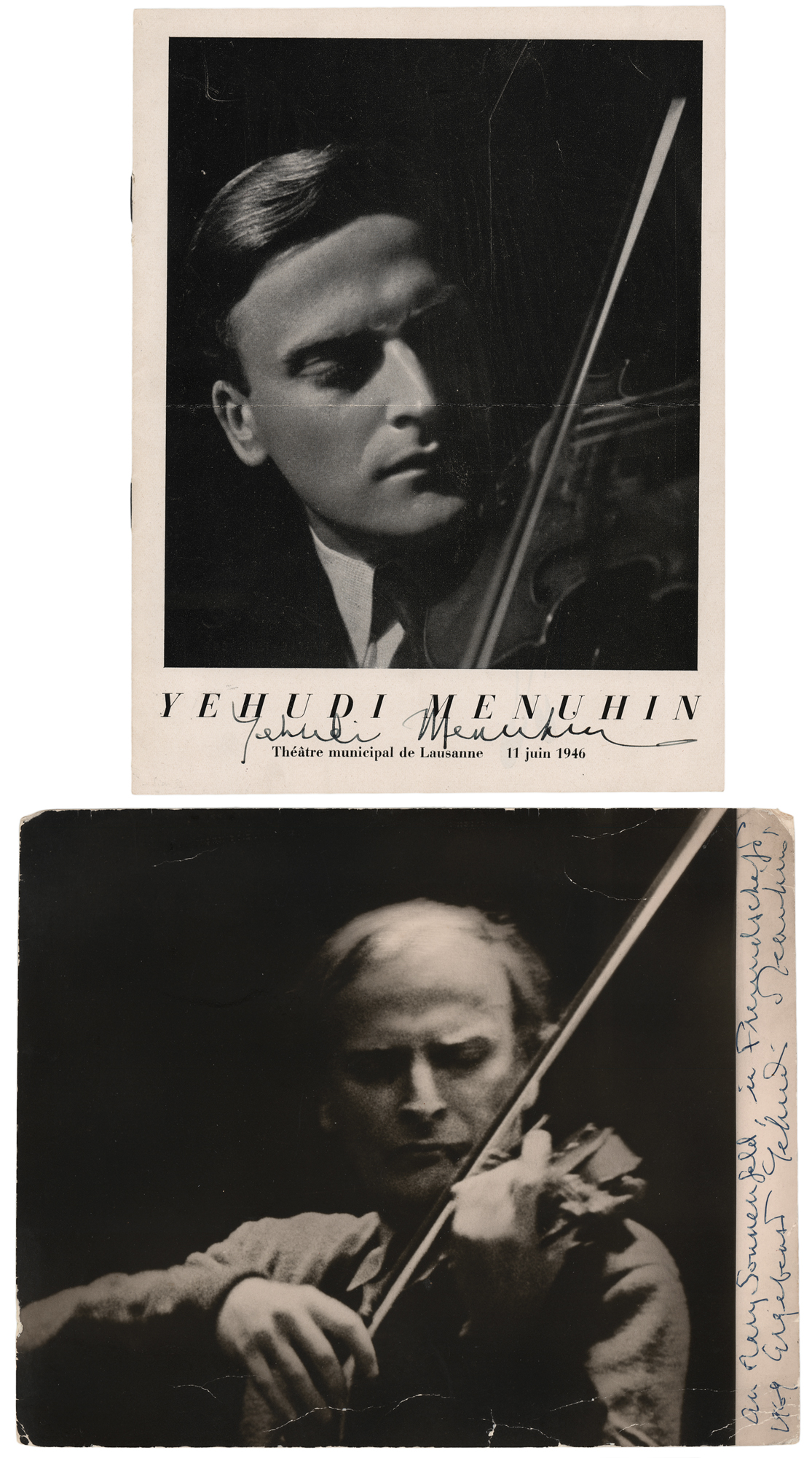 Two items signed by the great violinist: a program for Yehudi Menuhin at the Theatre Municipal de Lausanne on June 11, 1946, signed on the front cover in fountain pen by Menuhin; and a matte-finish 9.25 x 7.75 photo of Menuhin bowing his violin, signed and inscribed in the right border in blue ballpoint by Menuhin. In overall very good to fine condition, with creasing to the photo, and a central horizontal fold to the program.