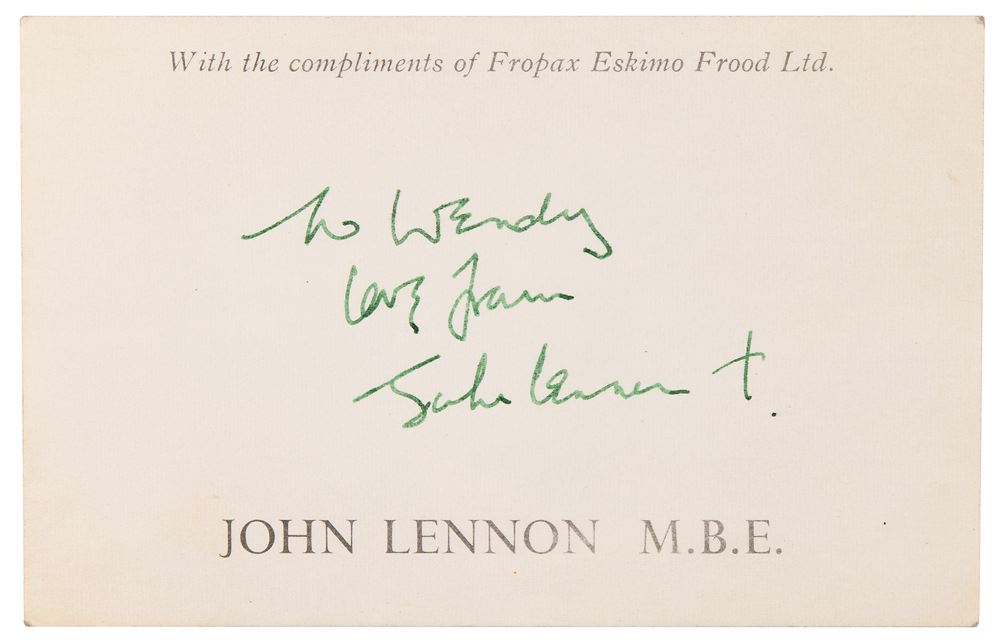The consignor notes that the recipient was English actress Wendy Richard, best known for her television roles as Miss Shirley Brahms on the BBC sitcom Are You Being Served?, and as Pauline Fowler on the soap opera EastEnders. Richard appeared in the Beatles’ second film, Help!, but her scene was later cut from the released version.