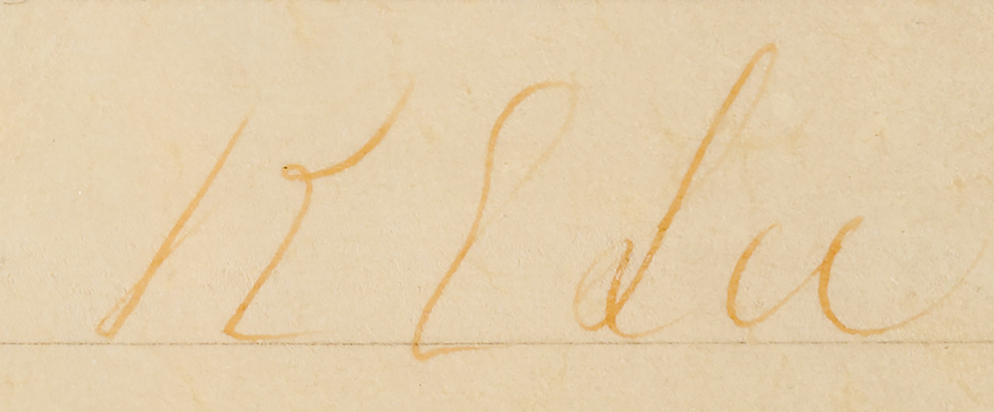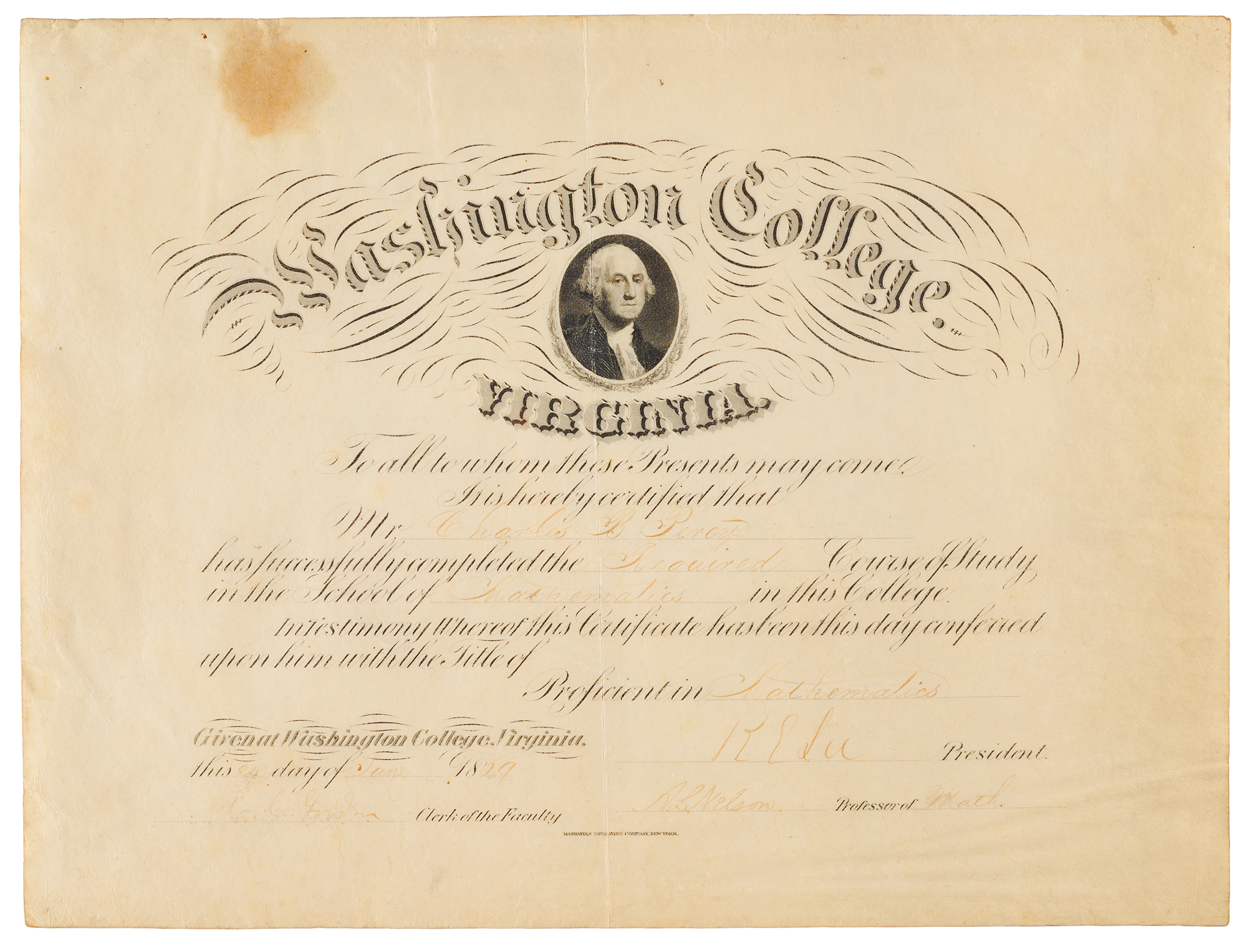 Partly-printed vellum DS, signed “R. E. Lee,” one page, 11.5 x 9, June 24, 1869. Washington College certificate awarded to Charles B. Percy, stating that he "has successfully completed the required course of study in the School of Mathematics in this College. In testimony whereof this Certificate has been this day conferred upon him with the Title of Proficient in Mathematics." Signed at the conclusion in ink by Robert E. Lee as president of the college, and countersigned by a clerk and professor. In very good to fine condition, with a stain near the top edge, creasing to the lower right corner area, and all of the handwritten portions, including Lee's signature, light but legible.