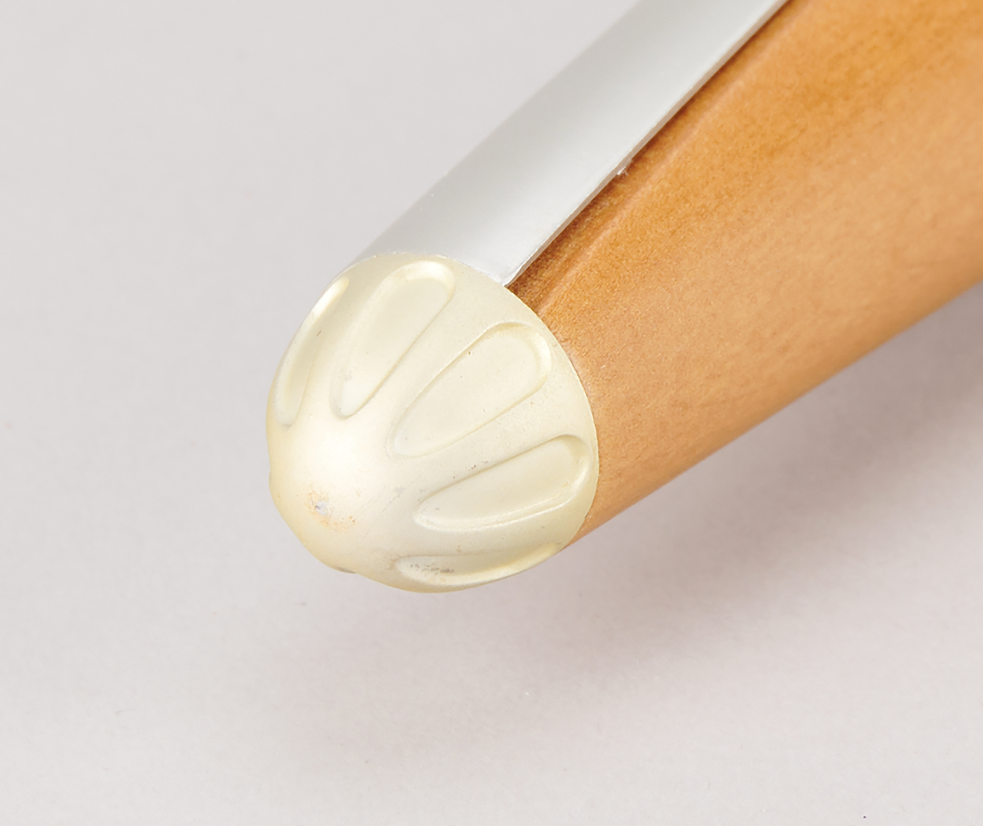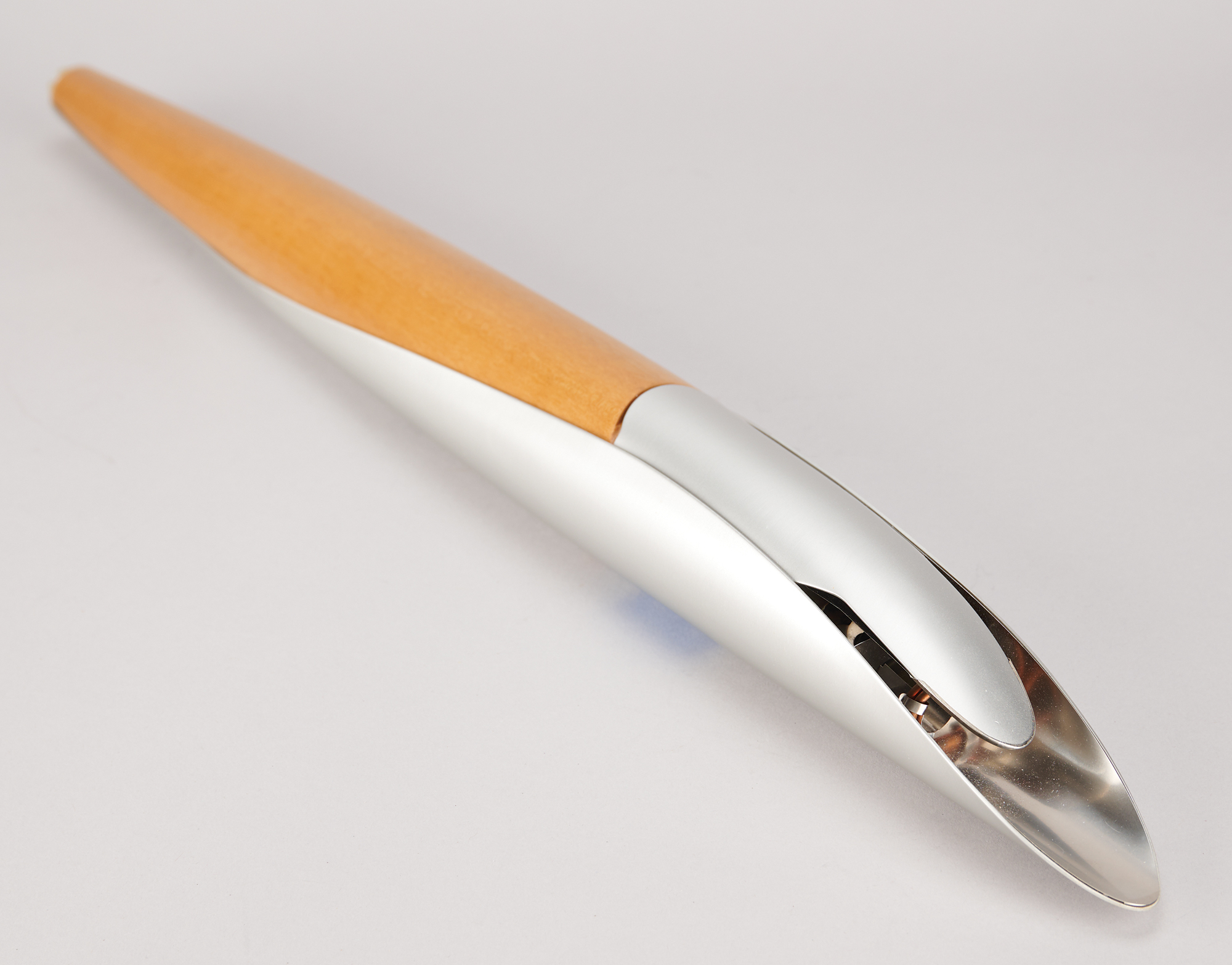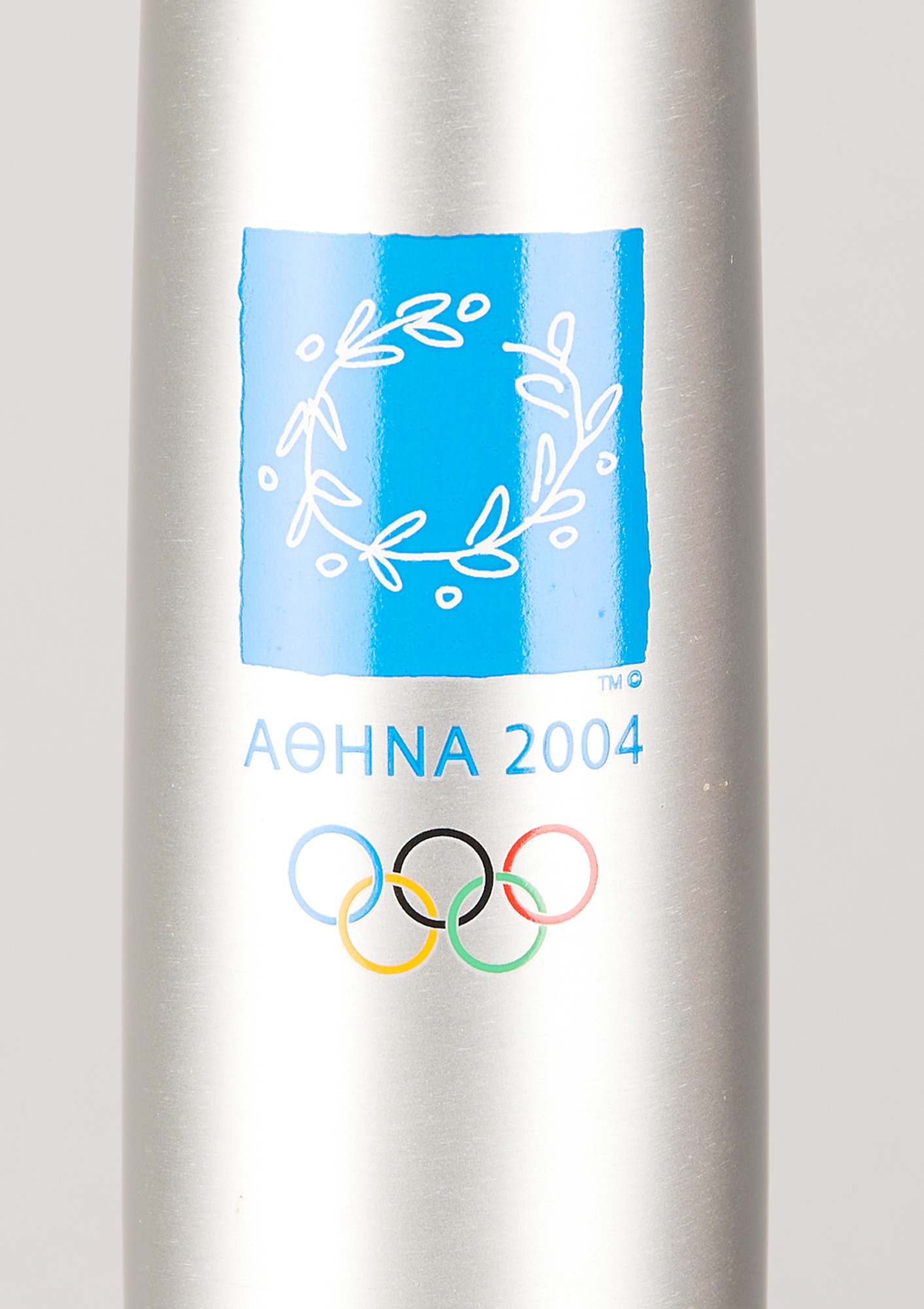 Official 2004 Athens Summer Olympics torch, constructed of aluminum and olive wood, measuring 25.75″ in length and 2.25″ at its widest point, designed by Andreas Varotsos and manufactured by GA & L Harrington. The torch was modeled to reflect the simple and congruous lines of an olive tree leaf, with the union of wood and metal evoking the different colors found on either side of the leaf, and the ergonomic design representing the extension of the moving flame. The front of the aluminum sheath bears the Olympic rings and the Athens emblem.
