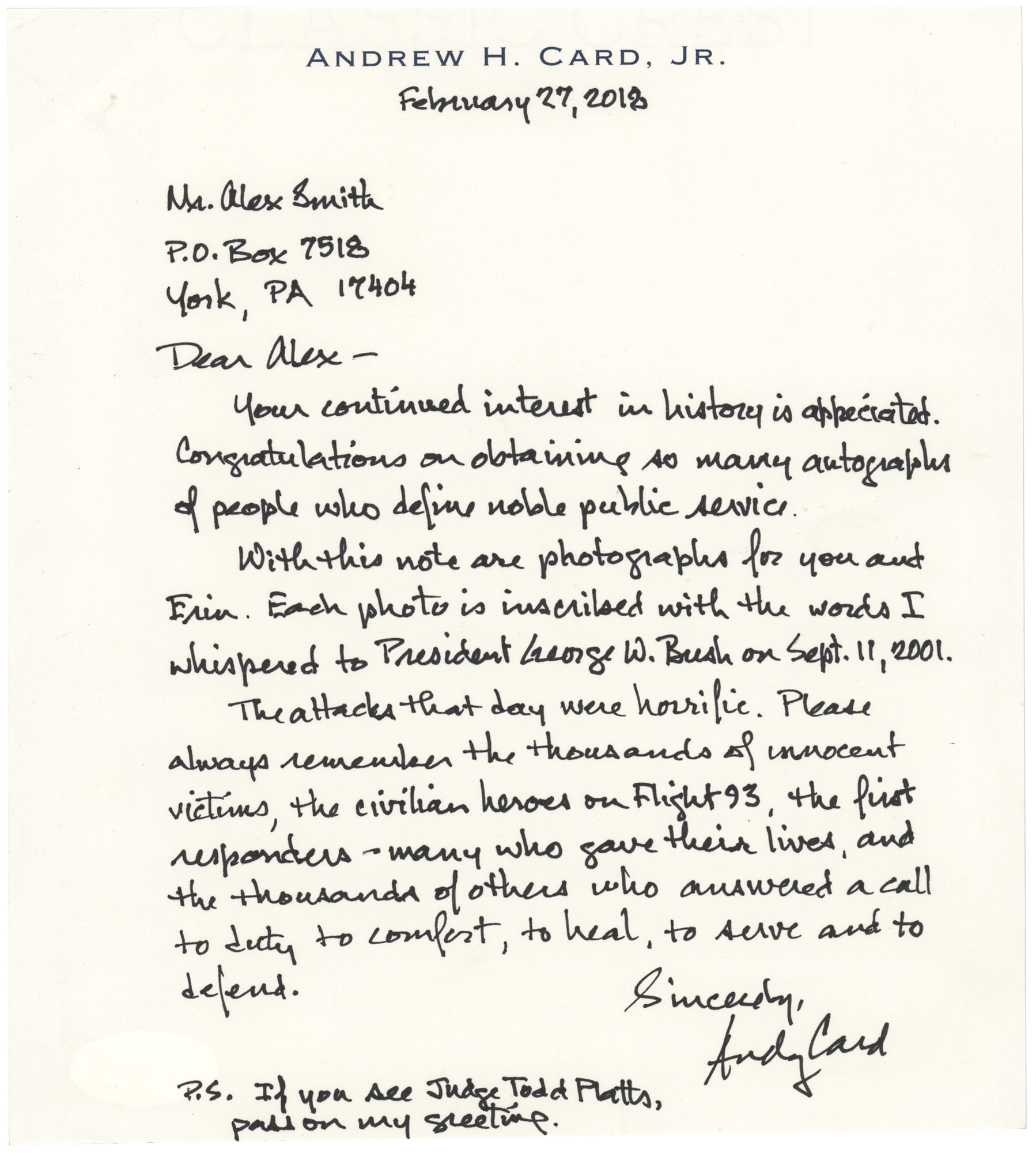 ALS, one page, 6.75 x 7.5, personal letterhead, February 27, 2018. Handwritten letter to Alex Smith, in full: “Your continued interest in history is appreciated. Congratulations on obtaining so many autographs of people who define noble public service. With this note are photographs for you and Erin. Each photo is inscribed with the words I whispered to President George W. Bush on Sept. 11, 2001. The attacks that day were horrific. Please always remember the thousands of innocent victims, the civilian heroes on Flight 93, the first responders — many who gave their lives, and the thousands of others who answered a call to duty to comfort, to heal, to serve and to defend.” Card adds a postscript: “P.S. If you see Judge Todd Platts, pass on my greeting.” In fine condition, with a light crease to the upper left corner. Accompanied by a certificate of authenticity from JSA.