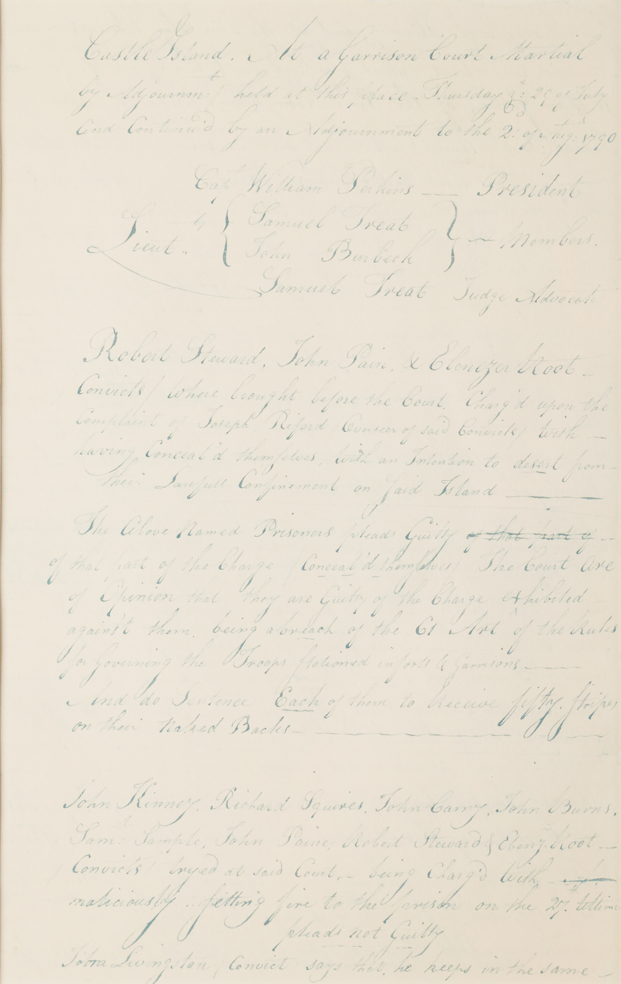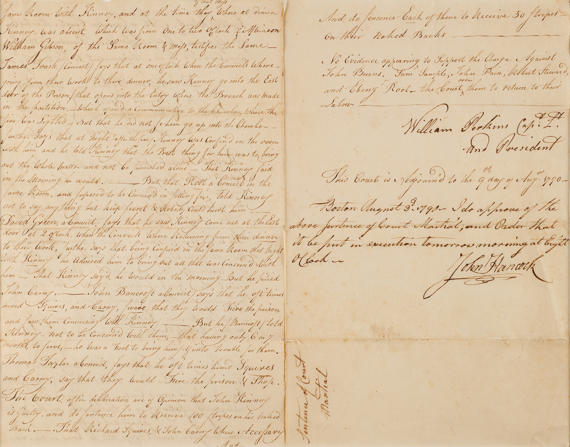 John Hancock Document Signed, Endorsing Castle Island Court Martial Sentences for a Prison Arsonist and Would-Be Escapees