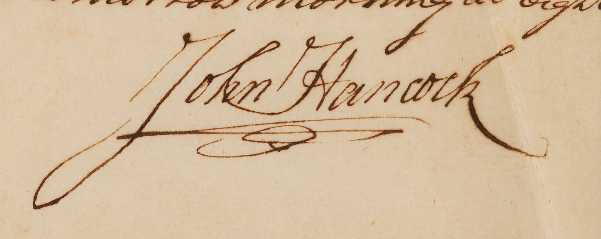 Manuscript DS, signed "John Hancock," three pages on two adjoining sheets, 7.5 x 11.75, August 3, 1790. Castle Island court martial document outlining two separate cases, certified at the conclusion by John Hancock as governor of Massachusetts. In the first, three prisoners, Robert Stewared, John Pain, and Ebenezer Root, plead guilty to concealing themselves with intent to escape, their punishment being "fifty stripes on their naked Backs." In the second case, John Kinney, found guilty of setting fire to the prison, is sentenced to "100 stripes on his naked back." Hancock endorses a secretarial statement at the conclusion: "I do approve of the above sentence of Court martial, and Order that it be put into execution tomorrow morning at Eight O’Clock." Matted with a copy of the first page and an engraved portrait (featuring Hancock's facsimile signature) to an overall size of 38 x 18. In fine condition.