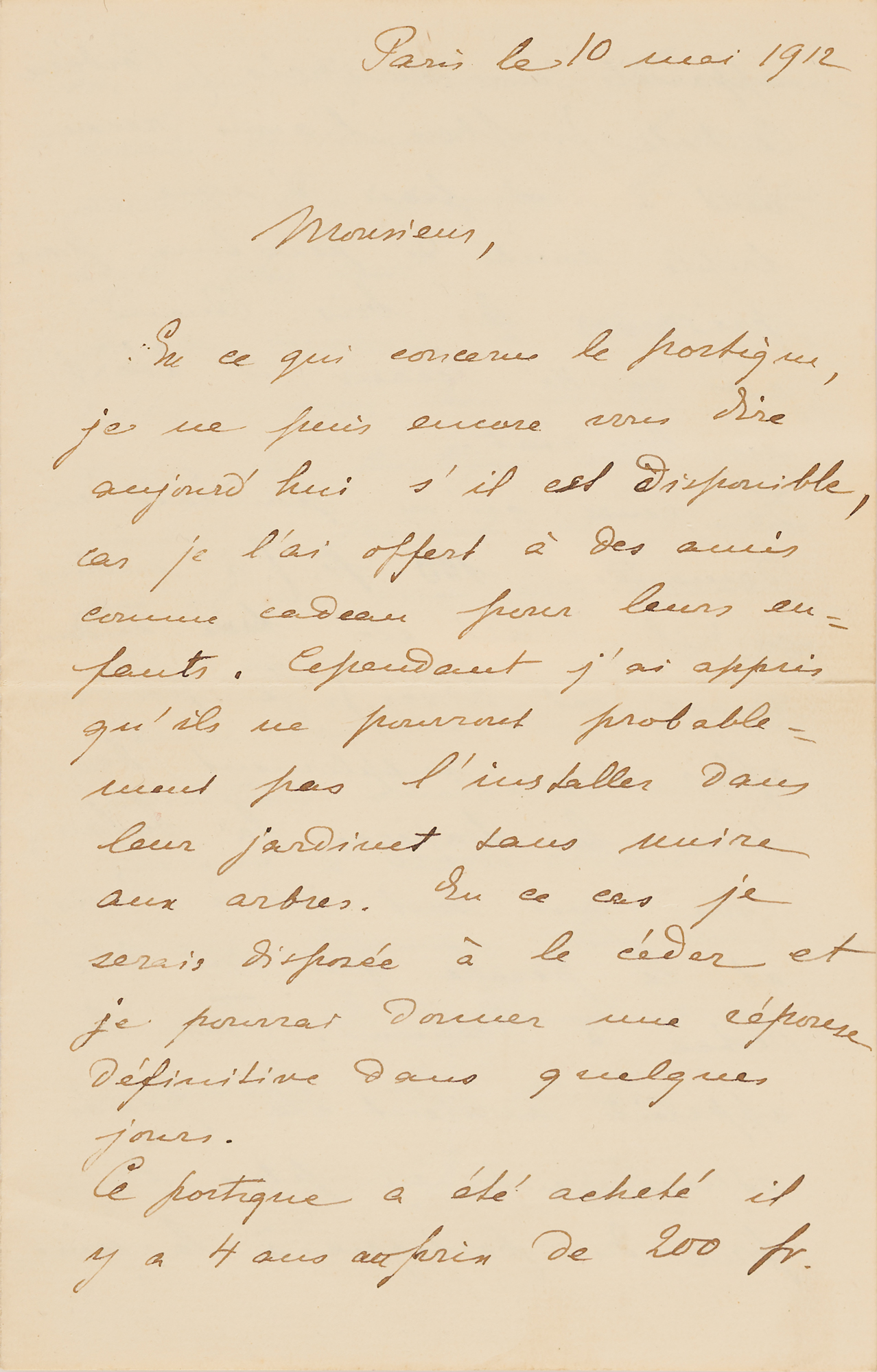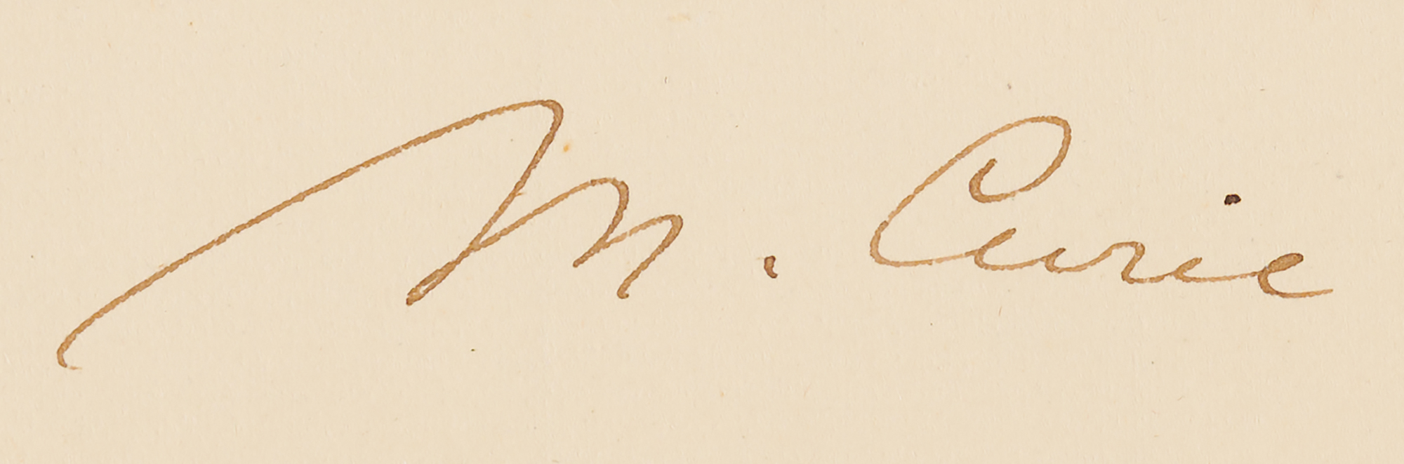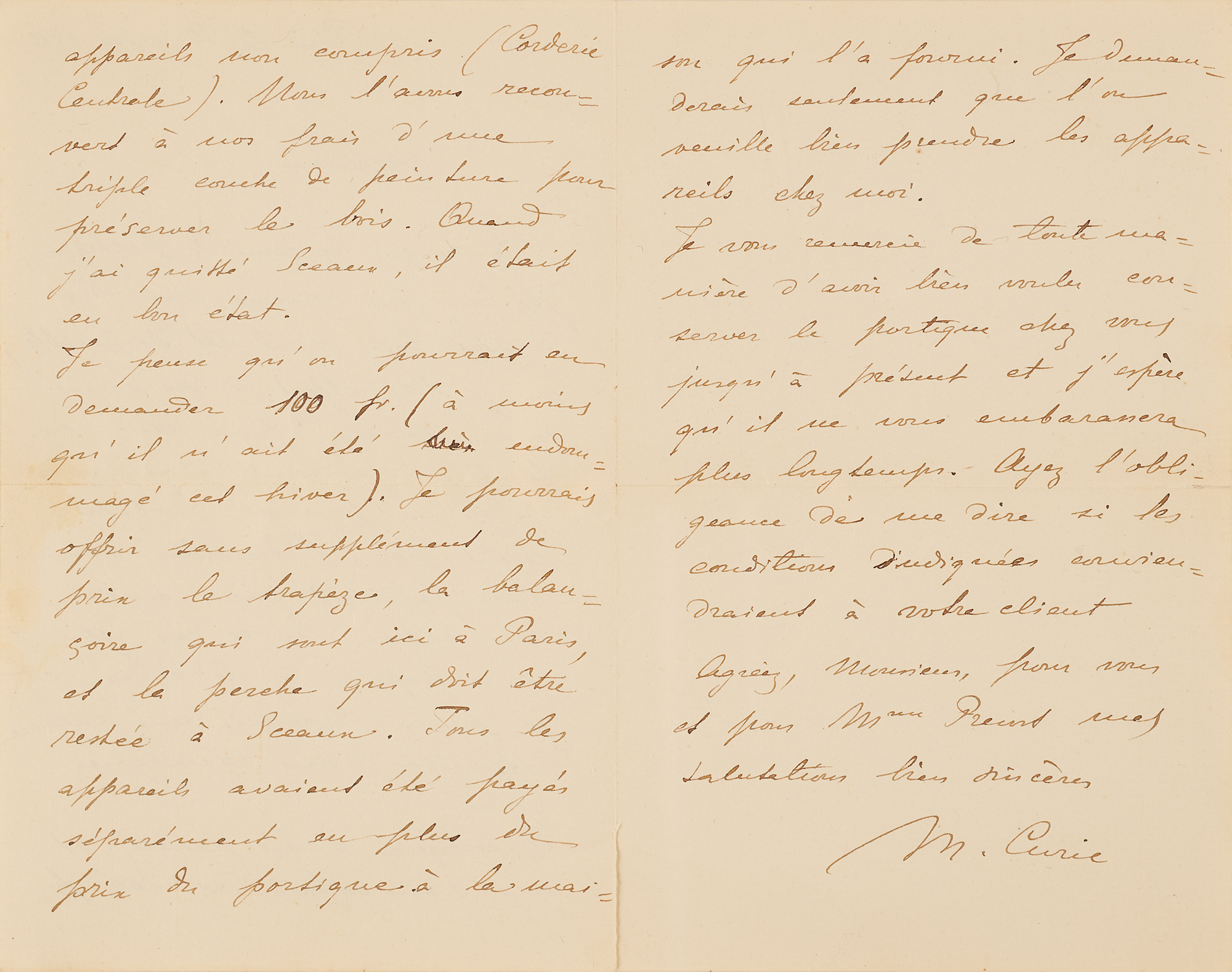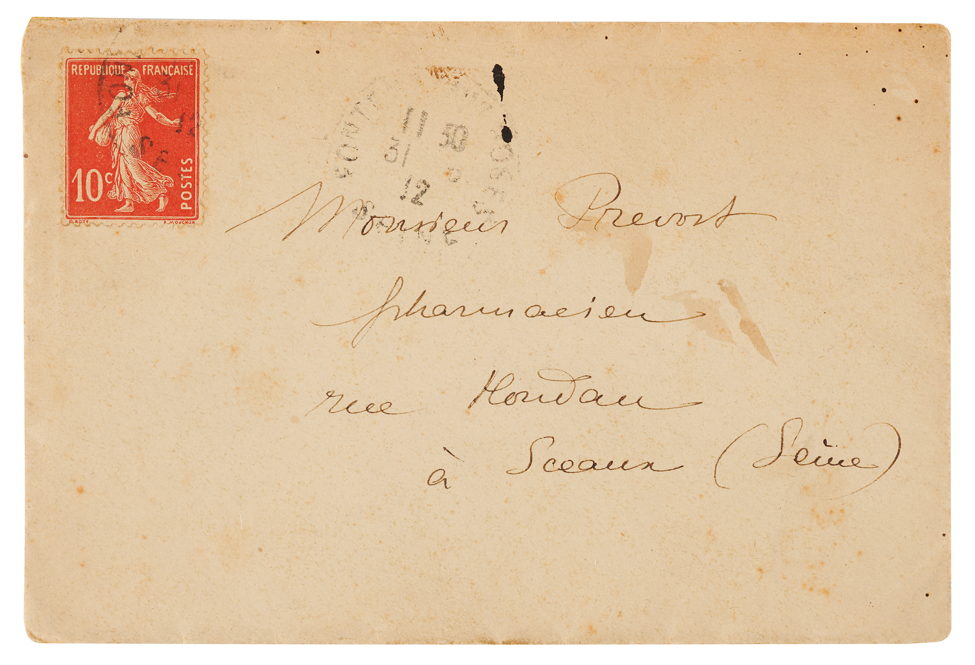 ALS in French, signed “M. Curie,” three pages on two adjoining sheets, 4.5 x 7, May 10, 1912, roughly six months after becoming the first person to win a Nobel Prize twice. Addressed from Paris, an untranslated handwritten letter from Marie Curie to a “Monsieur Prevost,” a pharmacist in Sceaux, France, relating to the rental contract for her home and discussing some necessary repairs or work on the property. In fine condition. Accompanied by the original mailing envelope hand-addressed by Curie.