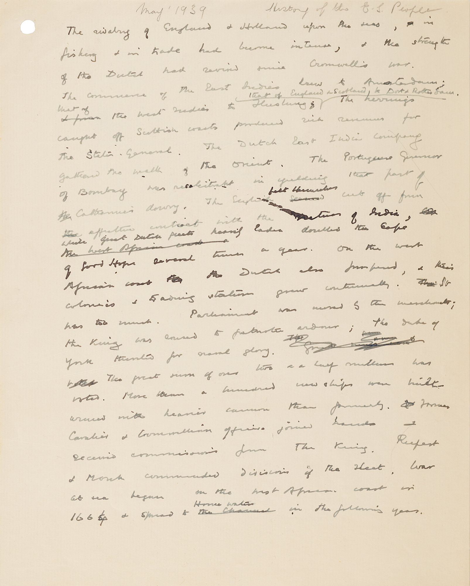 Skilled as a writer, orator, and historian, Churchill would receive the Nobel Prize in Literature in 1953 'for his mastery of historical and biographical description as well as for brilliant oratory in defending exalted human values.' These working manuscript pages come from one of Churchill’s most ambitious and long-gestating literary projects. A History of the English-Speaking Peoples was primarily conceived and largely written during his 'wilderness years' in the late 1930s, heavily interrupted by World War II, and finally published between 1956 and 1958. The ambitious, comprehensive work covers the period from the Roman conquest of Britain in 55 B.C. to the beginning of the First World War.