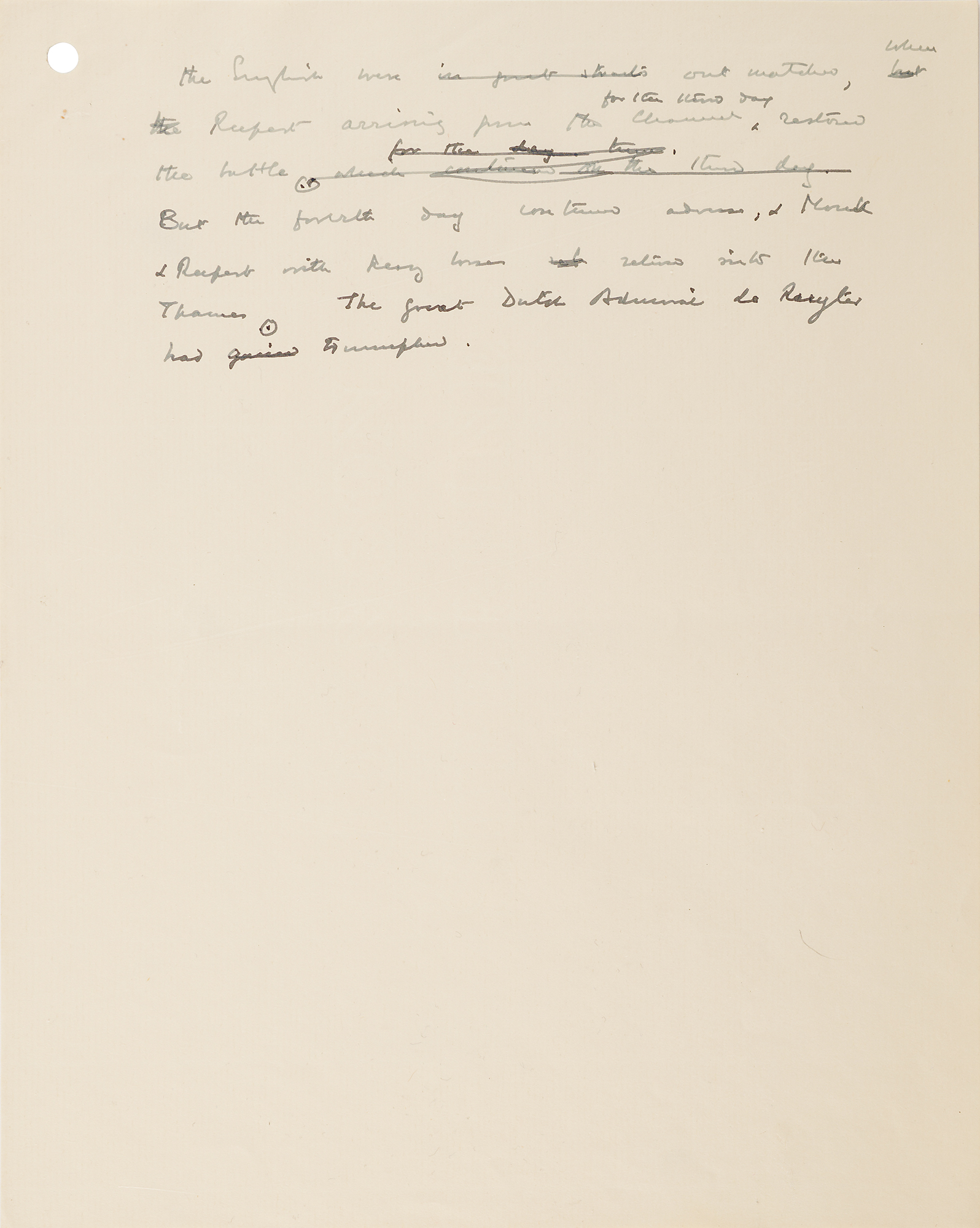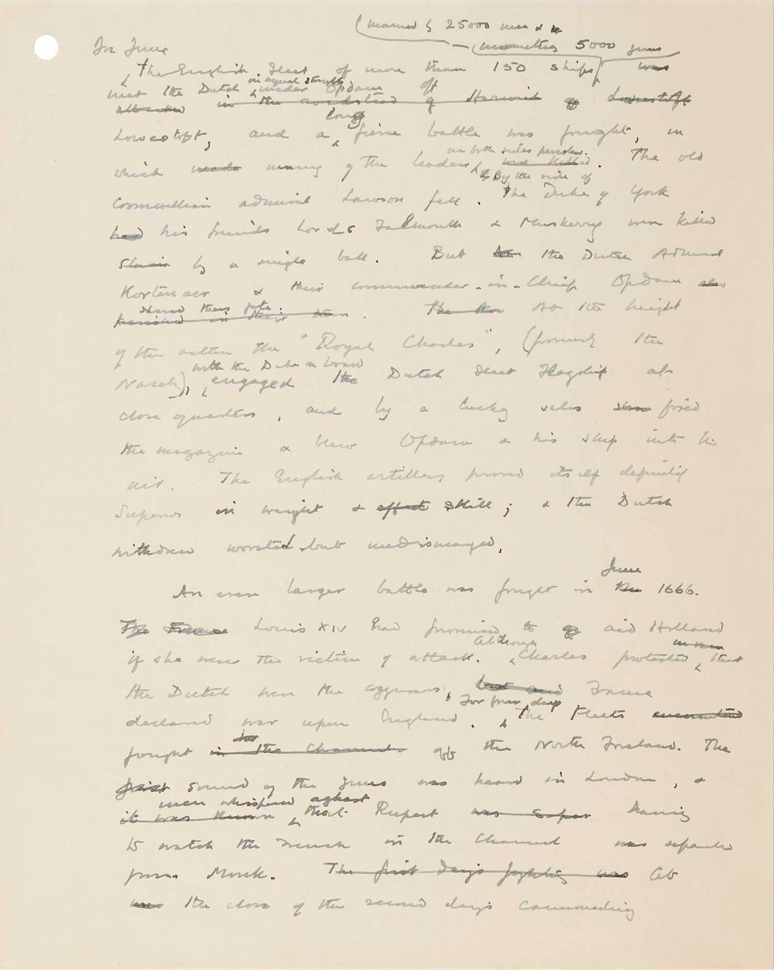 The English were out matched, when Rupert arriving from the Channel for the third day, restored the battle. But the fourth day continued adverse, & Monk & Rupert with heavy losses retired into the Thames. The great Dutch Admiral de Ruyter had triumphed." Churchill makes several revisions and corrections throughout the text. In fine condition.