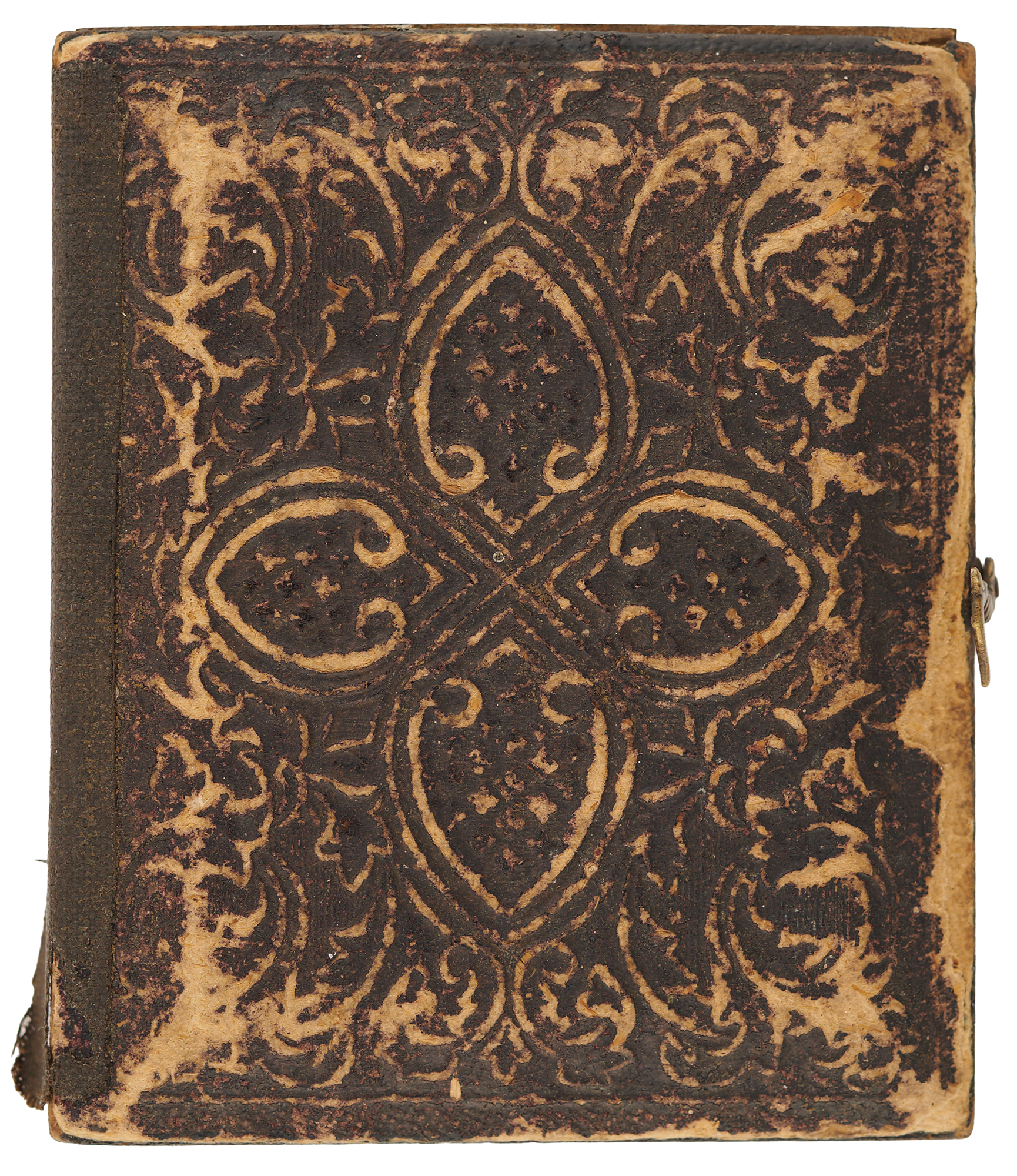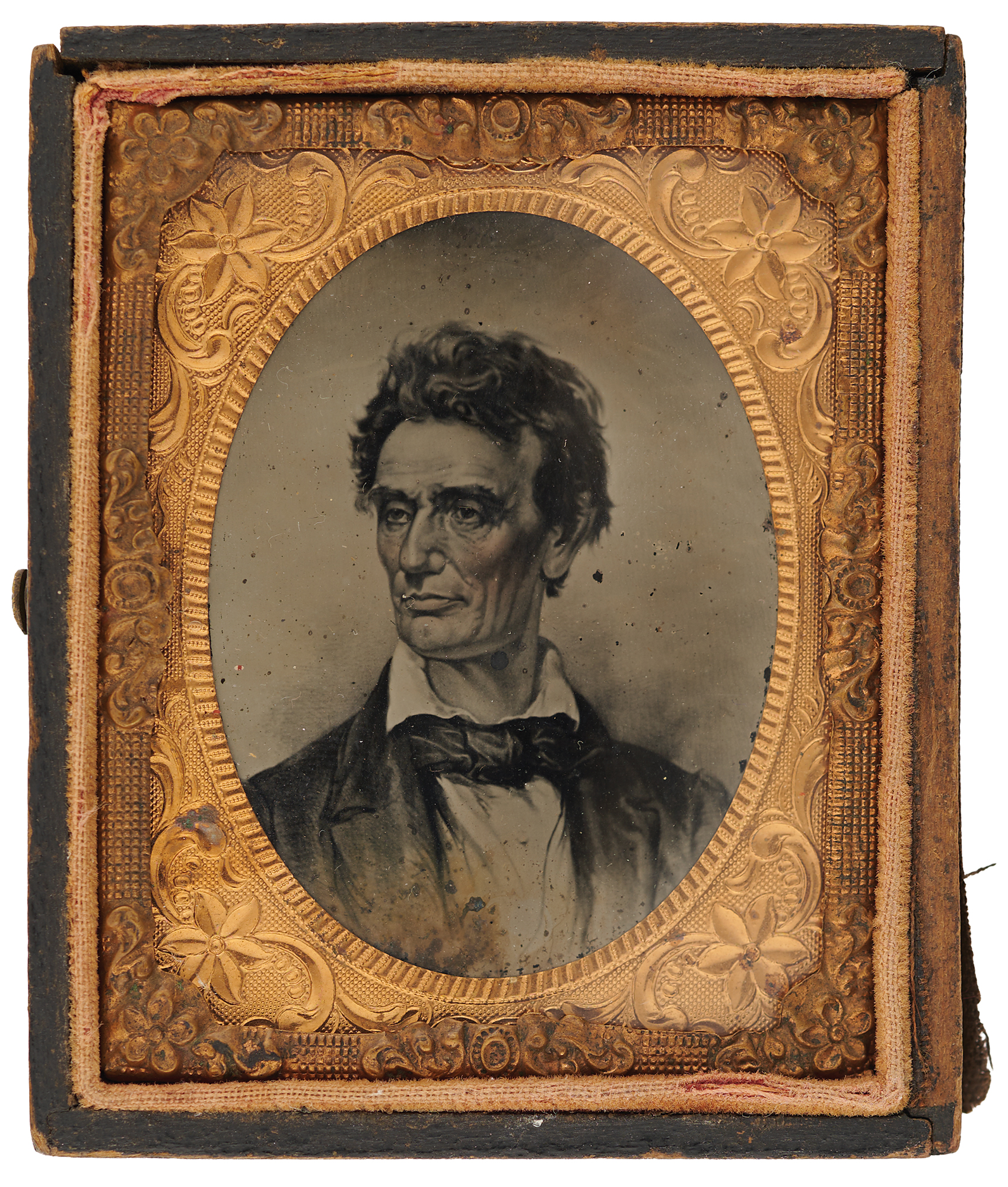 Scarce ninth plate ambrotype of an Abraham Lincoln photograph reproduced from a rare folio lithograph by Boston publisher J. H. Bufford, which was based on Charles A. Barry’s from-life pastel done in Springfield in June 1860. The lithograph itself is very rare and seldom appears at auction; unlike the lithograph, this ambrotype depicts Lincoln facing left. The ambrotype is presented within the left-side of a period embossed case; the right-side half is missing. In fine condition, with some spots of discoloration to the bottom, and some wear to the case.