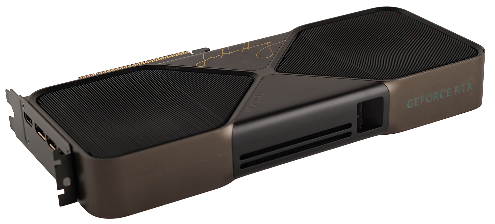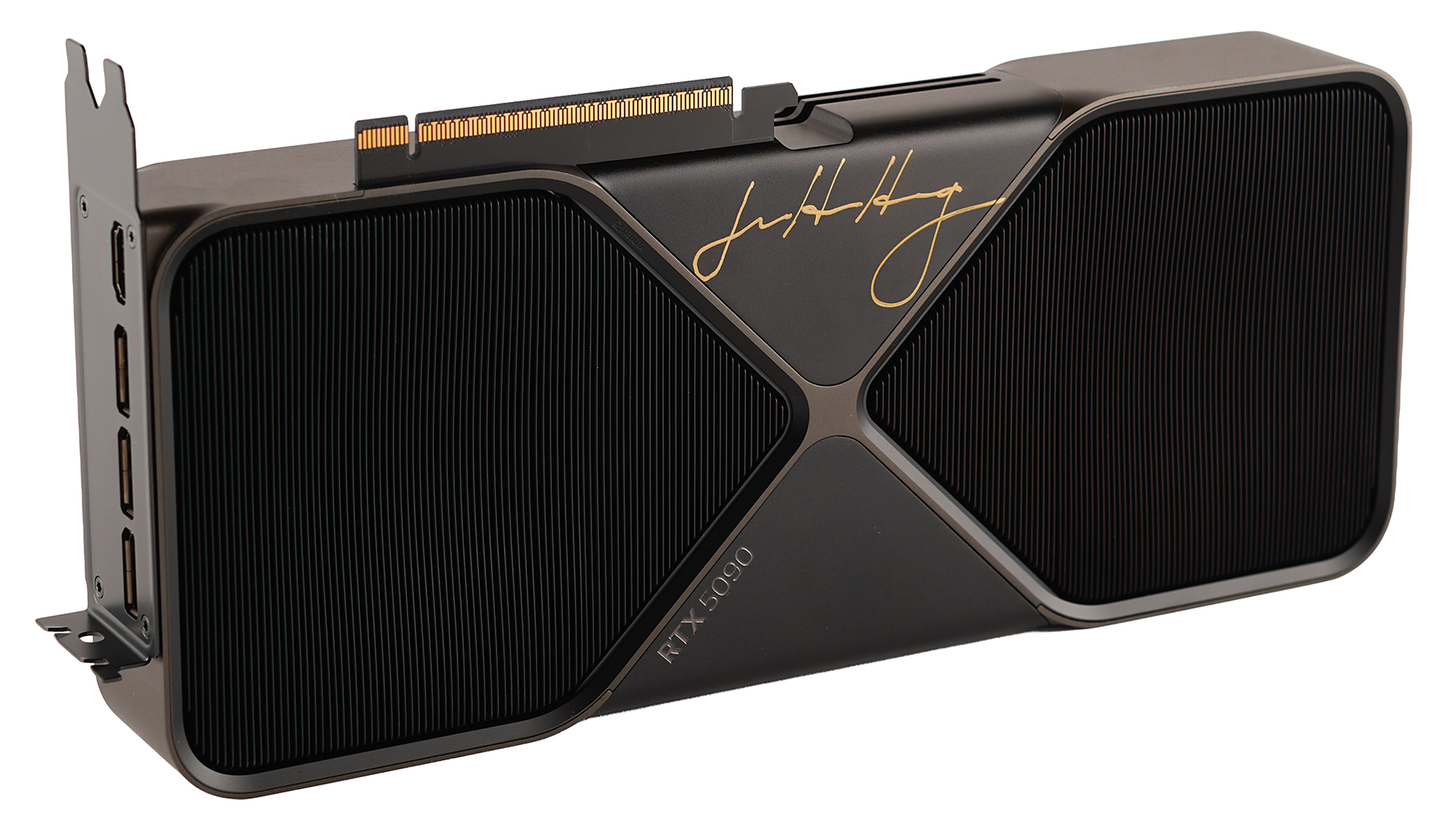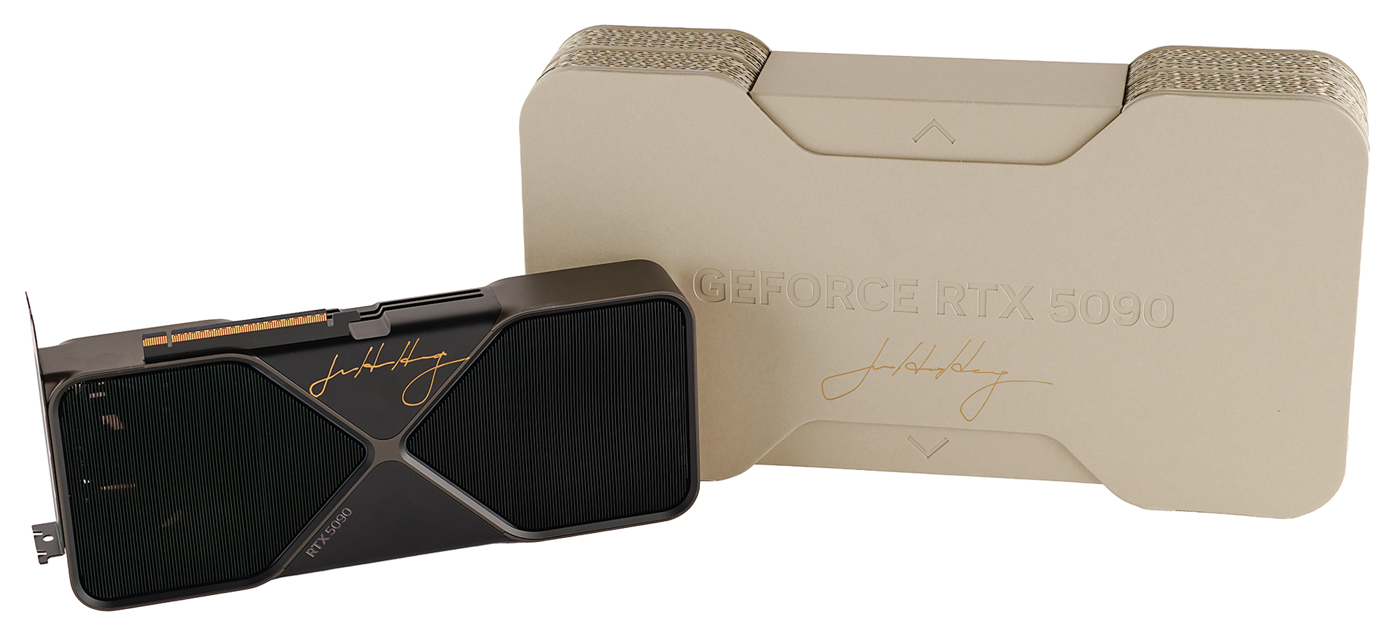 Extremely desirable NVIDIA GeForce RTX 5090 'Founders Edition' graphics card in its original packaging, signed on the package top in gold ink, "Jensen Huang," and on the metal housing of the card itself in gold ink, "Jensen Huang." Housed in its original shipping box, measuring 18˝ x 11.25˝ x 5.25˝. In very fine condition. Representing the latest in GPU technology, the GeForce RTX 5090 carries an MSRP of $2000 and is sold out virtually everywhere.