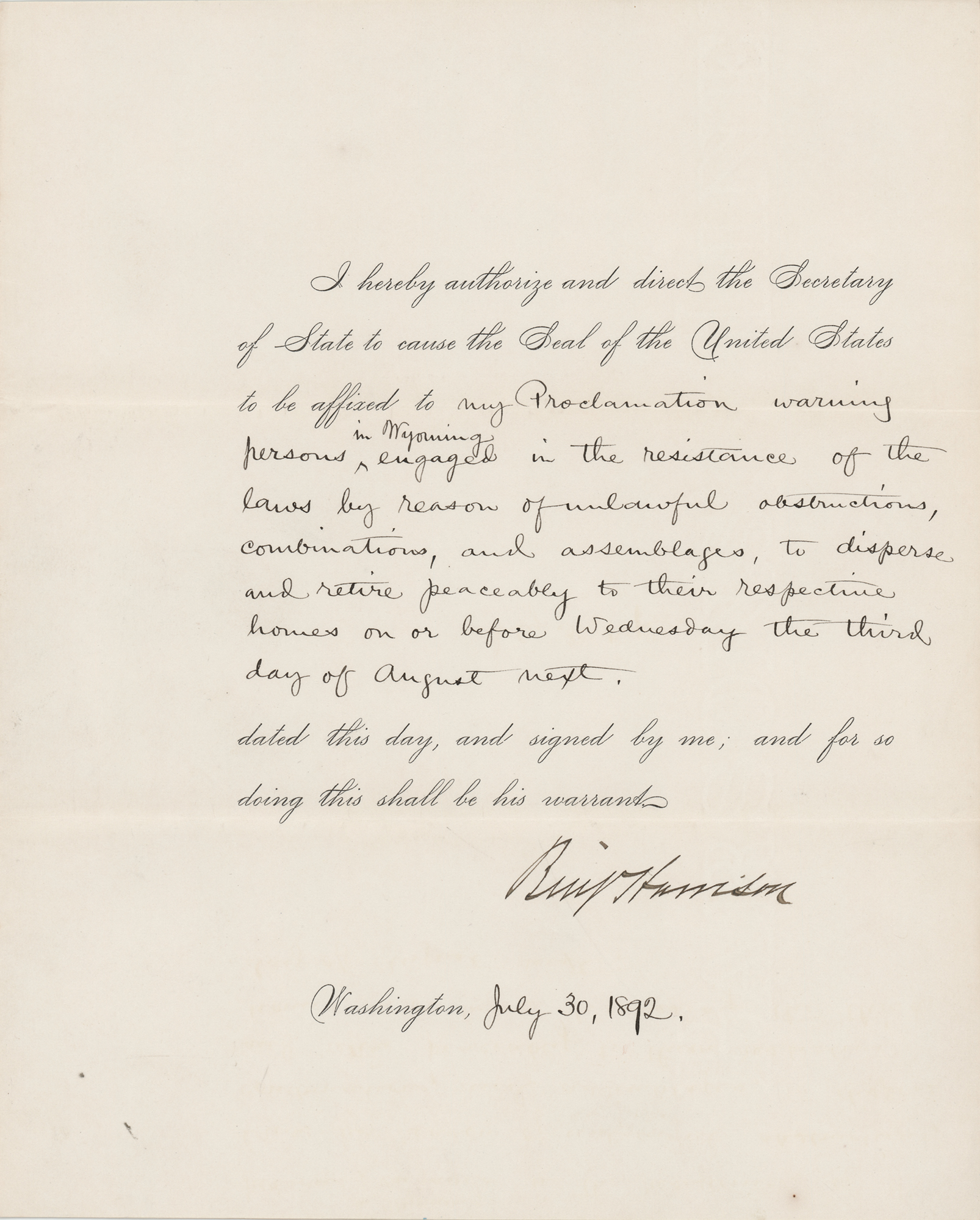Partly-printed DS as president, signed “Benj. Harrison,” one page, 8 x 10, July 30, 1892. President Harrison authorizes and directs the Secretary of State to cause the Seal of the United States to be affixed to "my Proclamation warning persons in Wyoming in the resistance of the laws by reason of unlawful obstructions, combinations, and assemblages, to disperse and retire peaceably to their respective homes on or before Wednesday the third day of August next." Boldly signed at the conclusion in ink by President Benjamin Harrison. In fine condition.