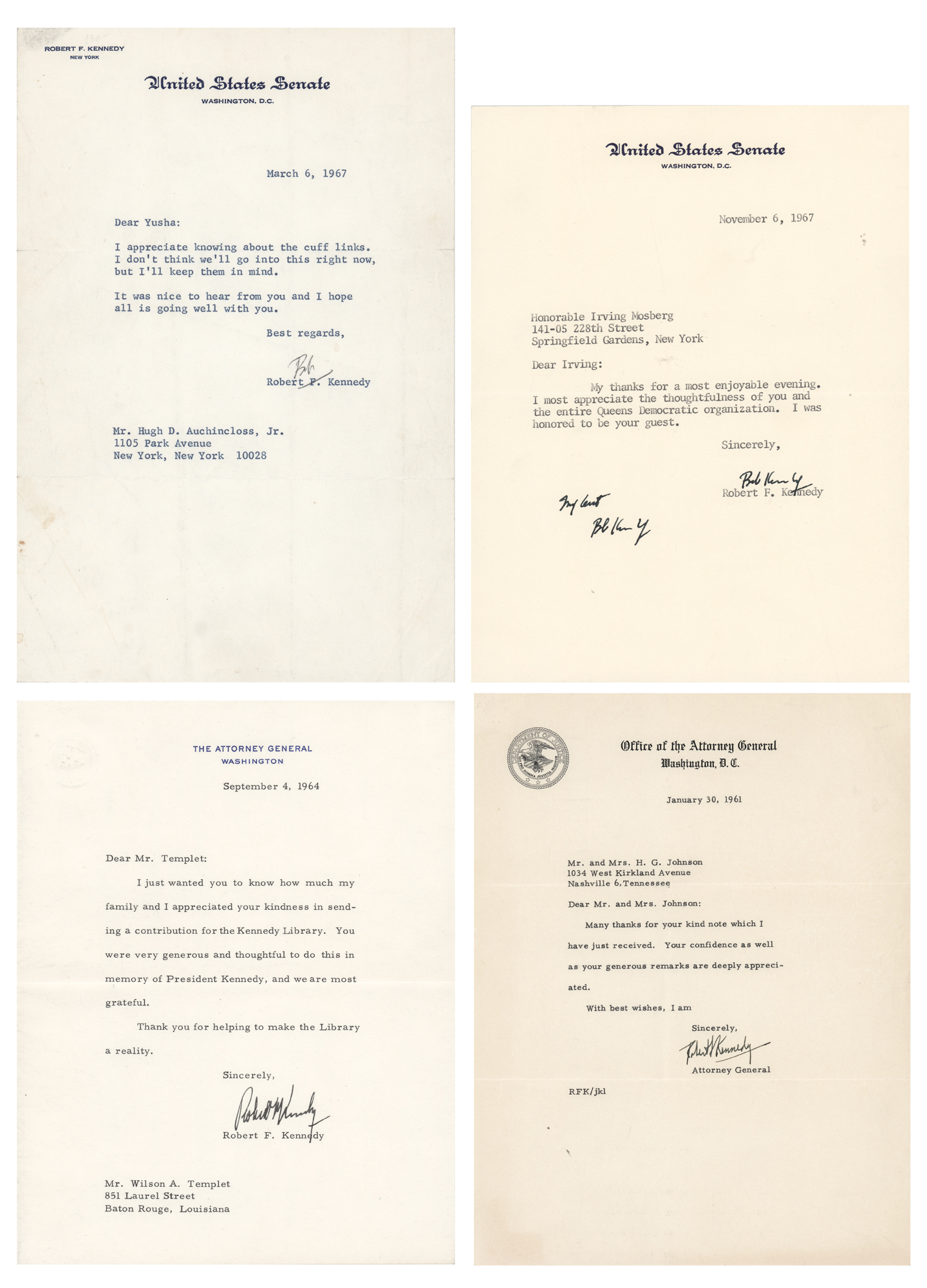 Four TLSs signed either “Bob,” “Bob Kennedy,” or “Robert F. Kennedy,” each one page, 6.25 x 8 to 8 x 10.5, Attorney General and United States Senate letterhead, dated between 1961 and 1967. The earliest letter, signed as attorney general, January 30, 1961, thanks Mr. and Mrs. H. G. Johnson for their kind note: “Your confidence as well as your generous remarks are deeply appreciated.” The second letter, signed as attorney general, September 4, 1964, thanking Wilson A. Templett for his contribution to the Kennedy Library: “You were very generous and thoughtful to do this in memory of President Kennedy, and we are most grateful.” The third letter, signed as a New York Senator, March 6, 1967, sent to Hugh D. Auchincloss, Jr.: “I appreciate knowing about the cuff links. I don’t think we’ll go into this right now, but I’ll keep them in mind.” The fourth letter, as a New York Senator, November 6, 1957, sent to New York politician Irving Mosberg: “My thanks for a most enjoyable evening. I most appreciate the thoughtfulness of you and the entire Queens Democratic organization.” Kennedy signs again to the left, “My best, Bob Kennedy.” In overall fine condition.
