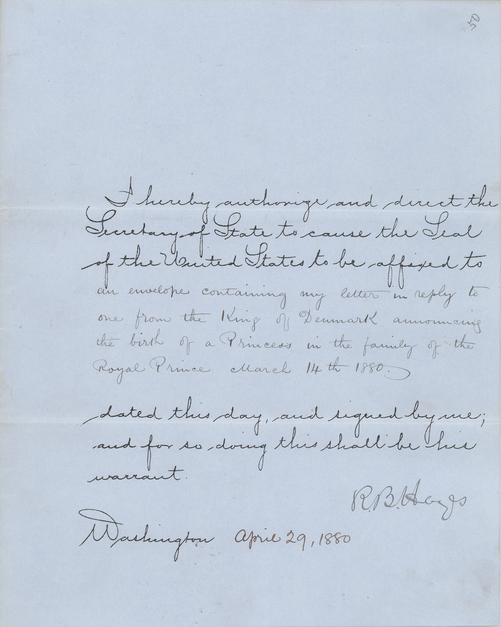Partly-printed DS as president, signed “R. B. Hayes,” one page, 8 x 10, April 29, 1880. President Hayes authorizes and directs the Secretary of State to cause the Seal of the United States to be affixed to "an envelope containing my letter in reply to one from the King of Denmark announcing the birth of a Princess in the family of the Royal Prince, March 14th 1880." Neatly signed at the conclusion in ink by President Rutherford B. Hayes. In fine condition.
