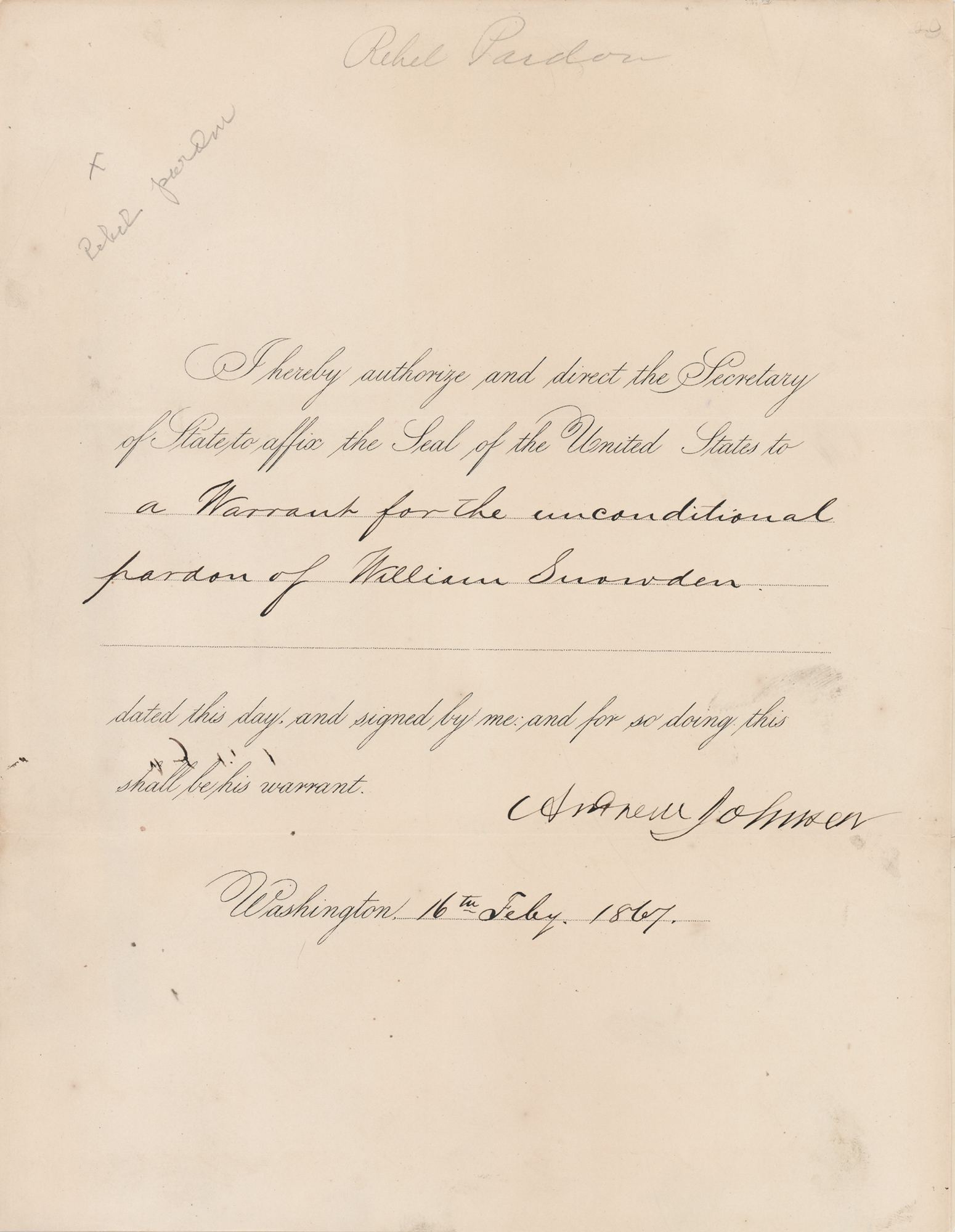 Partly-printed DS as president, one page, 8.5 x 11, February 16, 1867. President Johnson authorizes and directs the Secretary of State to affix the Seal of the United States to "a Warrant for the unconditional pardon of William Snowden." Boldly signed at the conclusion in ink by President Andrew Johnson. Annotated at the head in pencil in an unknown hand, "Rebel Pardon." In fine condition, with light show-through along the left edge from an old mounting remnant on the back.