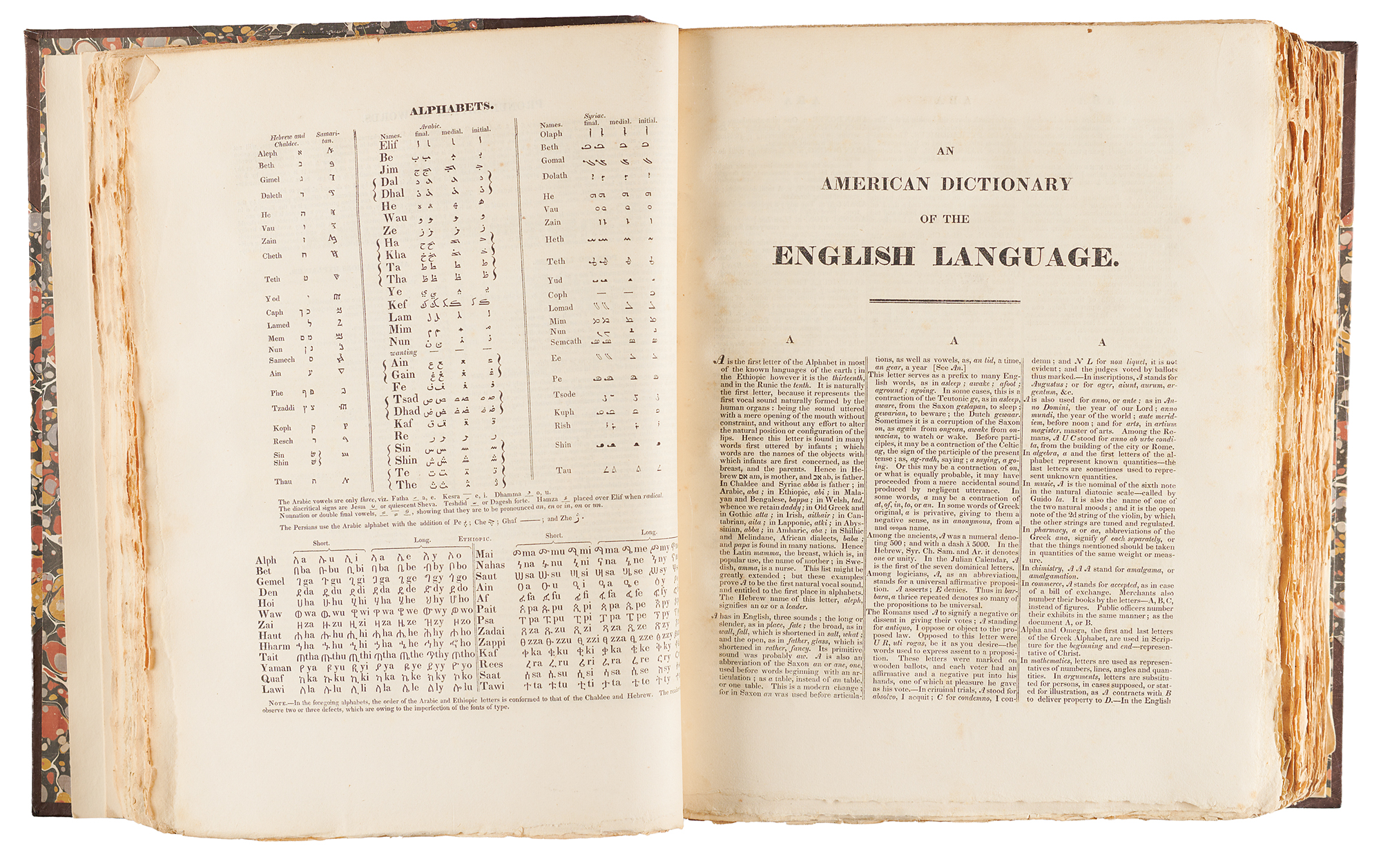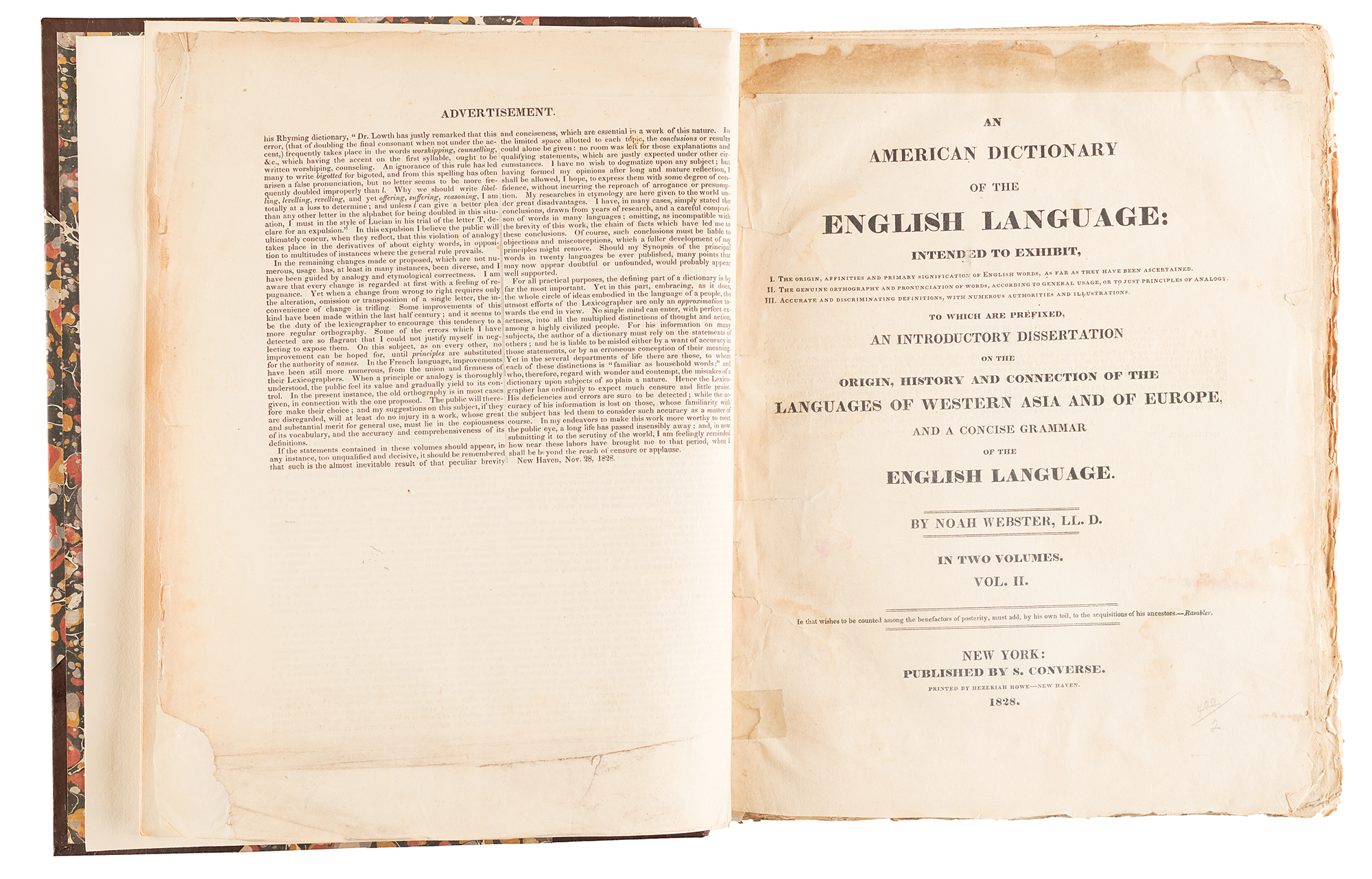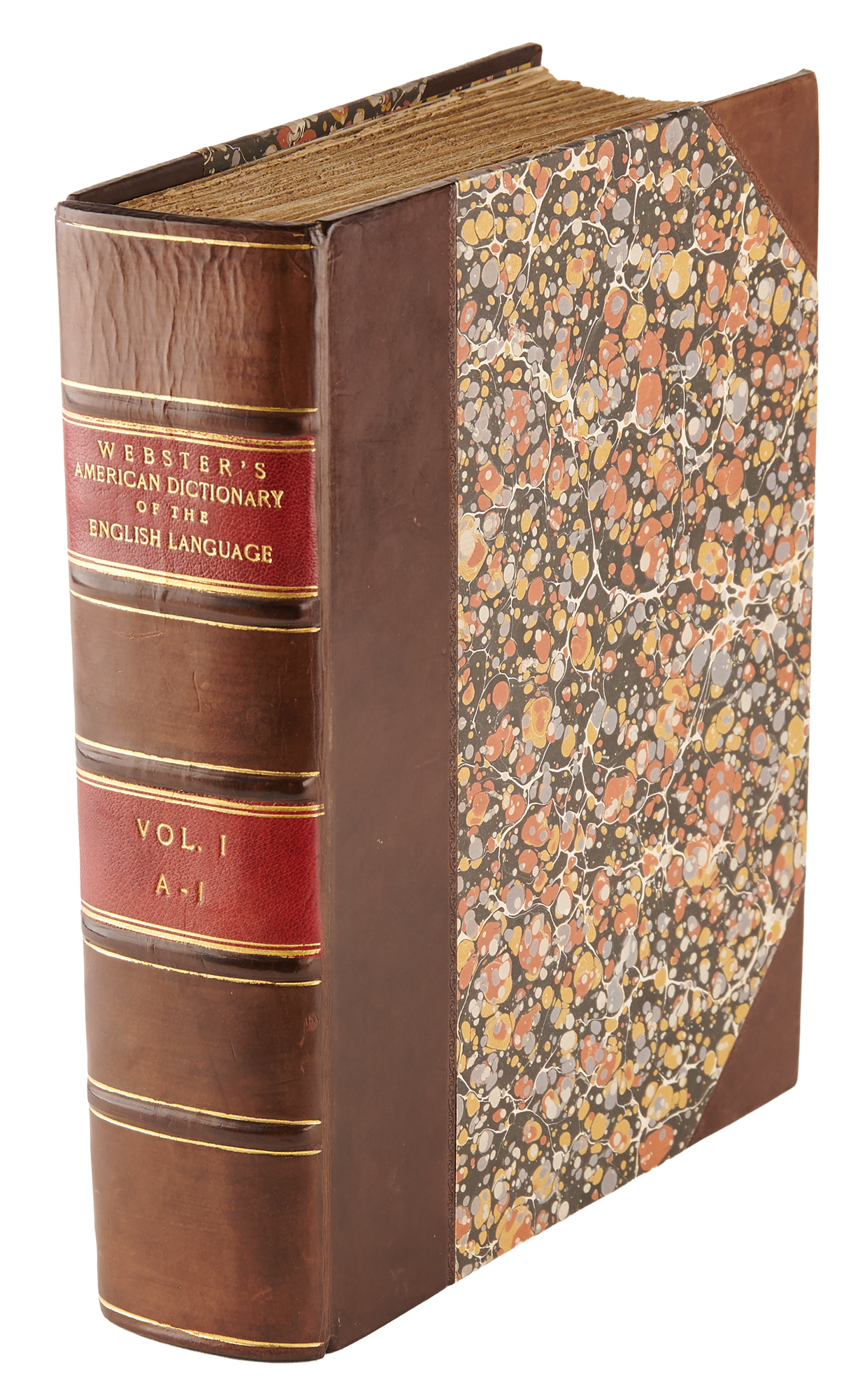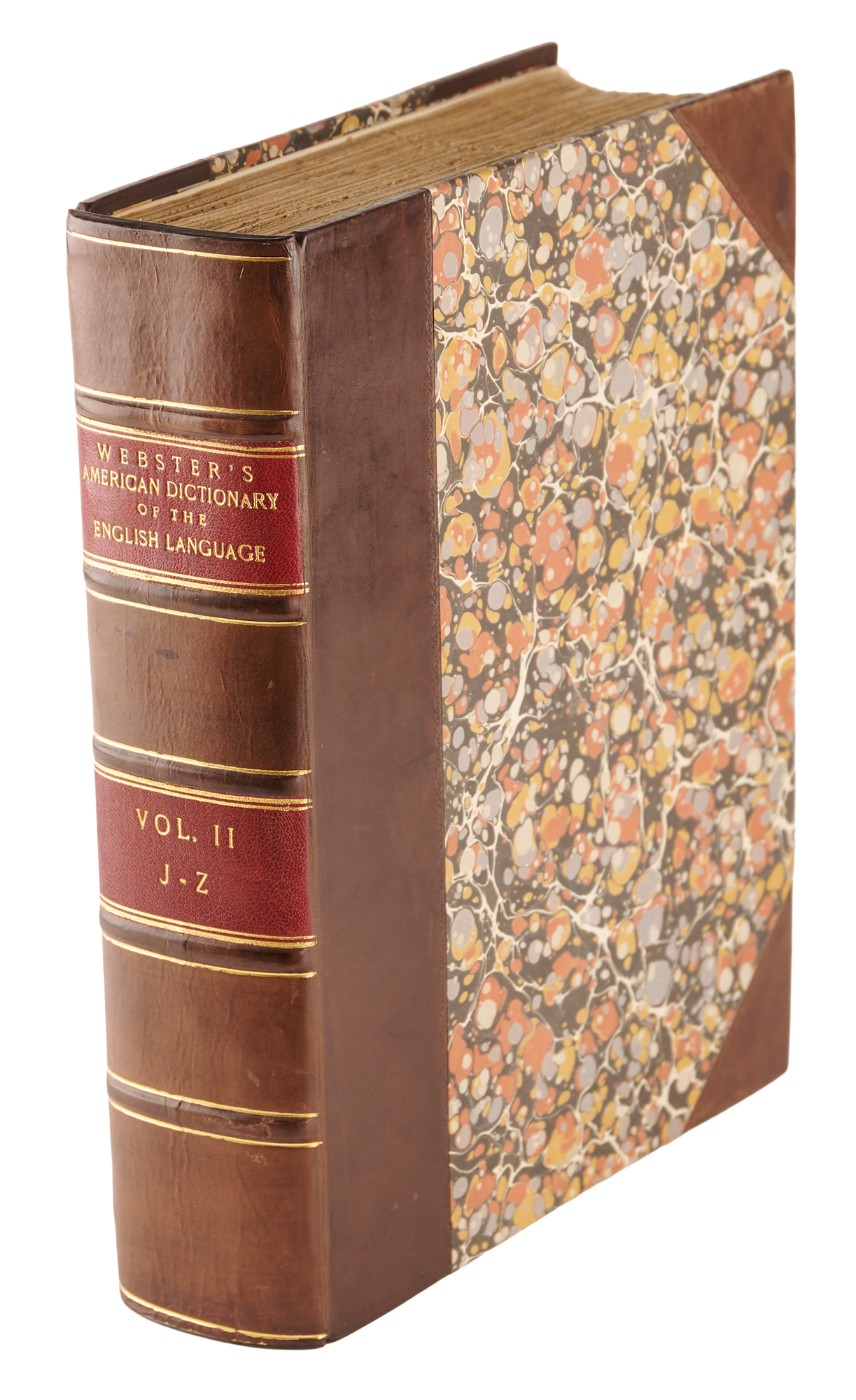 Rare book: An American Dictionary of the English Language, Vols. I and II, by Noah Webster. First edition. NY: S. Converse, 1828. Hardcovers rebound in three-quarter chocolate calf with marbled boards, uncut edges, 10.25 x 12.5, containing some 70,000 entries: the first volume covers A–I, and the second volume covers J–Z. The title page describes Webster's intent to exhibit: "The origin, affinities and primary signification of English words, as far as they have been ascertained. II. The genuine orthography and pronunciation of words, according to general usage, or to just principles of analogy. III. Accurate and discriminating definitions, with numerous authorities and illustrations. To which are prefixed, an introductory dissertation on the origin, history and connection of the languages of Western Asia and of Europe, and a concise grammar of the English language." Loosely laid in is Webster's ink signature, "You obed. servant, N. Webster," on an off-white 5 x 1 slip.