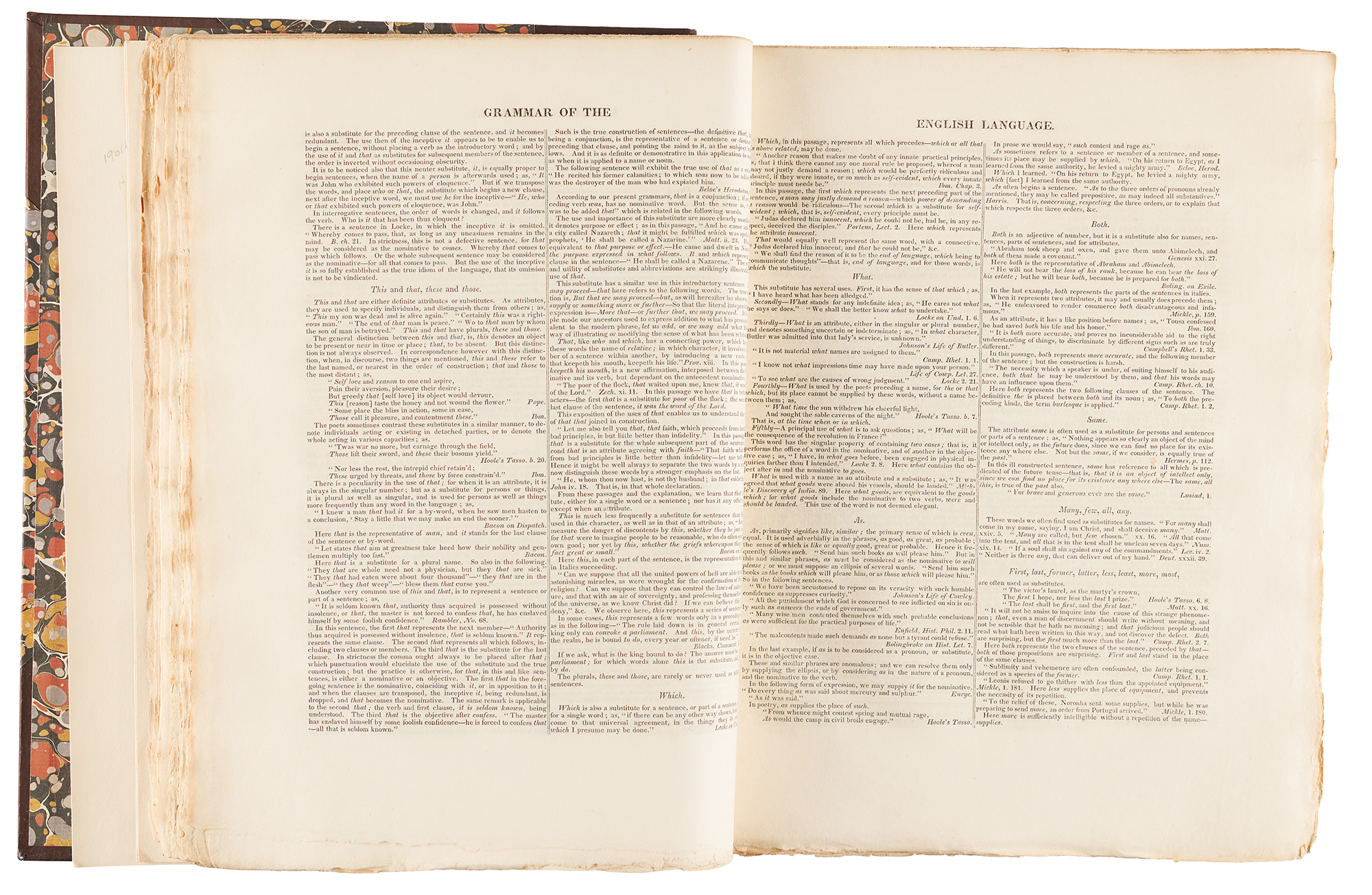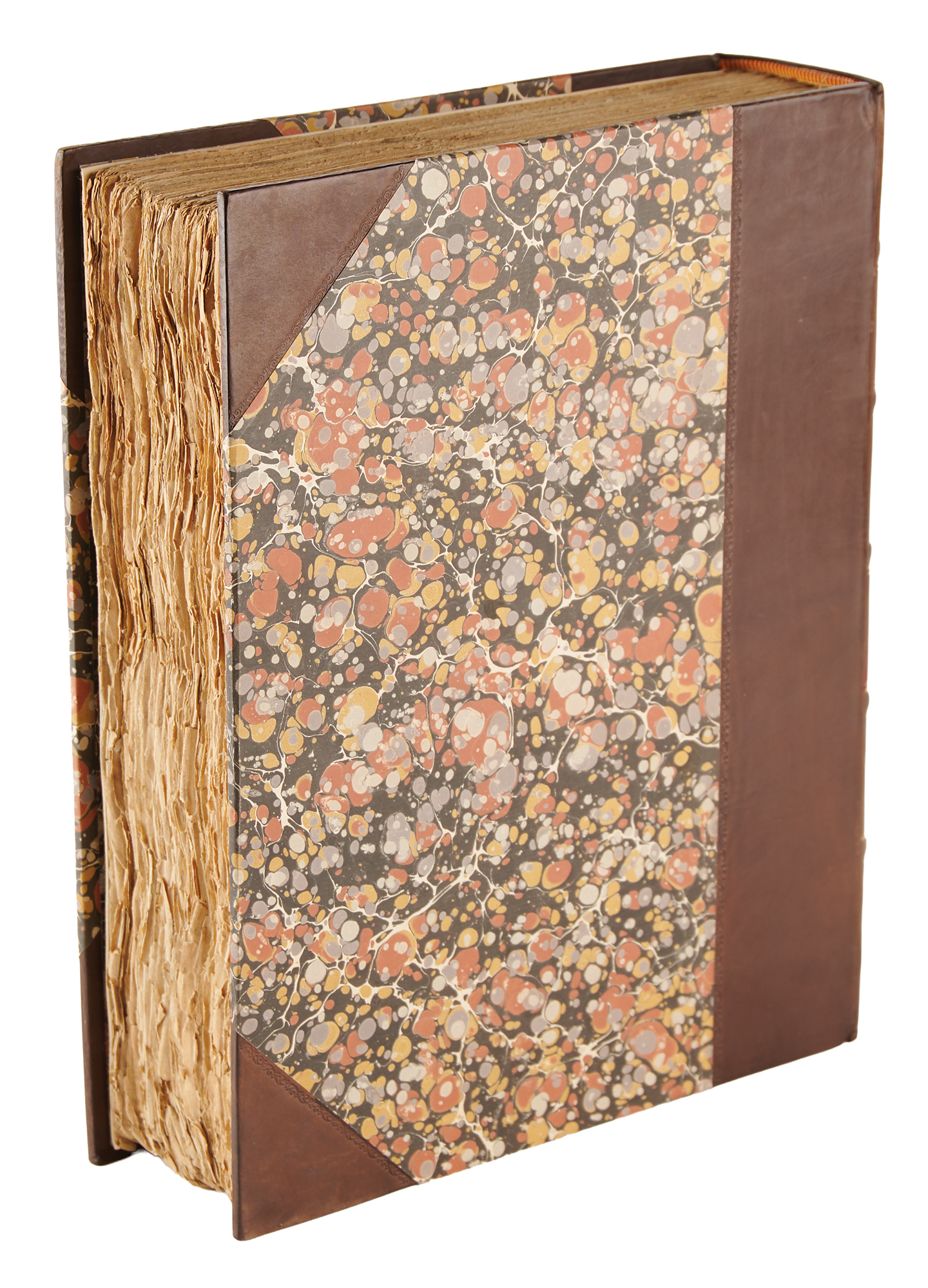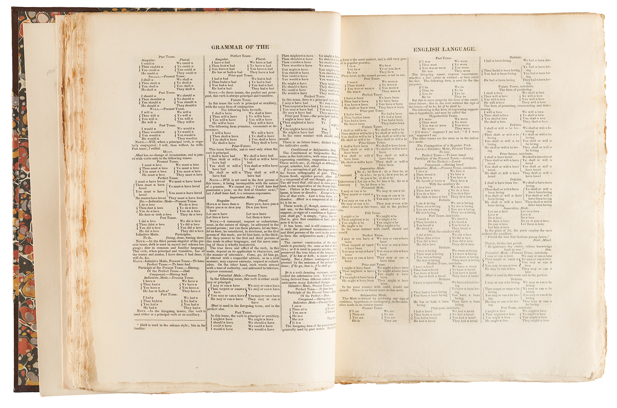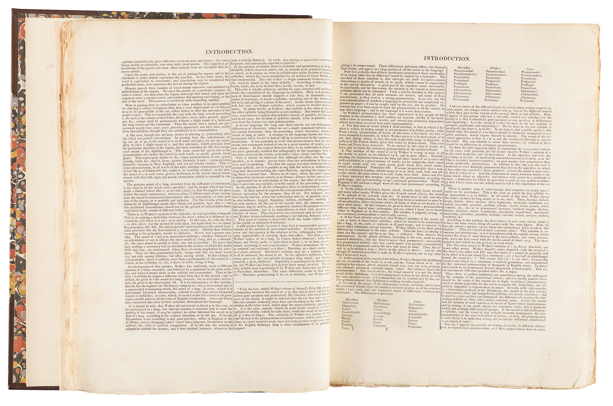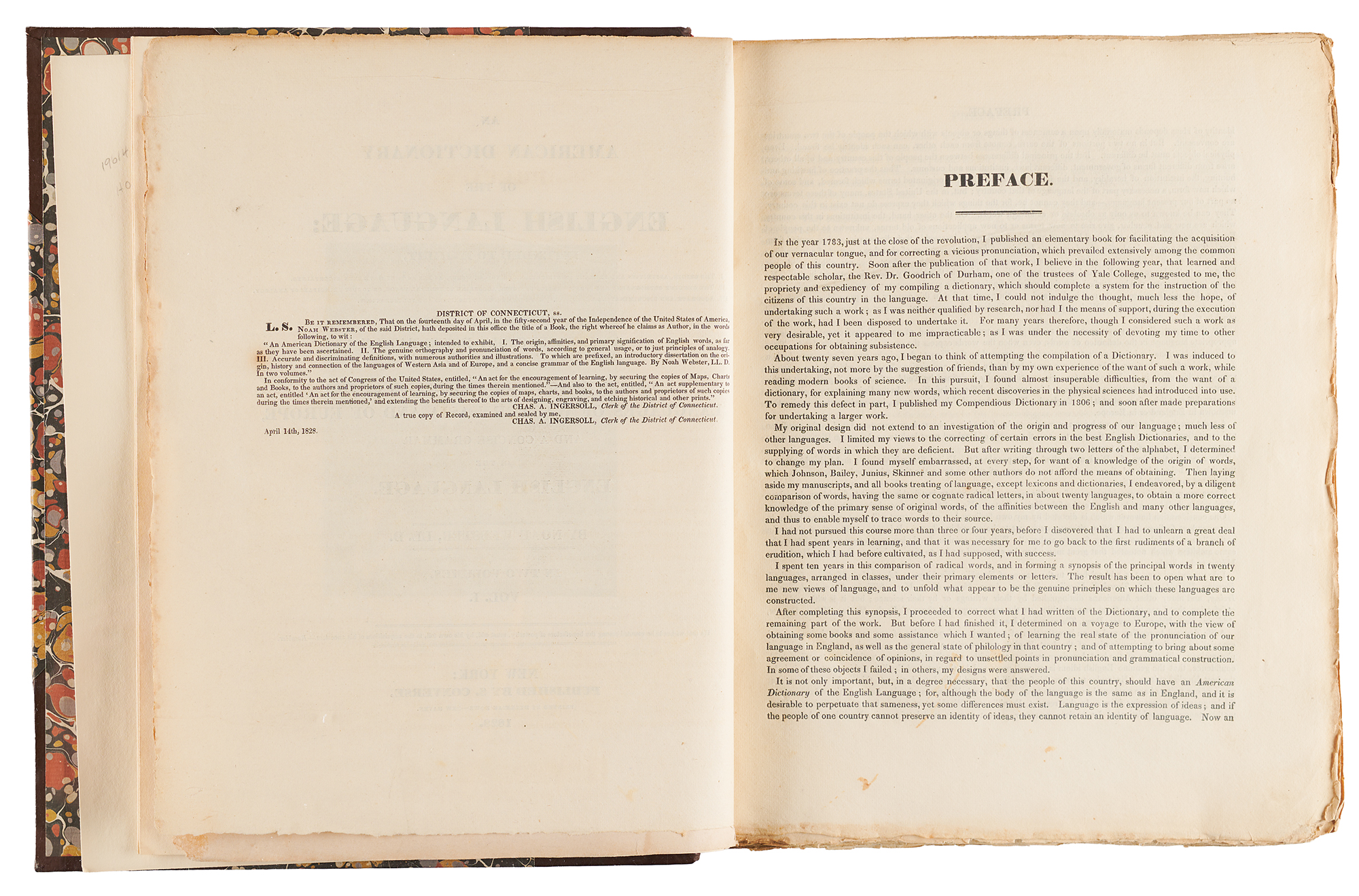 Rare book: An American Dictionary of the English Language, Vols. I and II, by Noah Webster. First edition. NY: S. Converse, 1828. Hardcovers rebound in three-quarter chocolate calf with marbled boards, uncut edges, 10.25 x 12.5, containing some 70,000 entries: the first volume covers A–I, and the second volume covers J–Z. The title page describes Webster's intent to exhibit: "The origin, affinities and primary signification of English words, as far as they have been ascertained. II. The genuine orthography and pronunciation of words, according to general usage, or to just principles of analogy. III. Accurate and discriminating definitions, with numerous authorities and illustrations. To which are prefixed, an introductory dissertation on the origin, history and connection of the languages of Western Asia and of Europe, and a concise grammar of the English language." Loosely laid in is Webster's ink signature, "You obed. servant, N. Webster," on an off-white 5 x 1 slip.