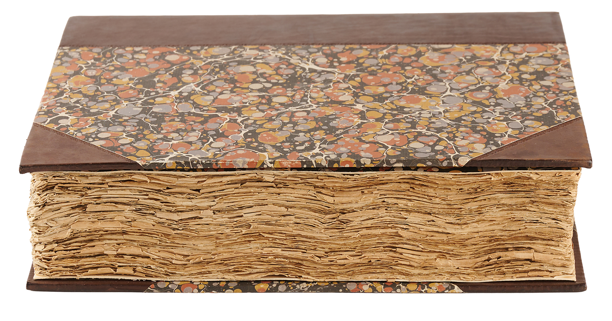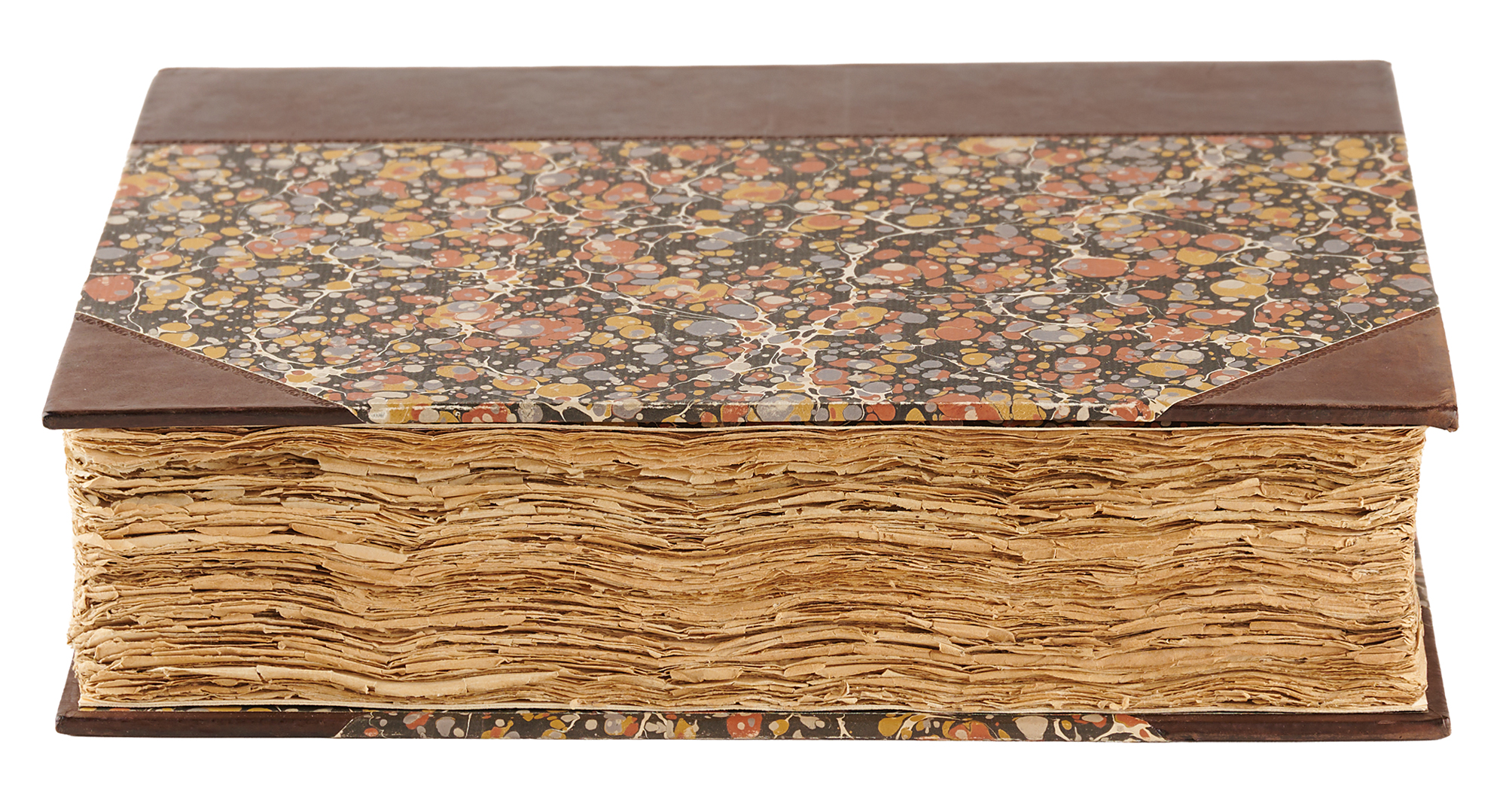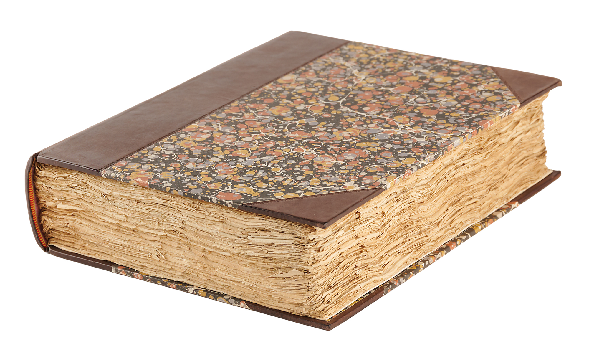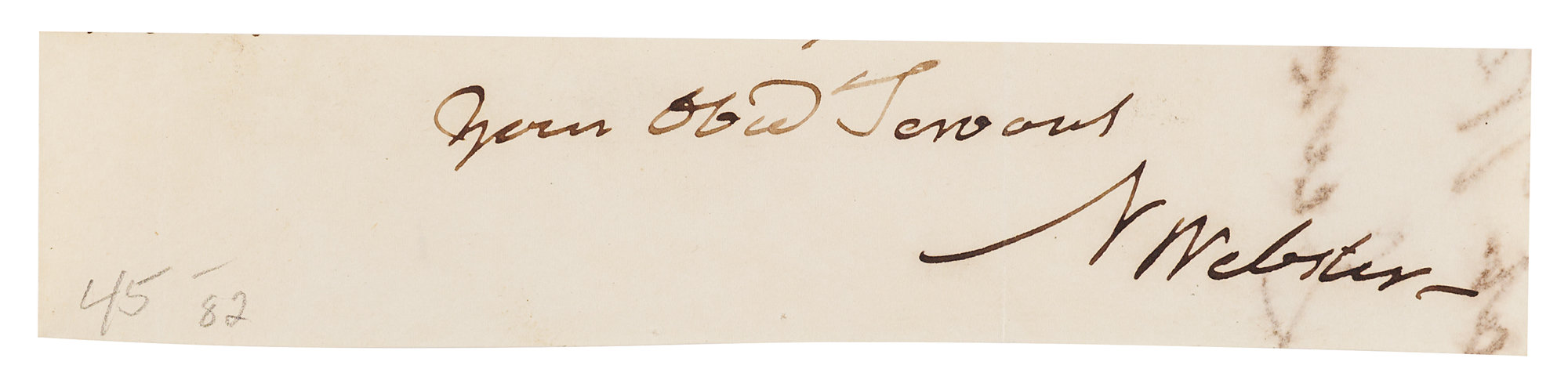 Rare book: An American Dictionary of the English Language, Vols. I and II, by Noah Webster. First edition. NY: S. Converse, 1828. Hardcovers rebound in three-quarter chocolate calf with marbled boards, uncut edges, 10.25 x 12.5, containing some 70,000 entries: the first volume covers A–I, and the second volume covers J–Z. The title page describes Webster's intent to exhibit: "The origin, affinities and primary signification of English words, as far as they have been ascertained. II. The genuine orthography and pronunciation of words, according to general usage, or to just principles of analogy. III. Accurate and discriminating definitions, with numerous authorities and illustrations. To which are prefixed, an introductory dissertation on the origin, history and connection of the languages of Western Asia and of Europe, and a concise grammar of the English language." Loosely laid in is Webster's ink signature, "You obed. servant, N. Webster," on an off-white 5 x 1 slip.