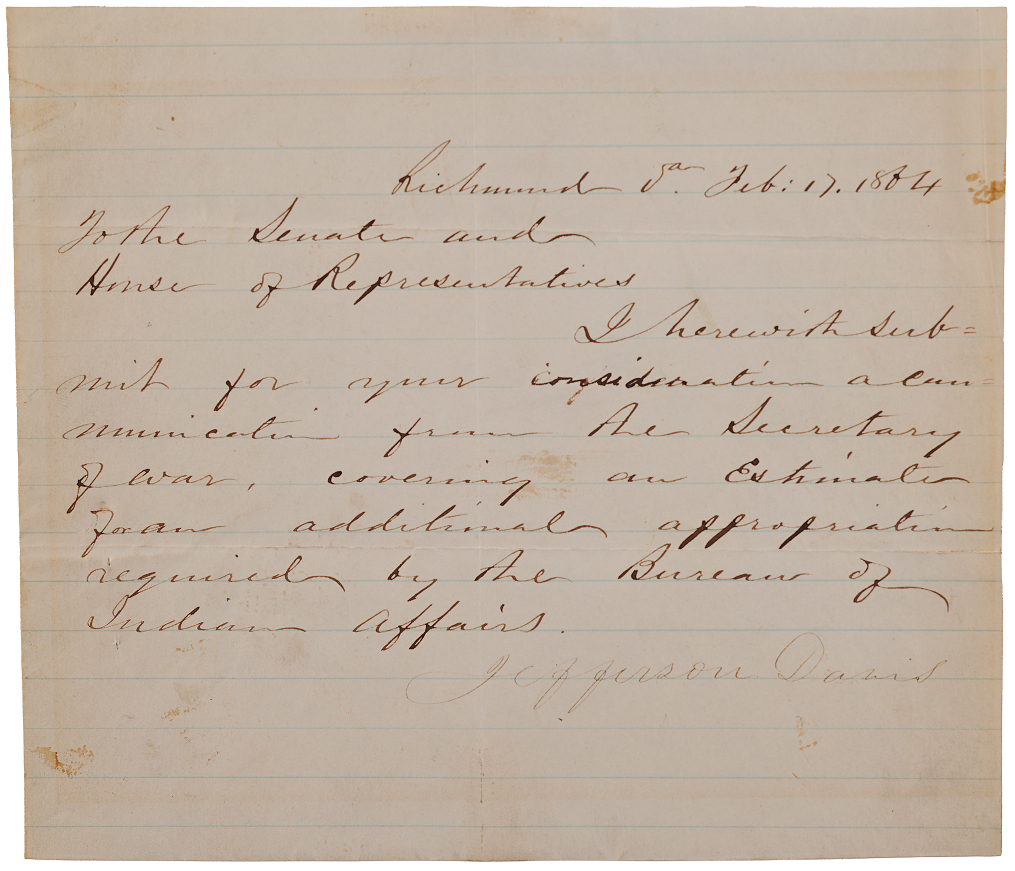 LS, signed "Jefferson Davis," one page, 7.75 x 6.75, January 17, 1864. Letter from Richmond to "the Senate and House of Representatives," in full: "I herewith submit for your consideration a communication from the Secretary of War, covering an estimate for additional appropriation required by the Bureau of Indian Affairs." In fine condition, with light soiling, faint toning, and tastefully trimmed edges.