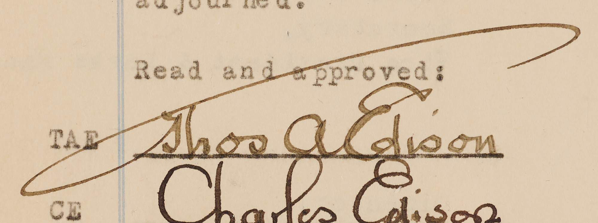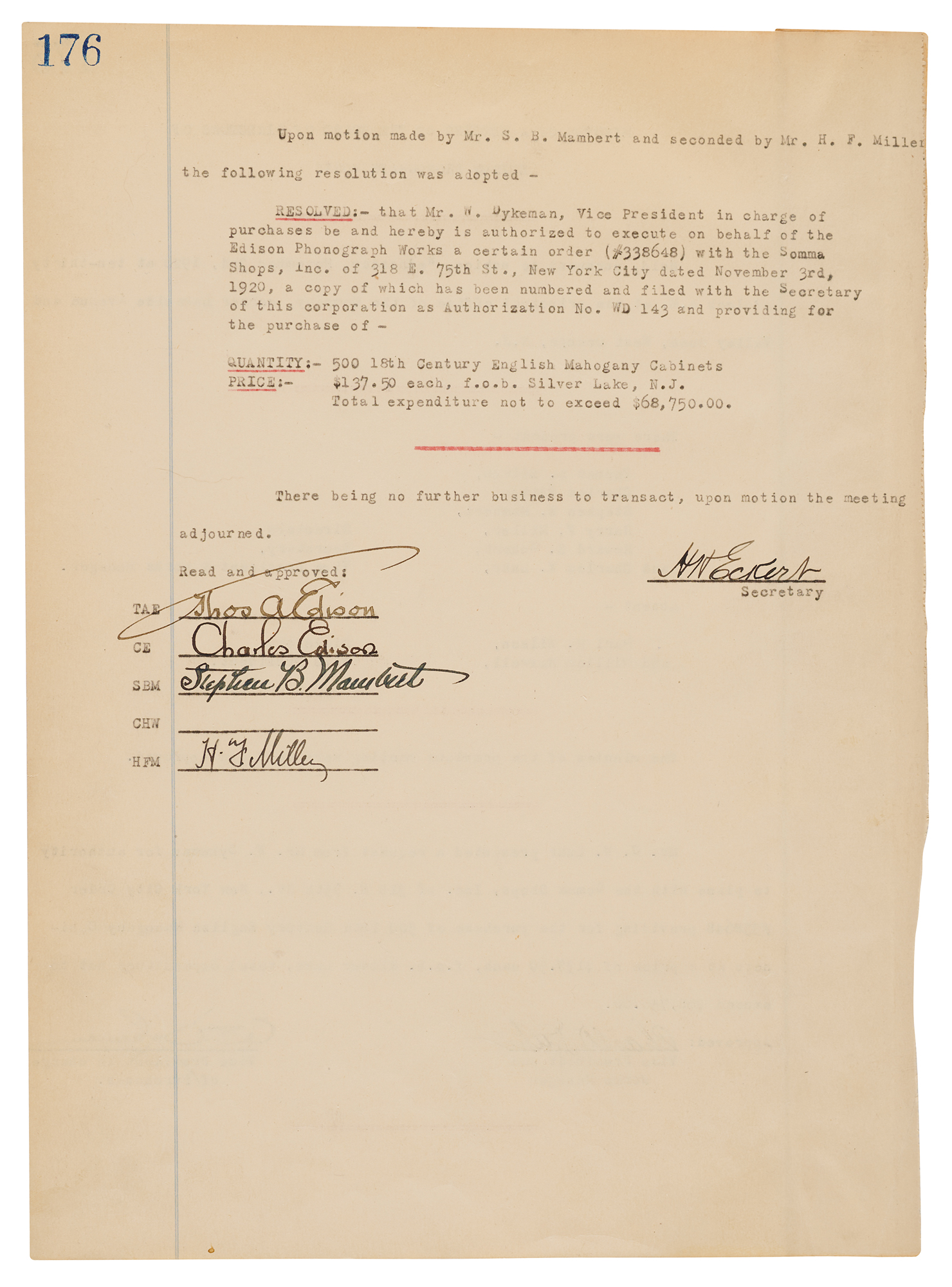 DS, signed “Thos. A. Edison,” one page both sides, 8 x 11, November 3, 1920. Document headed "Minutes of a Meeting of the Board of Directors of Edison Phonograph Works," approving a purchase order for "500 18th Century English Mahogany Cabinets, $137.50 each…Total expenditure not to exceed $68,750." Signed at the conclusion in ink by Thomas Edison, Charles Edison, Stephen B. Mambert, Harry F. Miller, and Howard H. Eckert. In fine condition.