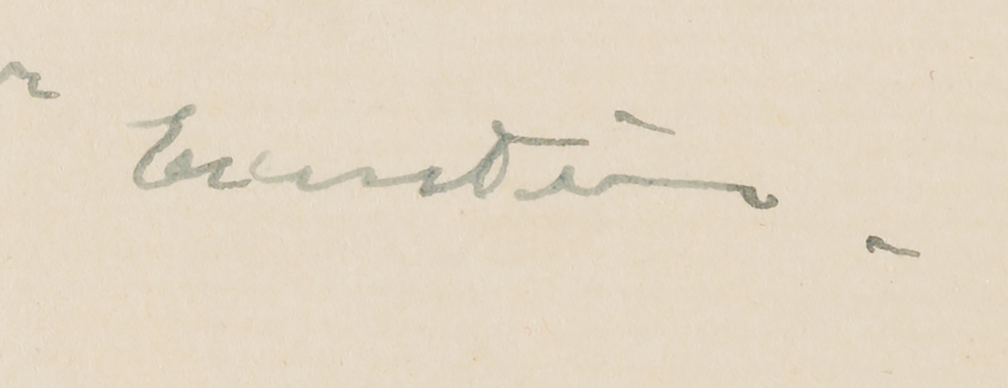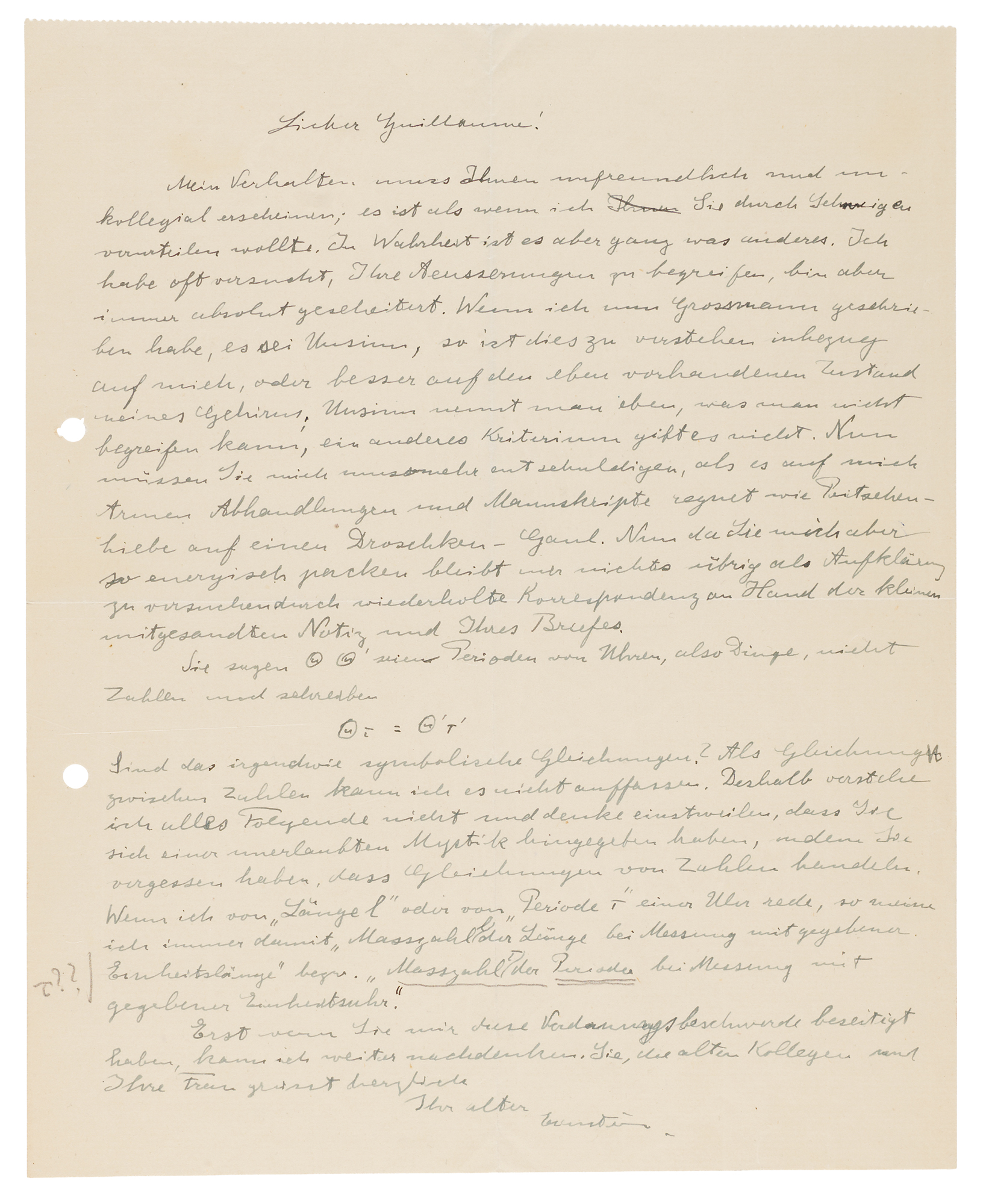 ALS in German, signed “Einstein,” one page, 8.5 x 10.5, no date but postmarked July 5, 1920. Handwritten letter to Swiss physicist Édouard Guillaume, in full (translated): "My behavior must seem unfriendly and uncollegial to you; it’s as if I wanted to condemn you by silence. In reality, however, it’s something quite different. I’ve often tried to understand what you say, but I’ve always failed utterly. If I wrote about Grossmann that it’s nonsense, this has to be understood with respect to me, or better, with respect to the state of my brain at the present moment. We call nonsense what we can’t understand; there is no other criterion. And you must forgive me all the more as essays and manuscripts rain down on poor me like lashes of the whip on a hackney-carriage nag. But since you press me so energetically, I have no choice but to seek enlightenment through repeated correspondence on the basis of the little enclosed notice and your letter.