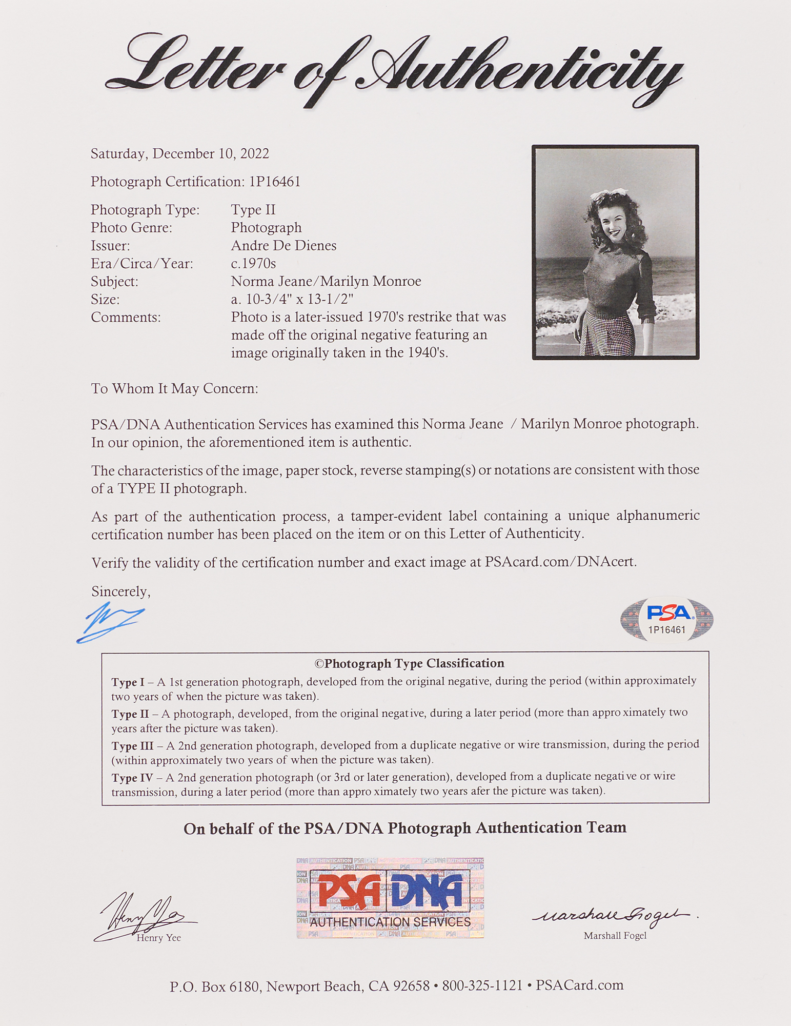 Semi-glossy 10.75 x 13.25 silver gelatin photograph of a young Marilyn Monroe on a Malibu beach wearing a sweater and checkered pants, originally taken in the late 1940s by photographer Andre de Dienes and printed from the original negative during the 1970s. Reverse bears the credit stamp of Andre de Dienes. In fine condition, with one small crease to the ocean background. Accompanied by a full letter of authenticity from PSA/DNA, certifying it as an authentic "Type II" photograph.