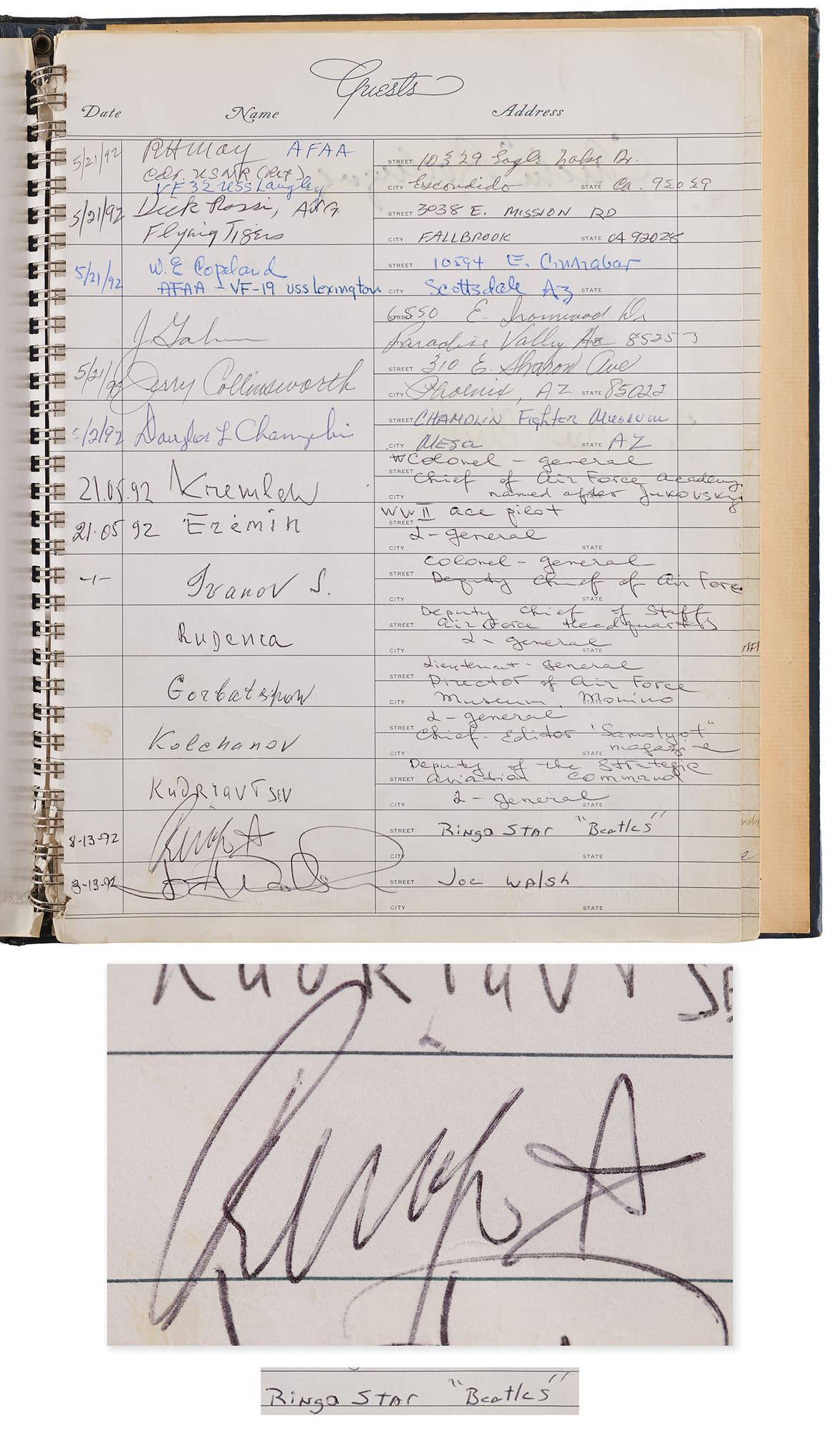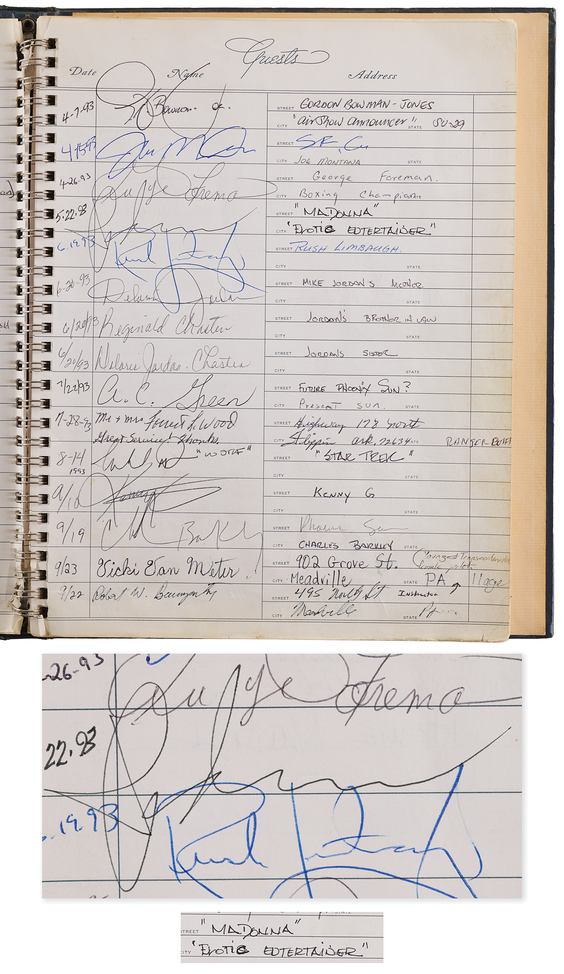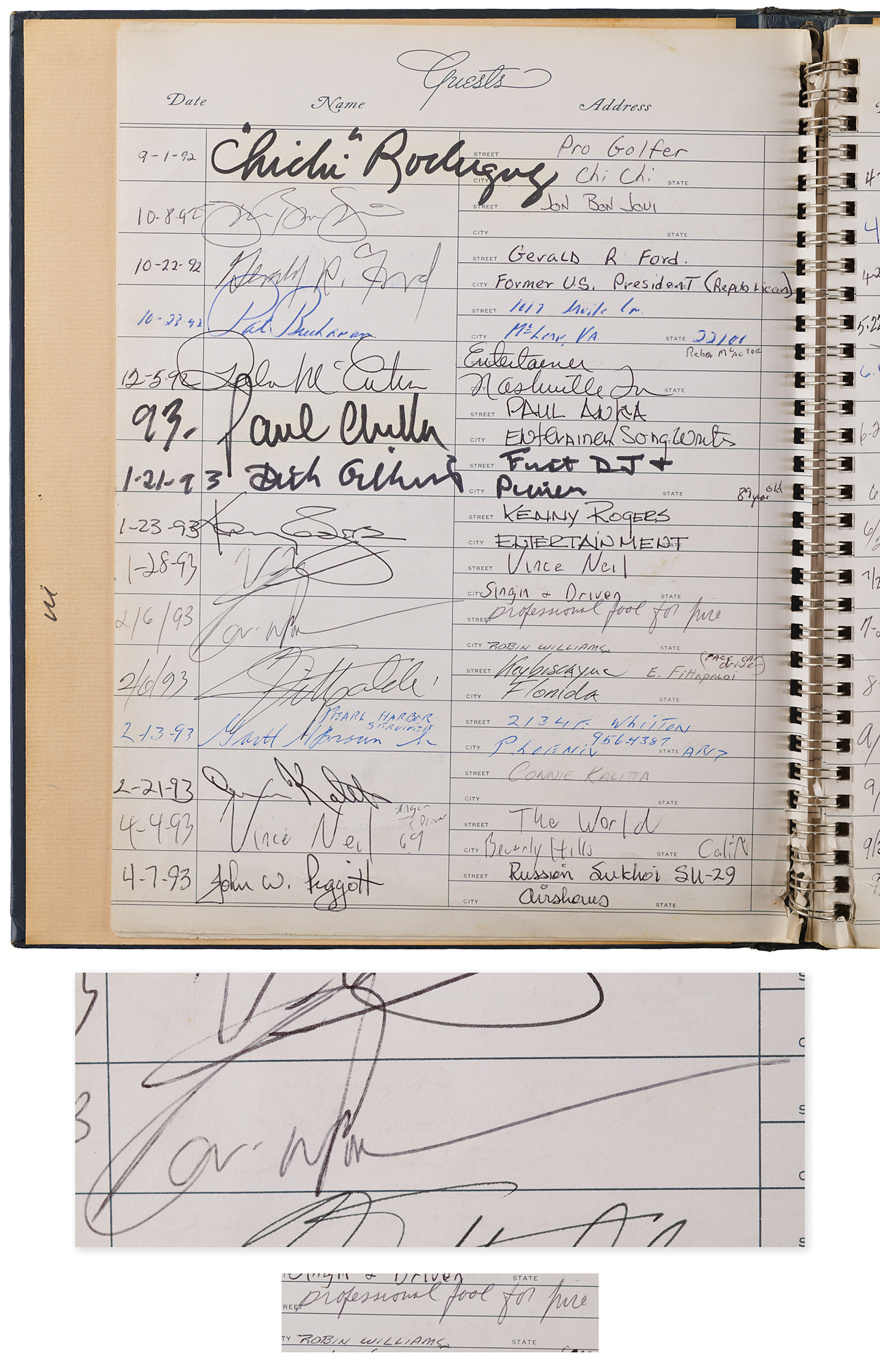 Unique 9 x 11.25 hardcover guest book from Phoenix Sky Harbor International Airport, signed by over 60 celebrities and notable figures during the 1990s. Highlights are: Jerry Garcia, Michael Jordan, Madonna, Ringo Starr, Sting, Ozzy Osbourne, Donald Trump, Gerald Ford, George Bush, and Robin Williams (adding "professional fool for hire").
