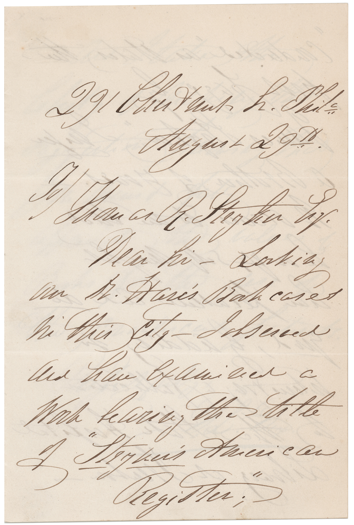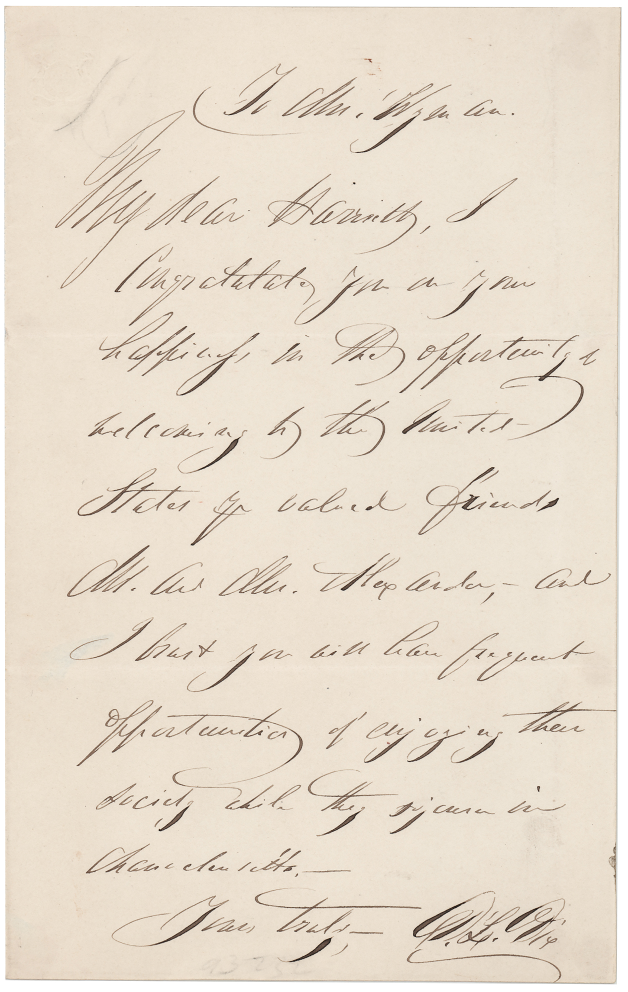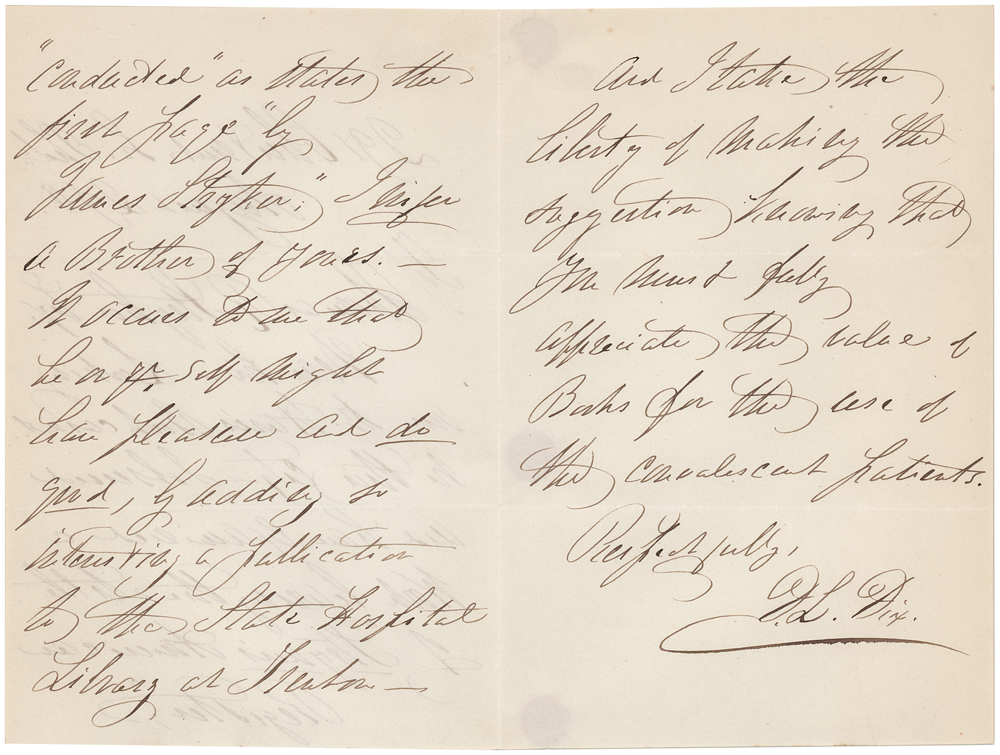 Advocate on behalf of the indigent mentally ill (1802–1887) who created the first generation of American mental asylums. During the Civil War, she served as a Superintendent of Army Nurses. Two ALSs, signed "D. L. Dix," totaling four pages, 4.5 x 7, no years. In one letter, Dix writes to her friend, "Harriet," congratulating her on "the opportunity of welcoming to the United States your valued friends." In the other, she addresses "Thomas R. Stryker," suggesting that a work entitled 'Stryker's American Register' be added to "the State Hospital Library at Trenton." In overall fine condition.