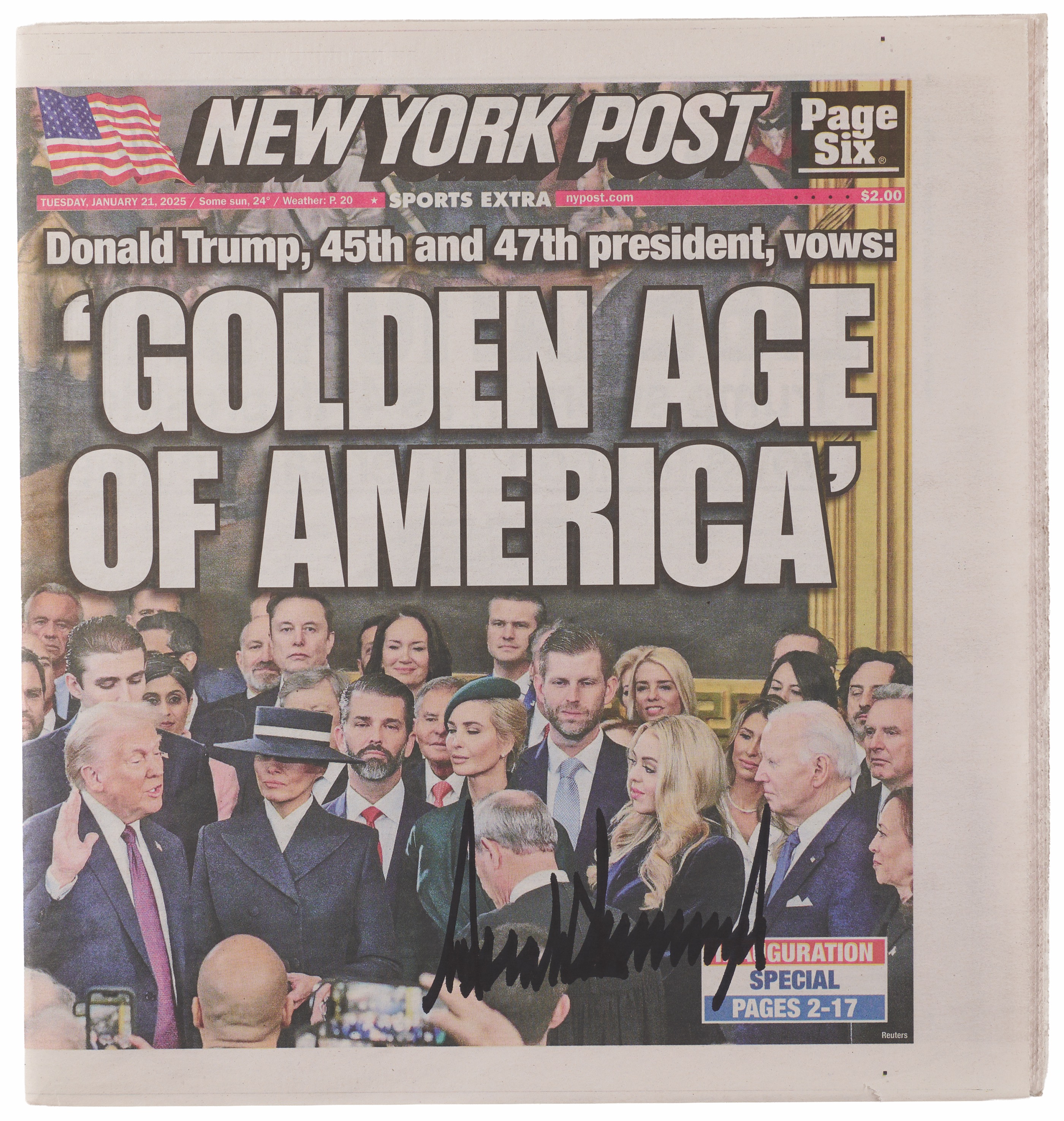 Issue of the New York Post newspaper from Tuesday, January 21, 2025, 11.5 x 12, with the front page featuring a warp-around color image of Donald Trump taking the oath of office during his second presidential inauguration, with large lead article headline, “Donald Trump, 45th and 47th president, vows: ‘Golden Age of America,’” signed prominently in black felt tip by Trump. In fine condition. Accompanied by a full letter of authenticity from PSA.