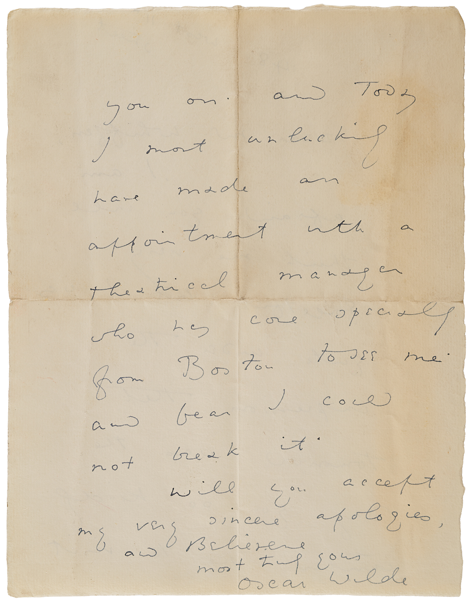 Oscar Wilde Autograph Letter Signed: "I most unluckily have made an appointment with a theatrical manager"
