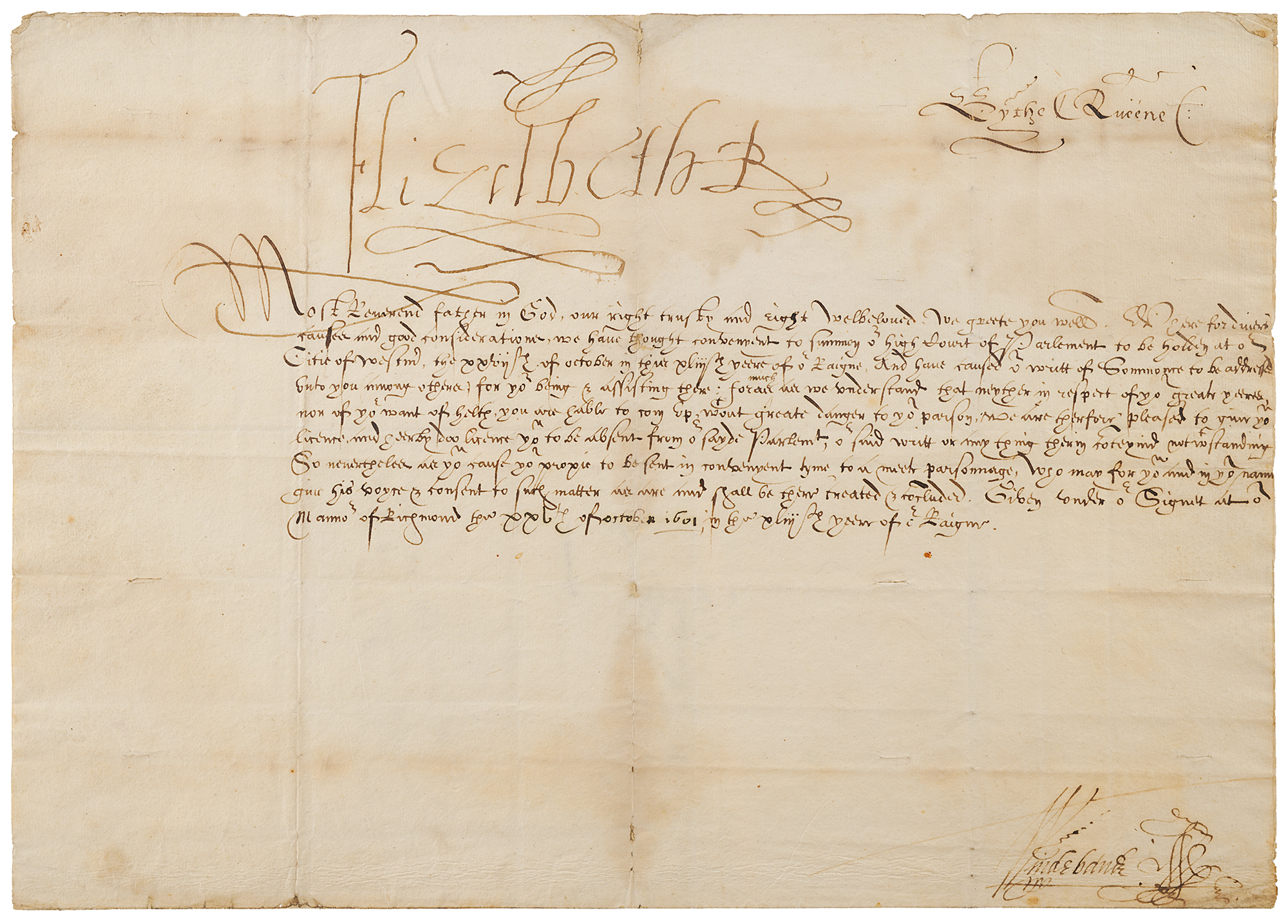 LS signed “Elizabeth R,” one page, 12 x 8.5, October 25, 1601. Letter to Matthew Hutton, Archbishop of York, excusing him from personally attending the new session of Parliament, on the grounds of age and infirmity, and instructing him to appoint a proxy. In part: "Where for divers causes and good considerationes, we have thought convenient to summon our high Court of Parlement to be holden at our Citie of Westm[inster], the xxvijth of october in the xliijth yeere of our Raigne. And have caused our writt of Sommonce to be addressed unto you among others for your being & assisting there: for as much as we understand that neyther in respect of your greate yeeres nor of your want of helth you are hable to com up w[ith]out greate danger to your parson. We are therfoer pleased to give you licence and heerby doo licence you to be absent." In very good to fine condition, with scattered light dampstaining and old expert repairs to split folds.
