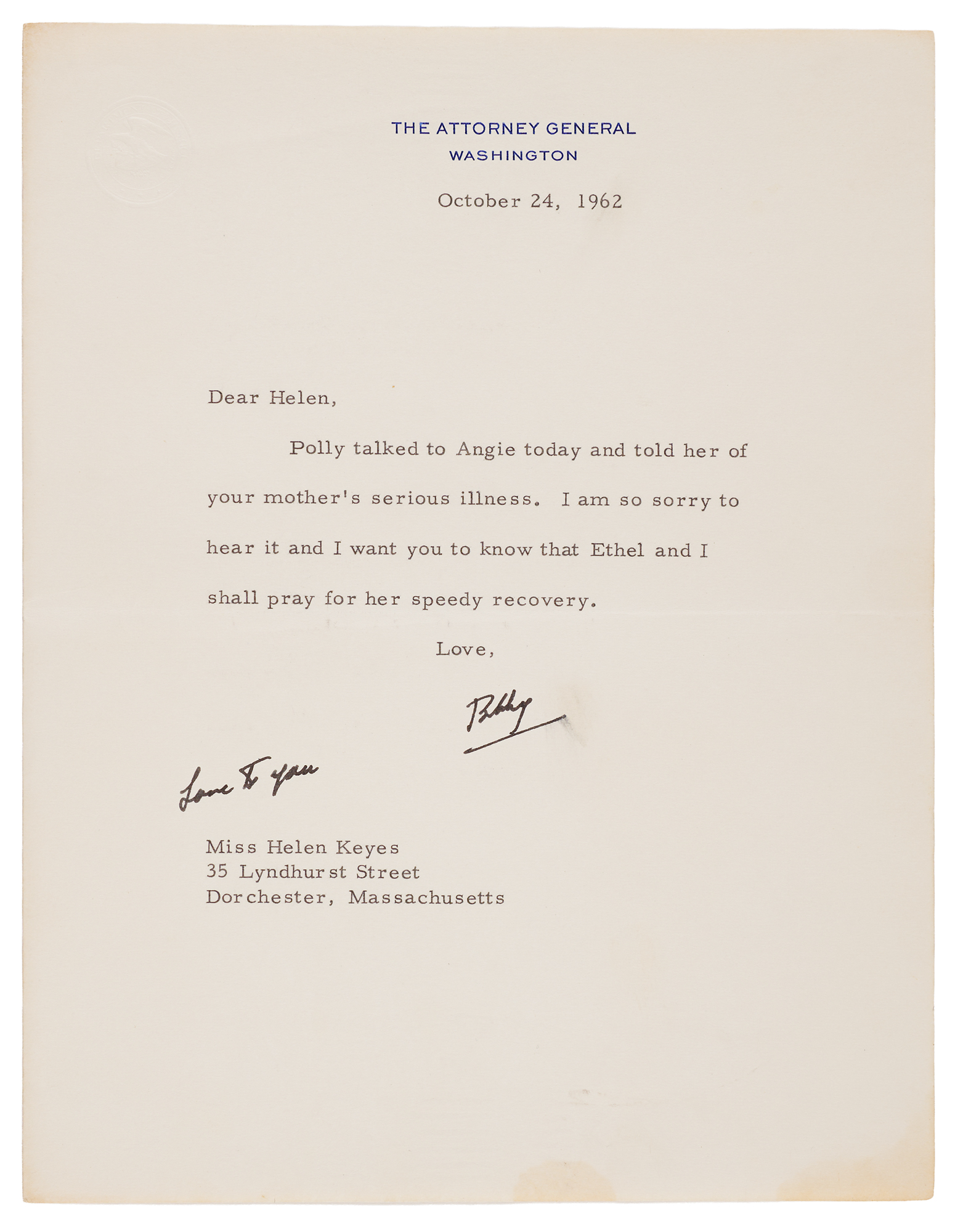 Two items presented to Helen Keyes, a longtime, trusted assistant to the Kennedy family: a vintage semi-glossy 7.25 x 9 silver gelatin photograph of John F. Kennedy, affixed to its original 11 x 14 mount, which is signed and inscribed in ballpoint, “For Helen Keyes – with deep appreciation for her loyal service to the President – from the very beginning, Devotedly, Jacqueline Kennedy”; and a TLS from Robert F. Kennedy, signed “Bobby,” one page, 7 x 9, Attorney General letterhead, October 24, 1962, in full: “Polly talked to Angie today and told her of your mother’s serious illness. I am so sorry to hear it and I want you to know that Ethel and I shall pray for her speedy recovery.” Kennedy adds a handwritten note below, “Love to you.” In overall very good to fine condition, with some slight damage to the edges of the mount, easily matted out to create an attractive display; and an upper crease, and light stains and smudges to the letter. Keyes was deeply involved with JFK's political career, hosting events, managing campaigns (1952 Senate, 1960 Presidential), and continuing her service through his administration. Her father was the family dentist, creating a strong family connection, and she even served as administrator for the John F. Kennedy Library in Boston.