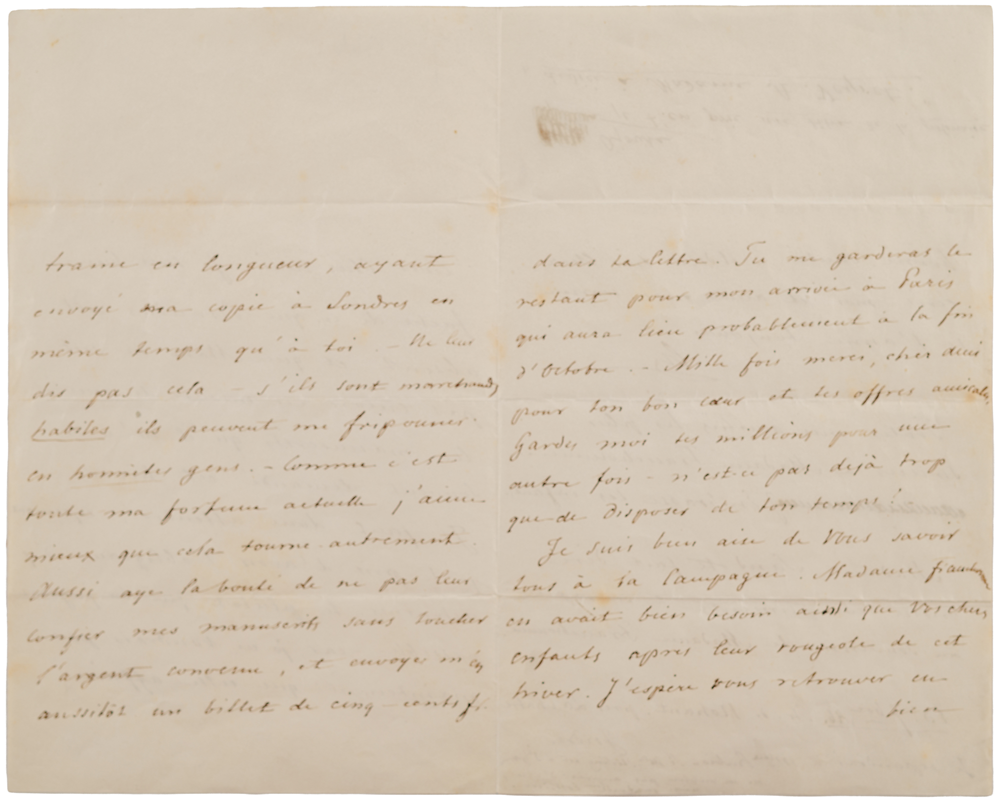 ALS in French, signed “Ch.,” four pages on two adjoining sheets, 4 x 6.5, September 13, 1846. Handwritten letter to his close friend, the cellist Auguste Franchomme, about the publication of his music, referring especially to his Op. 61, 'Polonaise-Fantaisie.' In part (translated): "I am very annoyed that Brandus is absent and that Maho is not yet able to receive the manuscripts he so often requested from me this winter…Please be so kind as not to entrust my manuscripts to them without receiving the agreed-upon payment, and send me a five-hundred-franc note immediately in your letter…Keep your millions for another time."