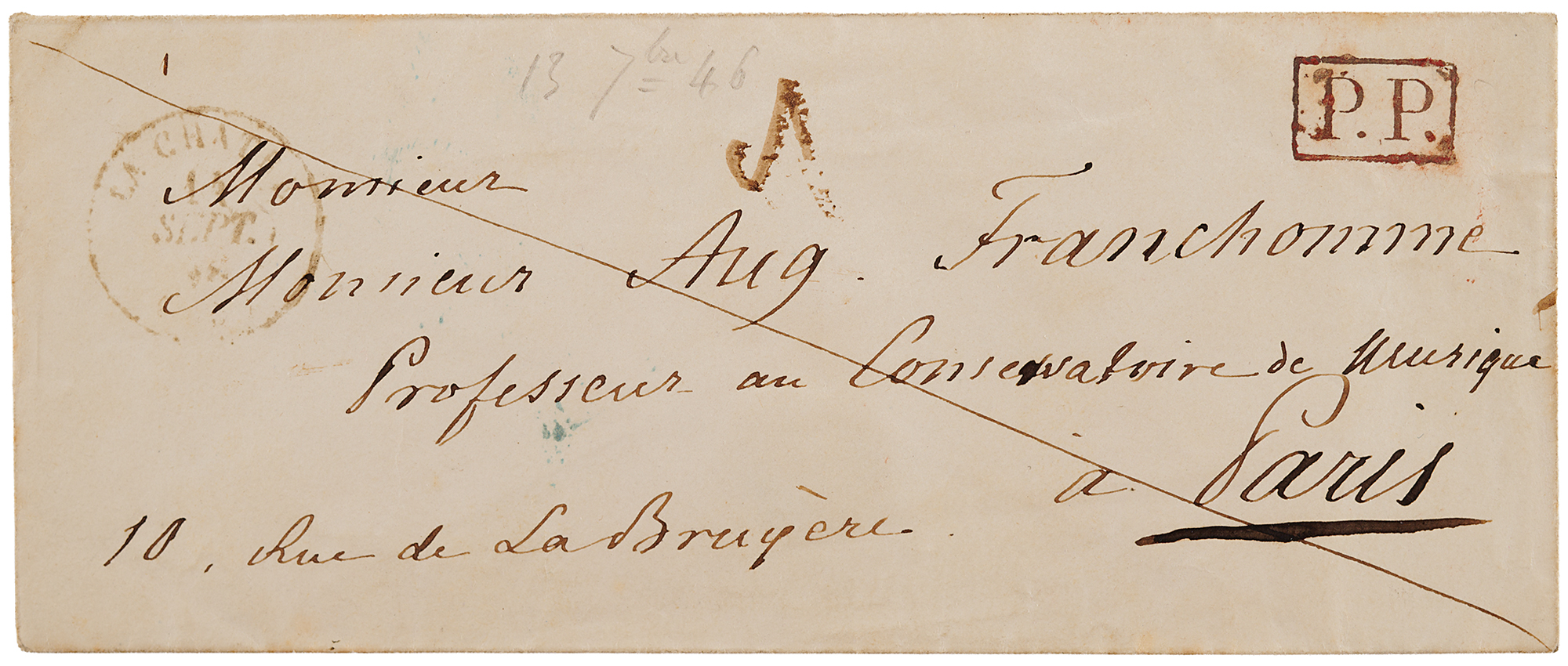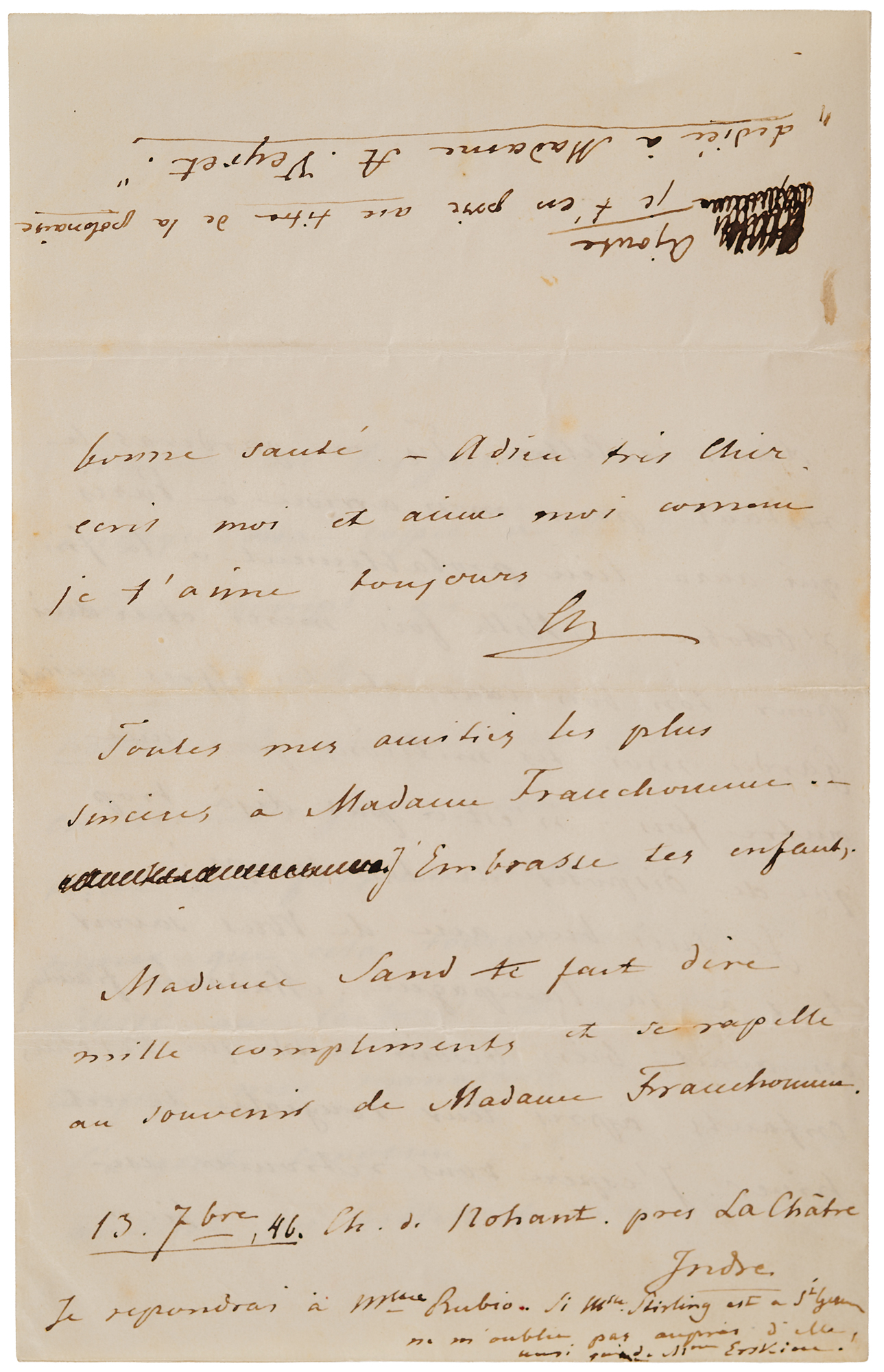 In a postscript, he sends regards from himself and "Madame Sand"—his famous lover, the writer George Sand—to the Franchomme family, and asks to be remembered to his friend and student, the pianist Jane Stirling, and others: "If Mme. Stirling is in St. Germain, please remember me to her, as well as to Mme. Erskine." Finally, he provides further publishing instructions at the top: "Please add to the title of the Polonaise, 'dedicated to Madame A. Veyret.'" In fine condition. Accompanied by the original mailing envelope, addressed in Chopin's own hand. Also includes an export certificate from the French Ministry of Culture.
