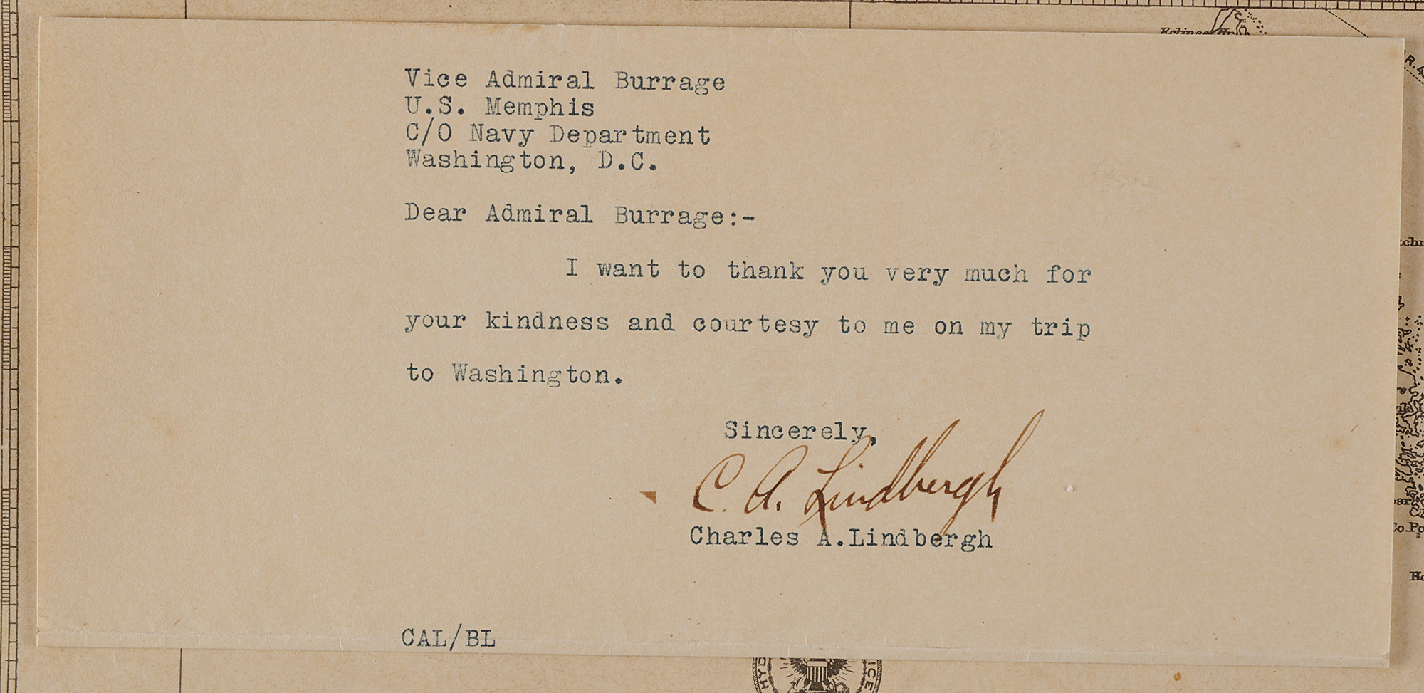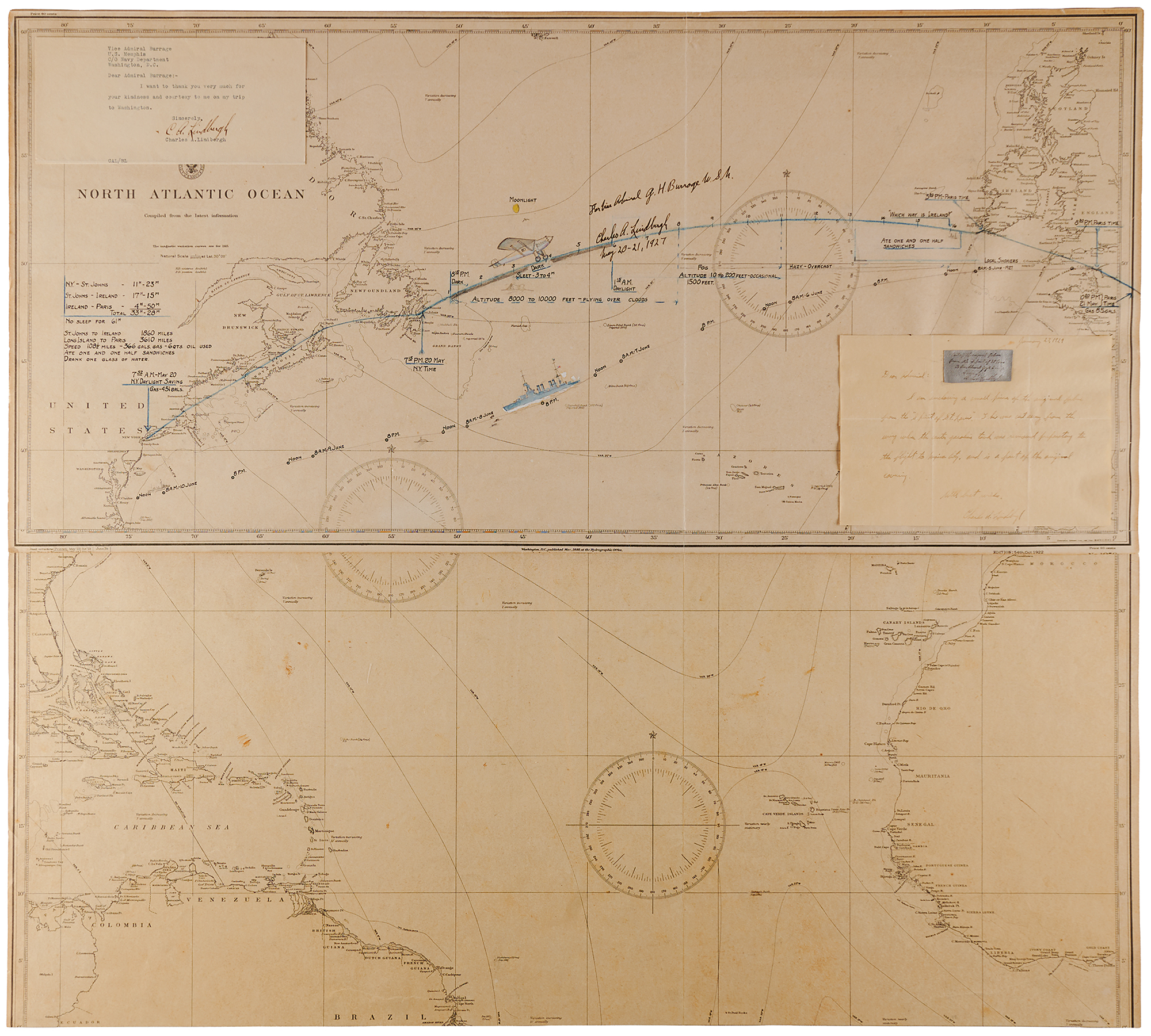 Affixed to the map are two letters to Burrage from Lindbergh. At the upper left is a TLS, signed "C. A. Lindbergh," no date but probably 1927, shortly after this historic voyage. In full: "I want to thank you very much for your kindness and courtesy to me on my trip to Washington."