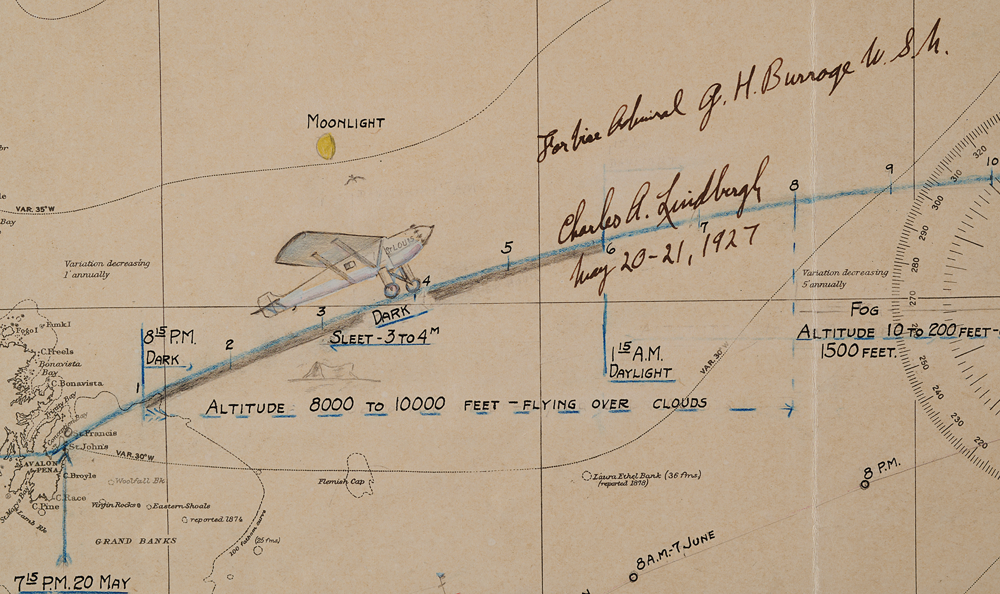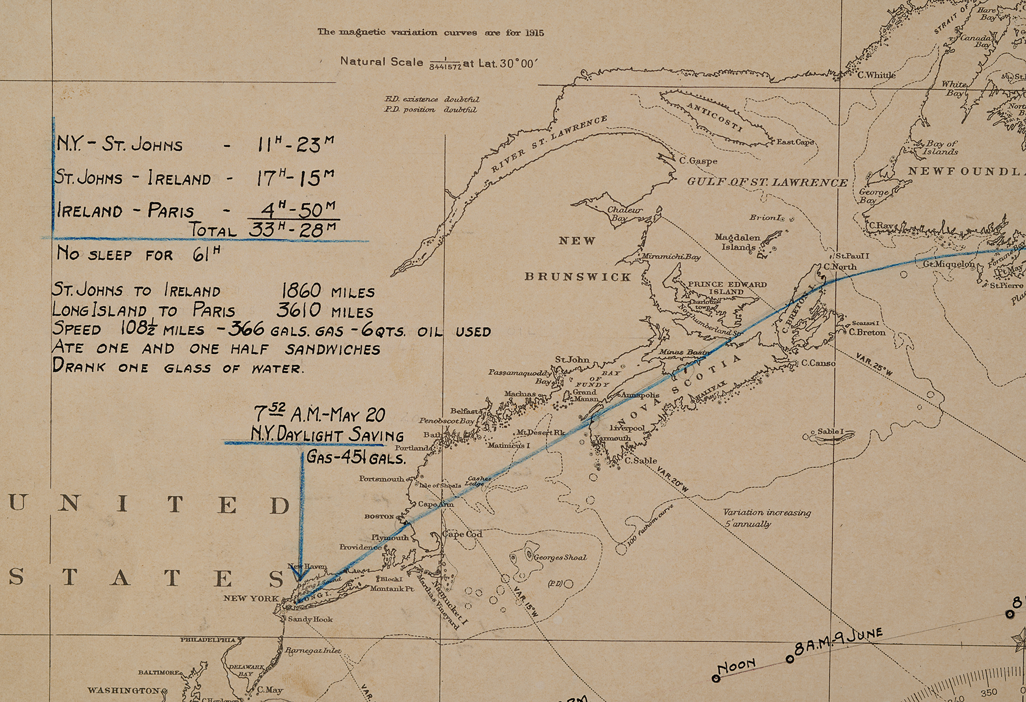 The flight path is traced below, from Roosevelt Airfield in Garden City, New York, to Aéroport Le Bourget in Paris, which lies slightly off the chart in the right margin. Times, conditions, and notable events are indicated along the route, starting with takeoff: "7:52 a.m. - May 20. NY Daylight Savings Time. Gas - 451 Gals." The Spirit of St. Louis's journey is traced in blue pencil, up the New England coast and over St. John's, Newfoundland at "7:15 P.M., 20 May, N. Y. Time." By 8:15 Lindbergh is over the open Atlantic—and in darkness, climbing in altitude from "8000 to 1000 feet—flying over clouds."