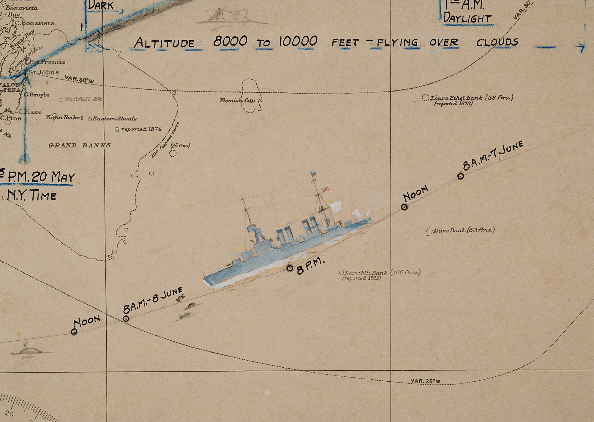 The triumphant Lindbergh is fêted throughout Europe with receptions in France, Belgium, and Britain, eliciting massive media coverage, countless gifts and invitations, and drawing enormous crowds wherever he goes. After this brief, celebratory tour, on June 4, 1927, Lindbergh and his 'Spirit of St. Louis' airplane leave Europe aboard the USS Memphis—commanded by Guy Burrage—bound for the United States. Their weeklong voyage home is traced in pencil, with times and dates inked in black; the paths are further illuminated with sketches of the Spirit of St. Louis and USS Memphis. Upon arriving, a fleet of warships and multiple flights of military aircraft escort the Memphis up the Potomac River to the Washington Navy Yard, where President Calvin Coolidge awards Lindbergh with the Distinguished Flying Cross.