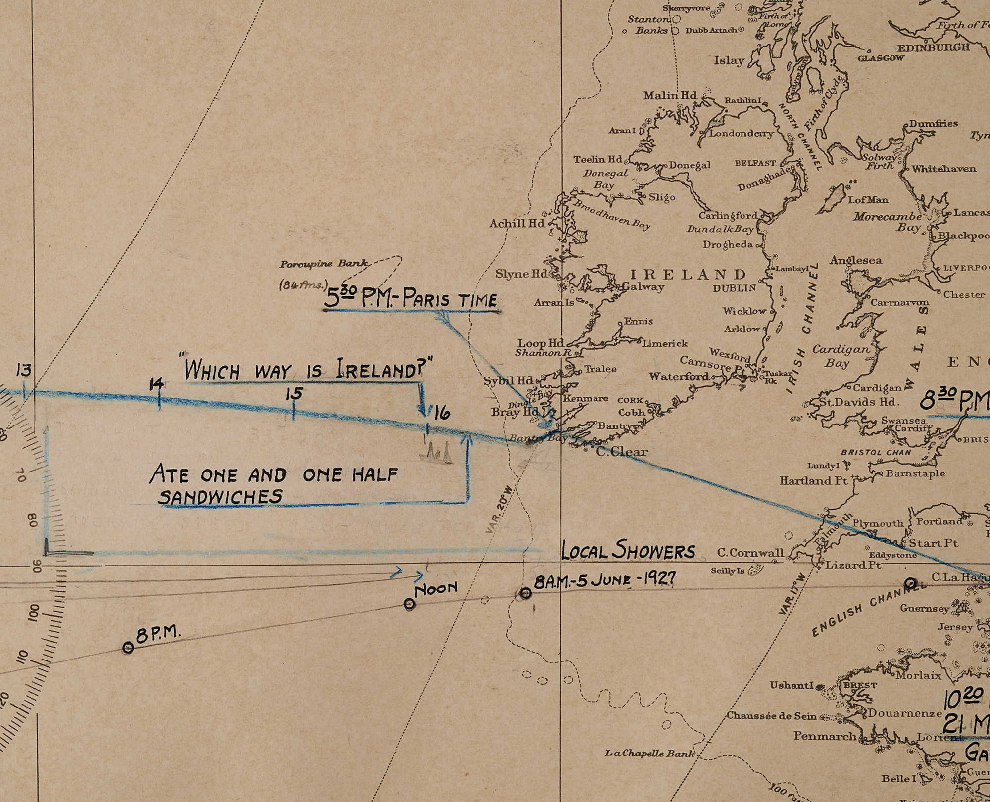 Lindbergh meets the rising sun at 1:15 A.M., as he is about midway across the ocean. "Daylight…Fog, altitude 10 to 200 feet—occasional 1,500 feet. Hazy-overcast." Nearing land, Lindbergh grows concerned about his navigation due to fog and fatigue; spotting some fishing boats, he descends to a low altitude to ask for directions, hoping to yell, "Which way is Ireland?," but he sees no fishermen to ask. As it turns out, he was over two hours ahead of schedule and less than three miles off course. He eats "one and one half sandwiches" off the Irish coast, passes over Cornwall, and flies above the coastal French town of Cherbourg as the sun sets at "8:30 P.M. Paris Time." At "10:20 P.M, 21 May, Paris Time," Lindbergh reaches his destination—with 85 gallons of gas to spare.