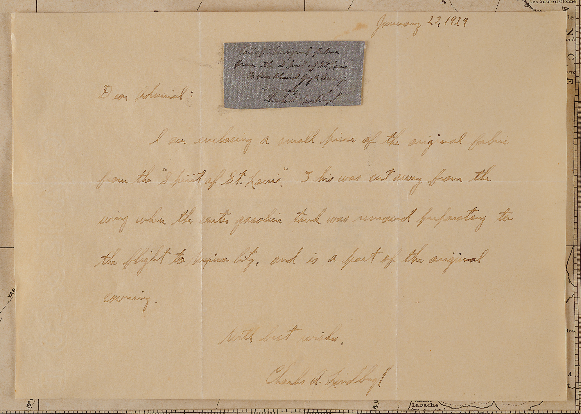 At the lower right is an ALS signed "Charles A. Lindbergh," January 23, 1929, in full: "I am enclosing a small piece of the original fabric from the 'Spirit of St. Louis.' This was cut away from the wing when the center gasoline tank was removed preparatory to the flight to Mexico City, and is a part of the original covering," with the silvery two-inch swatch affixed above, also identified and signed by the aviator: "Part of the original fabric from the 'Spirit of St. Louis,' to Rear Admiral Guy H. Burrage, Sincerely, Charles A. Lindbergh." In fine condition.