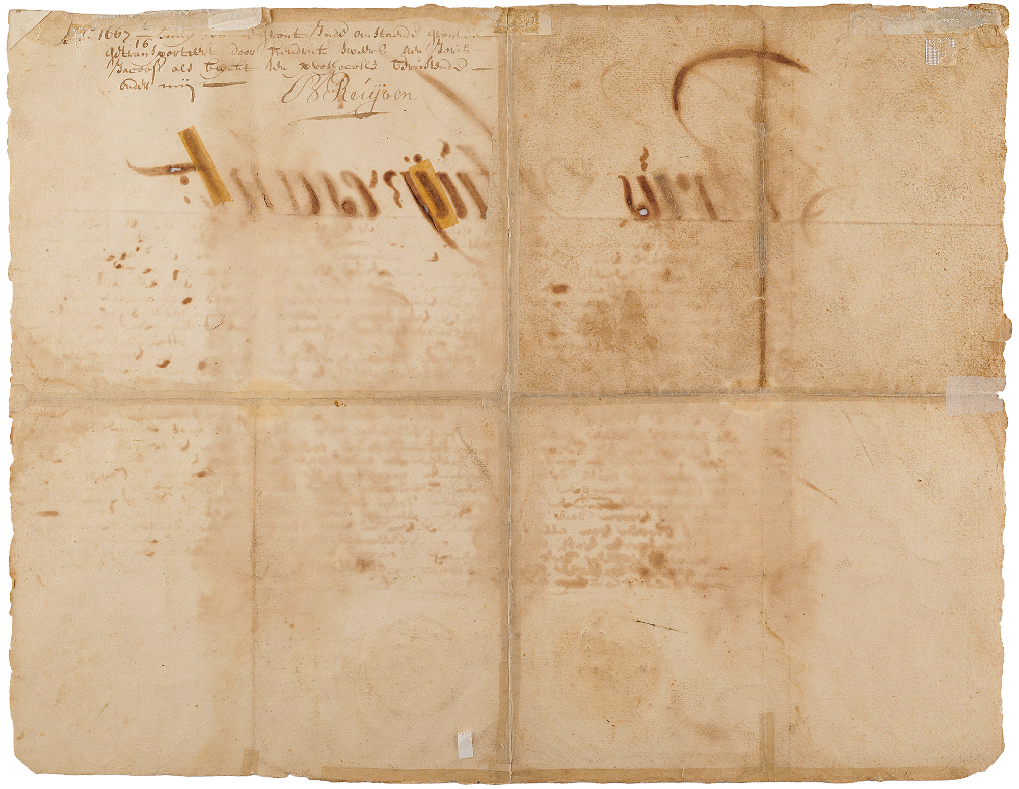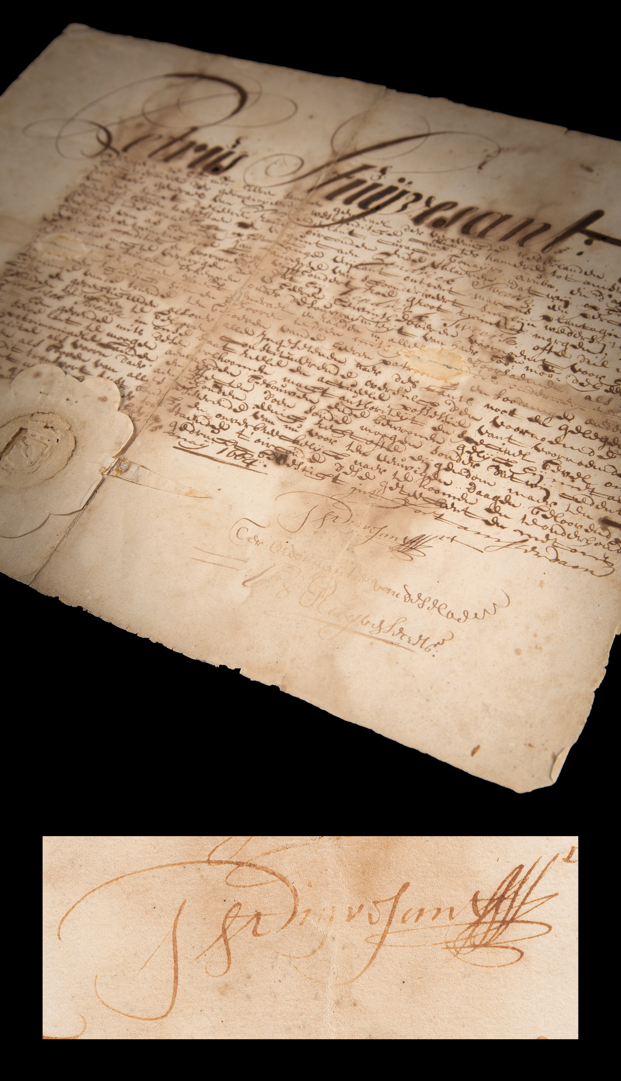 Last Dutch Director-General of the colony of New Netherland (1612–1672) who was a major figure in the early history of New York City. Manuscript DS in Dutch, signed “P. Stuyvesant,” one page, 16.75 x 13, May 15, 1664. Document with an impressive calligraphic header, "Petrus Stuyvesant," issued at "Fort Amsterdam," confirming a grant of land to Hendrick Sweerse on Long Island. Prominently signed at the conclusion in ink by Peter Stuyvesant as Director-General of New Netherland. The embossed paper seal affixed at the lower left remains largely intact. In good to very good condition, with professional repairs to separations of the intersecting folds, areas of ink erosion, and dampstaining (touching the signature). A sought-after example of a rare colonial autograph.