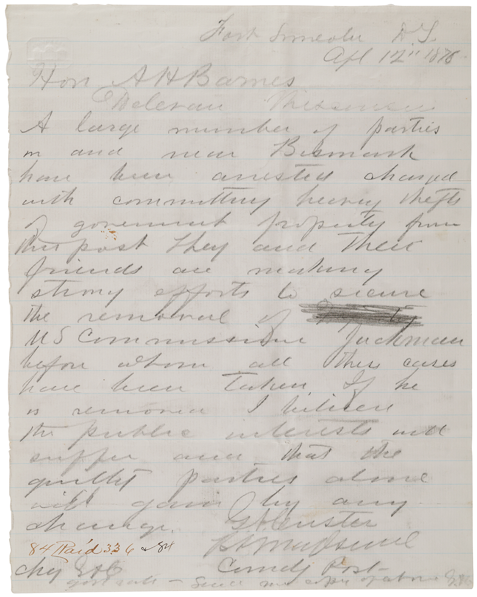 ALS in pencil, signed “G. A. Custer,” one page, 7.75 x 9.75, April 12, 1876. Handwritten draft of a telegram to "Hon. A. H. Barnes," sent from "Fort Lincoln, D.T.," two months before Custer's death at the Little Bighorn. In part: "A large number of parties in and near Bismarck have been arrested and charged with committing…thefts of government property from the post. They and their friends are making strong efforts to secure the removal of U.S. Commissioner Jackman before whom all these cases have been taken. If he is removed I believe the public interests will suffer and that the guilty parties alone will gain by any change." Signed at the conclusion by Custer as commander of the post, and initialed twice, "G.A.C.," in the lower corners, authorizing a charge at "gov't rate" and requesting a copy of the message. In fine condition.