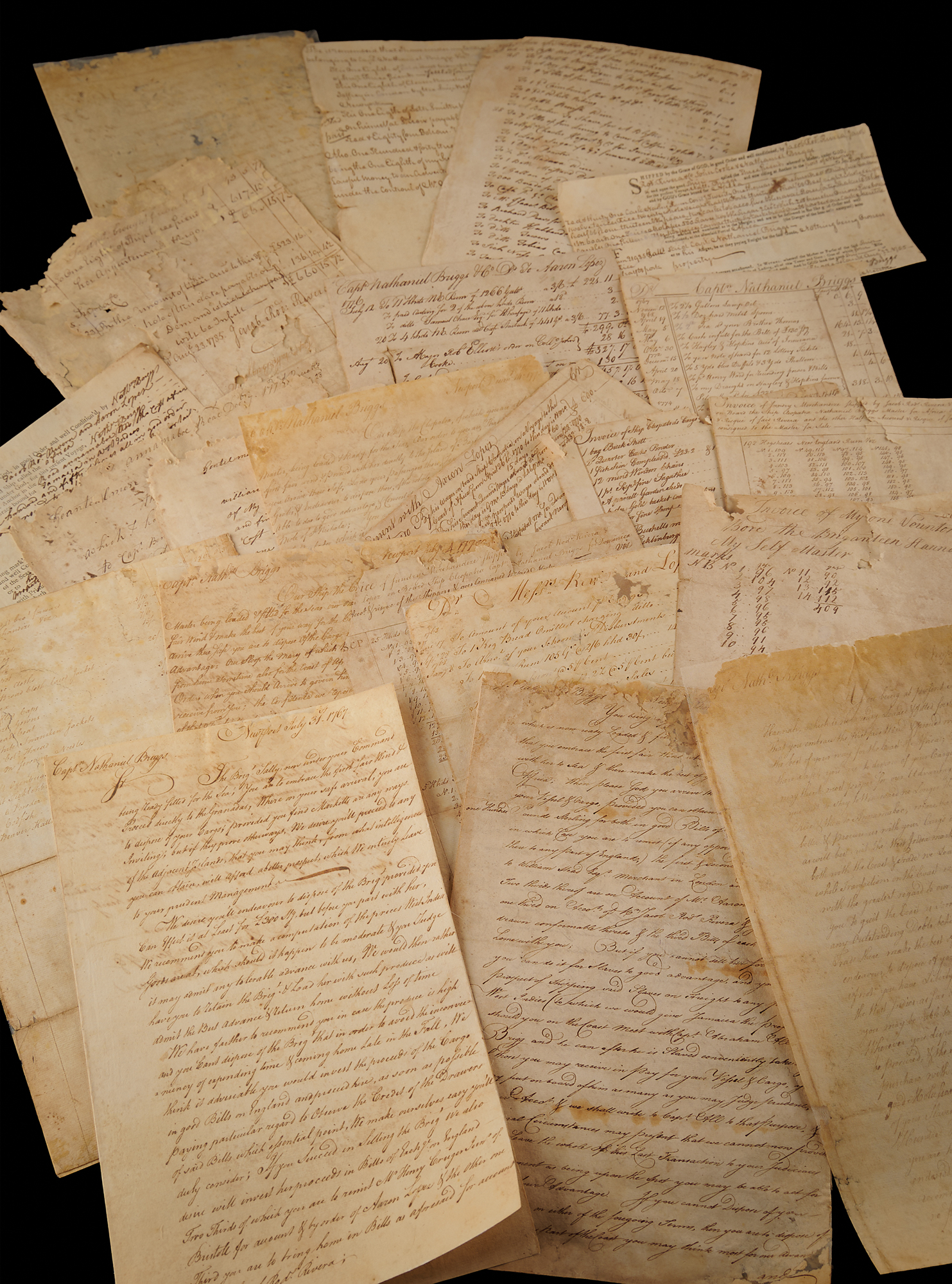 Remarkable archive documenting the triangular slave trade that was financed with British capital and operated by the important and successful Rhode Island merchants, Aaron Lopez and Jacob Rodrigues Rivera, spanning the period of the development and peak of their business through their deaths. The collection comprises 22 letters and documents dated from July 22, 1765–July 14, 1791, totaling over 40 pages, most signed by Lopez, Rivera, or their captain, Nathaniel Briggs.