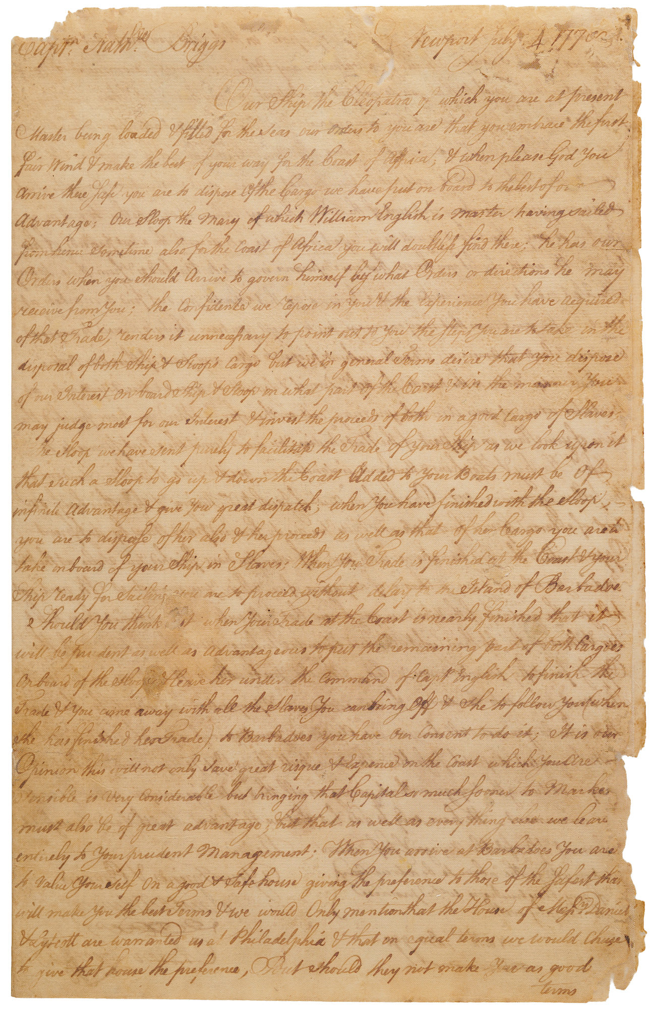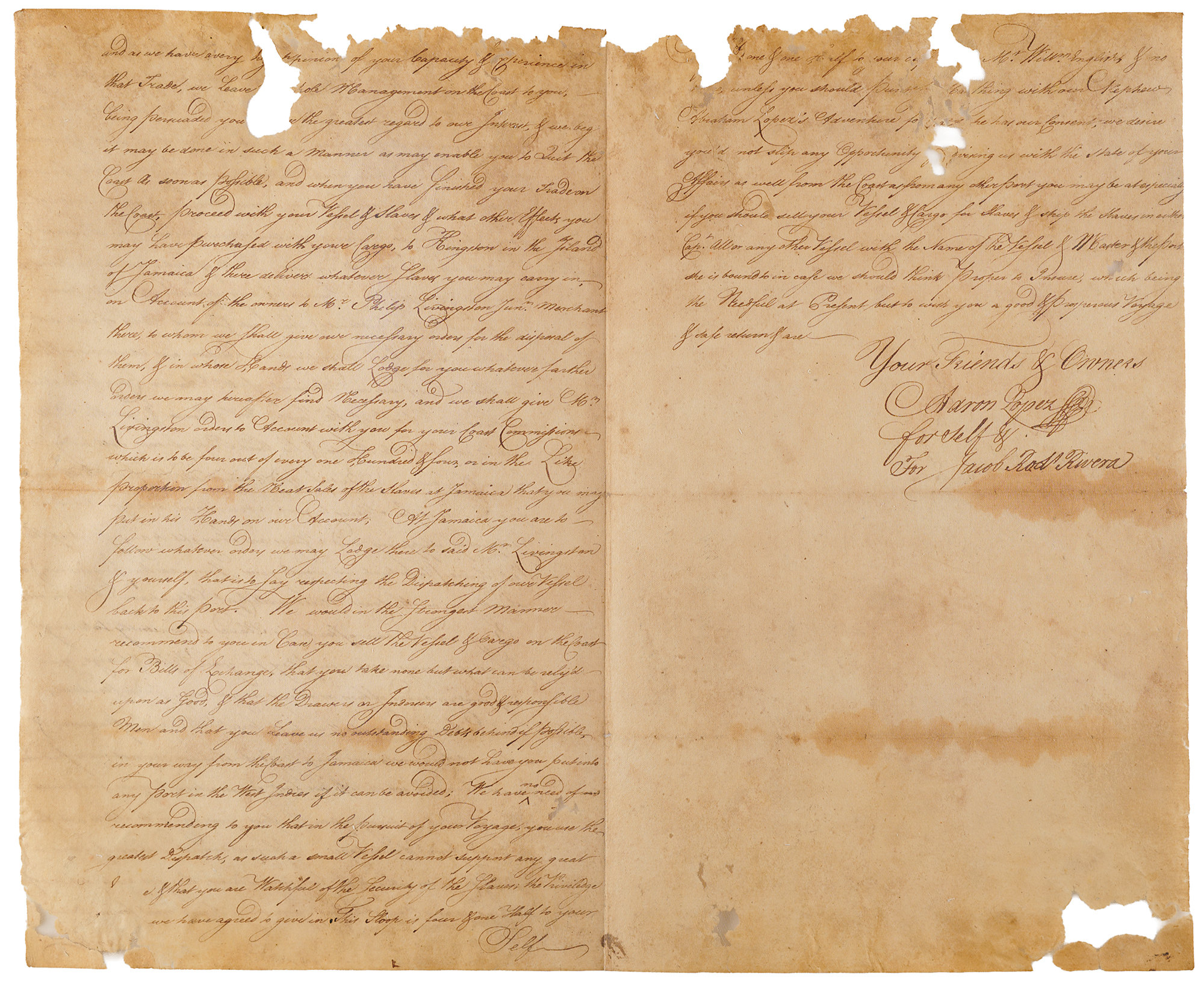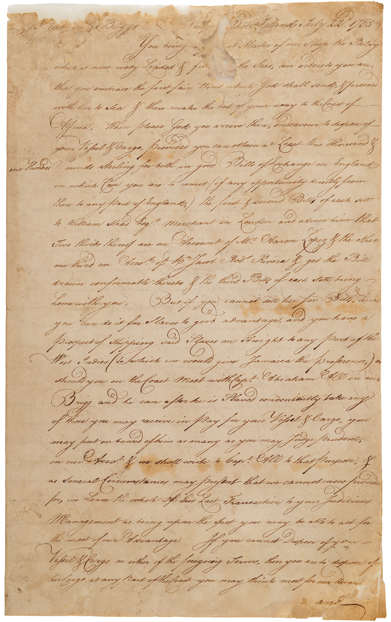 1. LS signed "Aaron Lopez for Self & For Jacob Rod's Rivera," three pages on two adjoining sheets, July 22, 1765, to Captain Nathaniel Briggs. In part: "You being…Master of our Sloop the Betsey…make the best of your way to the Coast of Africa. When please God you arrive there, endeavour to dispose of your Vessel & Cargo, provided you can obtain at Least One Thousand & one Hundred Pounds Sterling…But if you cannot sell her for Bills, and you can do it for Slaves to good advantage, and you have a prospect of shipping said Slaves on Freight to any part of the West Indies…when you have finished your Trade on the Coast, proceed with your Vessel & Slaves…to Kingston in the Island of Jamaica & there deliver whatever Slaves you may carry in on Account of the owners to Mr. Philip Livingston Junr. merchant there, to whom we shall give our necessary orders for the disposal of them…and we shall give Mr. Livingston orders to Account with you…from the Neat Sales of the Slaves at Jamaica that you may put in his Hands on our Account…We would in the strongest manner recommend to you…that you are Watchful of the security of the Slaves."