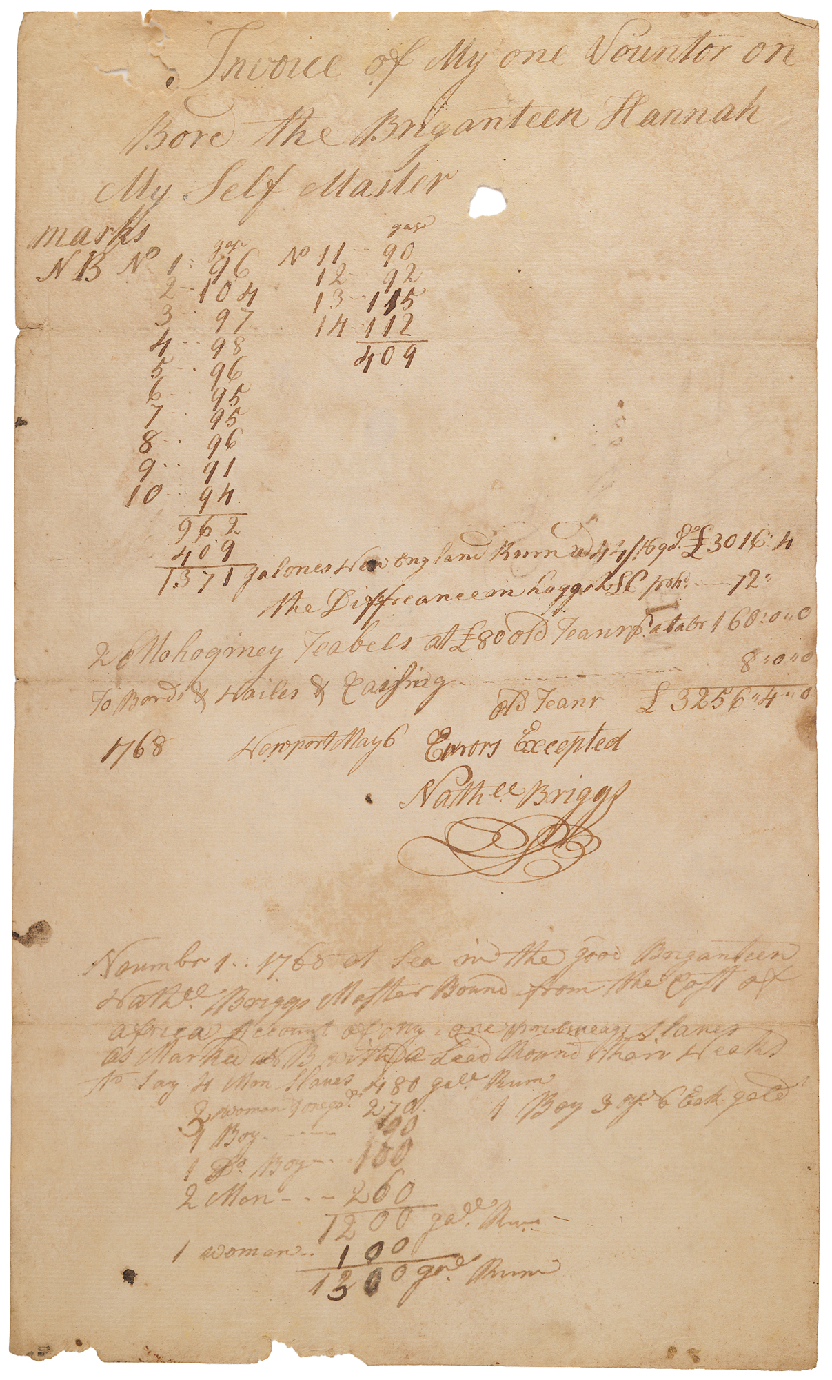 4. ADS signed "Nath'l Briggs," one page, May–November 1768, headed "Invoice of My one Veuntor on Bore the Briganteen Hannah, My Self Master." In November, Briggs indicates that he is "bound from the Coast of Africa…account of my slaves as marked," listing men, women, and boys, as well as 1300 gallons of rum.