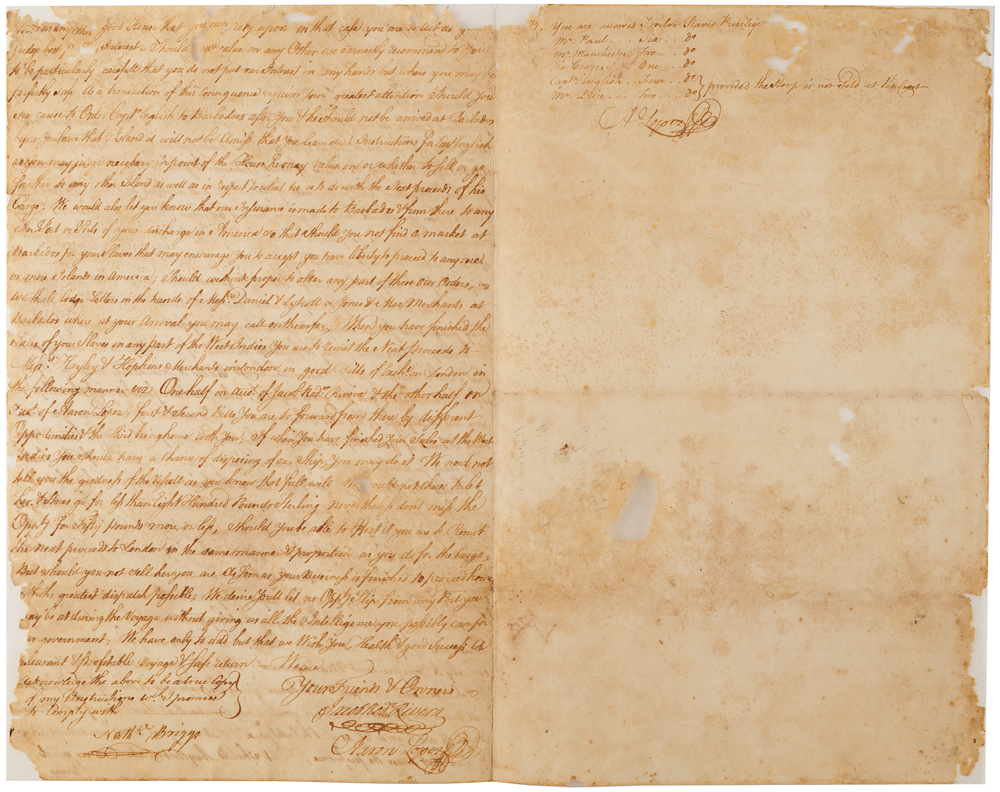 7. LS signed "Jacob Rod's Rivera" and "Aaron Lopez," three pages on two adjoining sheets, July 4, 1770, to Captain Nathaniel Briggs, carrying instructions for the sale in Africa of the sloop Cleopatra and its cargo, in exchange for slaves to be later sold in the West Indies. In part: "Make the best of your way for the Coast of Africa…dispose of our Interest…in the manner You may judge most for our Interest & invest the proceeds of both in a good Cargo of Slaves…come away with all the Slaves You can bring off…should you not find a market at Barbados for your Slaves that may encourage you to accept you have liberty to proceed to any one or more Islands…When you have finished the Sales of your Slaves in an y part of the West Indies you are to remit…proceeds to Messrs. Hayley & Hopkins Merchants in London in good Bills of Exch'e." In a postscript signed by Lopez, he adds: "You are allowed Twelve Slaves Privilege, Mr. Paul—Six, Mr. Manchester—Two, The Cooper—One, Capt'n English—Four, Mr. Price—Two—provided the Sloop is not sold at the Coast."